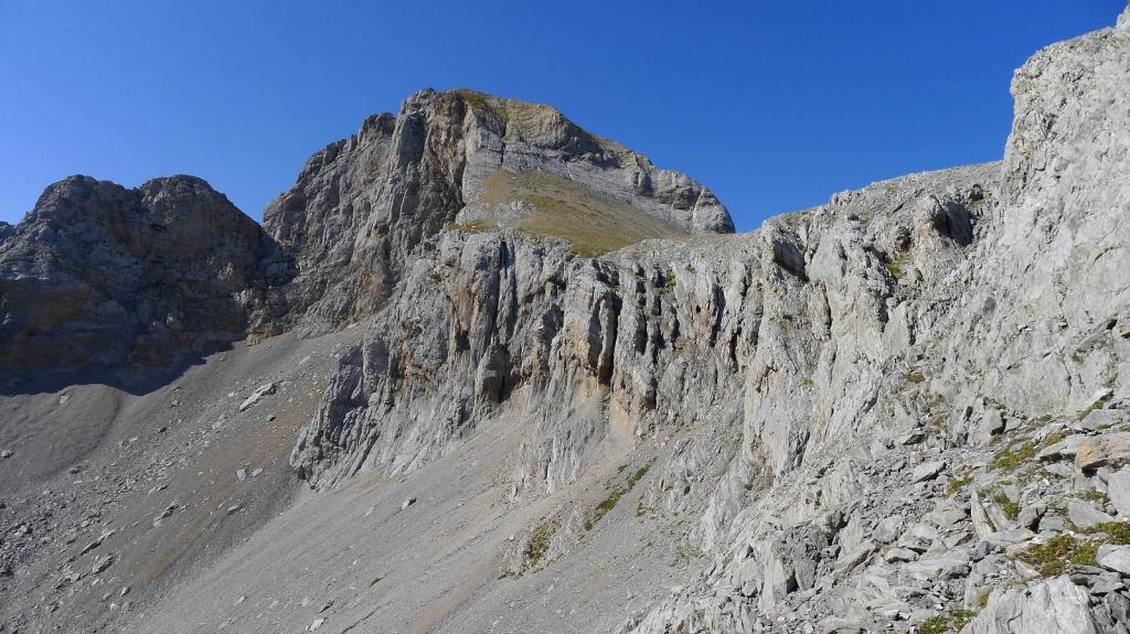 Me toca bajar al collado de Acherito (2175m 2h23′). Enfrente está la pared norte del Mallo, infranqueable. Hay que doblar el espolón rocoso de la derecha y subir por detrás. De momento me voy acercando por lomos herbosos, con algún hito, hasta que se dibuja un claro camino que flanquea hacia la pared del Mallo, pasa bajo el espolón rocoso y gira a la izquierda. Allí encuentro también una ladera de bastante verticalidad, pero de roca muy rota y descompuesta por donde habrá que ir buscando la ruta de ascenso. Hay una traza difusa y algún hito. De vez en cuando hay que echar las manos, pero si se sigue el buen camino, con un poco de cuidado, se supera sin escalar.
