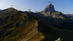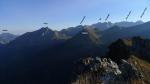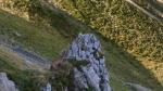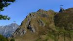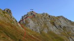 Afronto el Lavigne; hay una traza de senda clara, primero a la derecha de la cresta, por hierba; luego pasa a la izquierda y después supera la cresta para ir de nuevo a la derecha y se mete por una chimenea fácil; pasa por debajo de un arbolillo colgado en la roca y, finalmente, hay una chimenea a la izquierda en la pared que exige una trepada (I+) por buena roca que ya da acceso a la cima (pic Lavigne 2018m 1h18′). Las paredes norte y oeste del pico son vertiginosas.