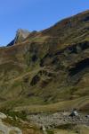 Para bajar tengo que retroceder un poco al punto entre la 1ª punta y la central y, desde allí, descender por traza de huella bastante vertical. Poco a poco se suaviza y pasa de zona rocosa a herbosa y ya, con bastante buena senda, al col de Suzon (2131m 3h57′). Un camino muy transitado me lleva de vuelta por el valle de Magnabaigt, pasando por la bifurcación a la cabaña (1680m 4h32′) y terminando en Bious-Artigues (1417m 4h55′)