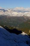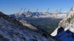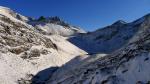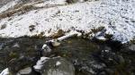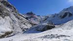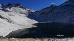 Se sube junto al barranco que baja del ibón de Catieras y se gira a la derecha para ascender por unas suaves lomas. Los palos con pintura violeta ayudan a seguir el camino cubierto de nieve. Después se gira a la izquierda pasando un espolón rocoso y continúa una travesía a media ladera que, finalmente, dobla un hombro un poco hacia la derecha y nos metemos en la cubeta del ibón de Catieras (2250m 2h59′), precioso con todas las montañas recién nevadas a su alrededor. Aquí veo que me quedan otros 500m de desnivel para el primer pico, el pico Catieras, por terreno de roca y nieve que se empina y que decido dejar para otra ocasión.