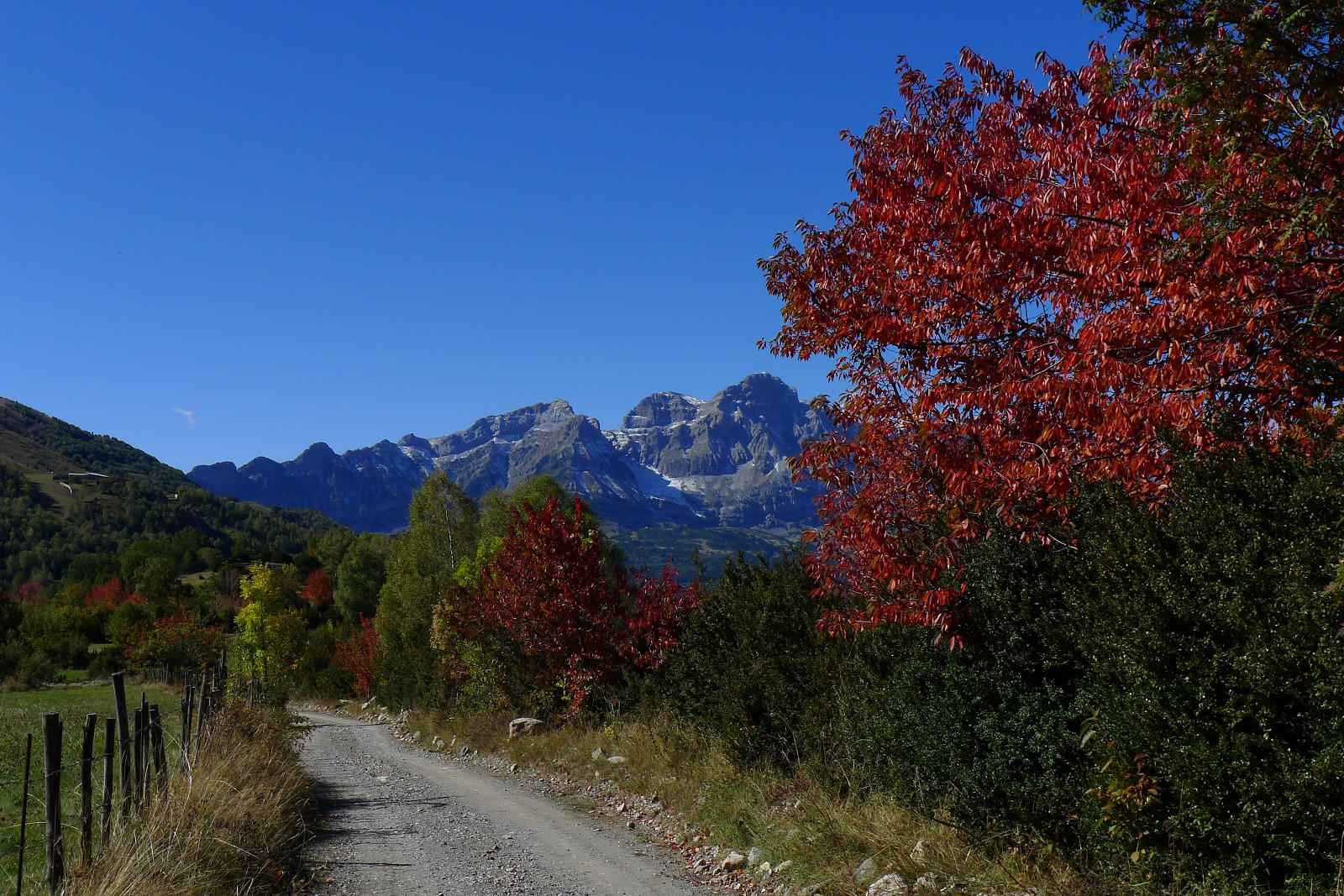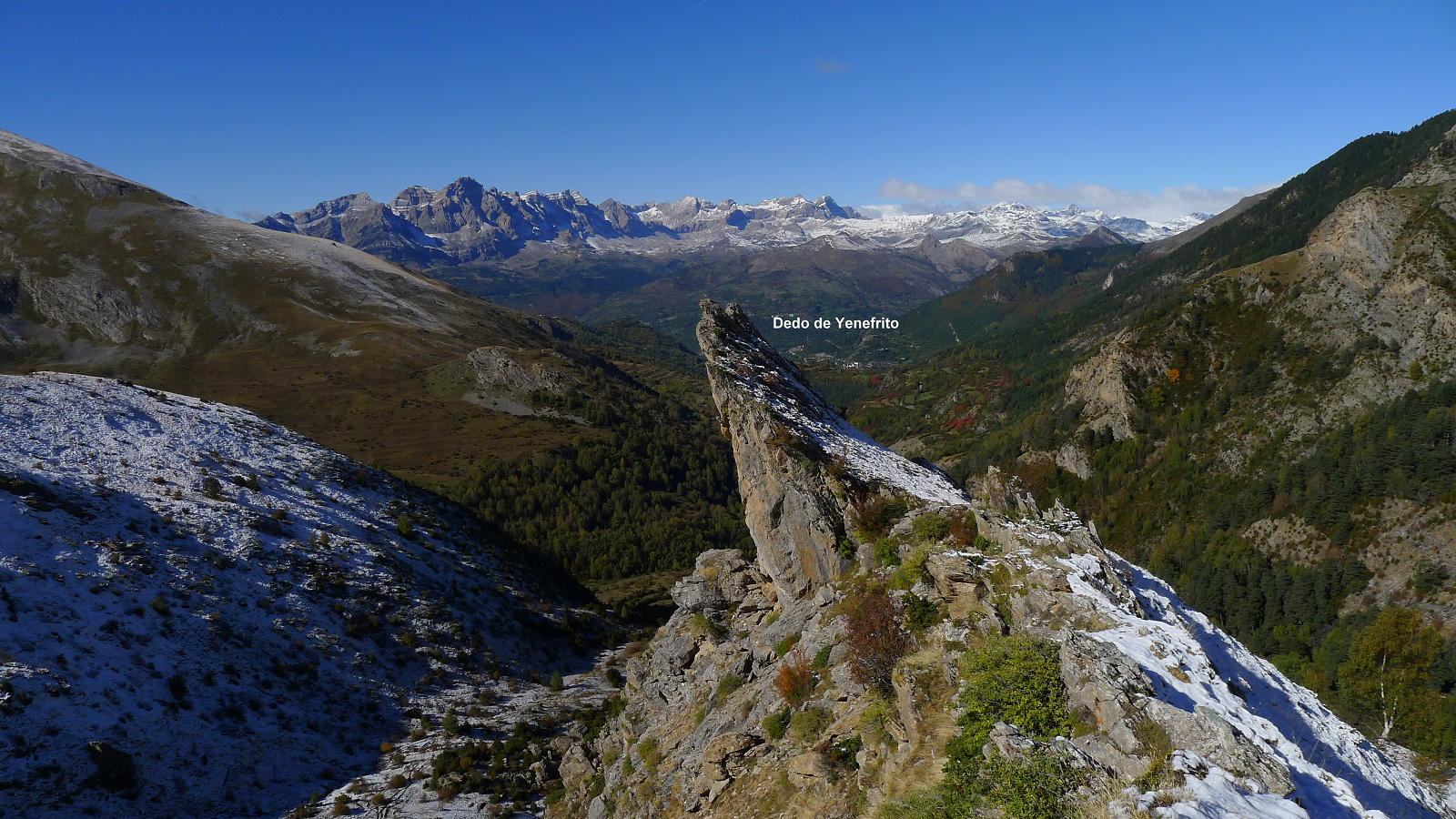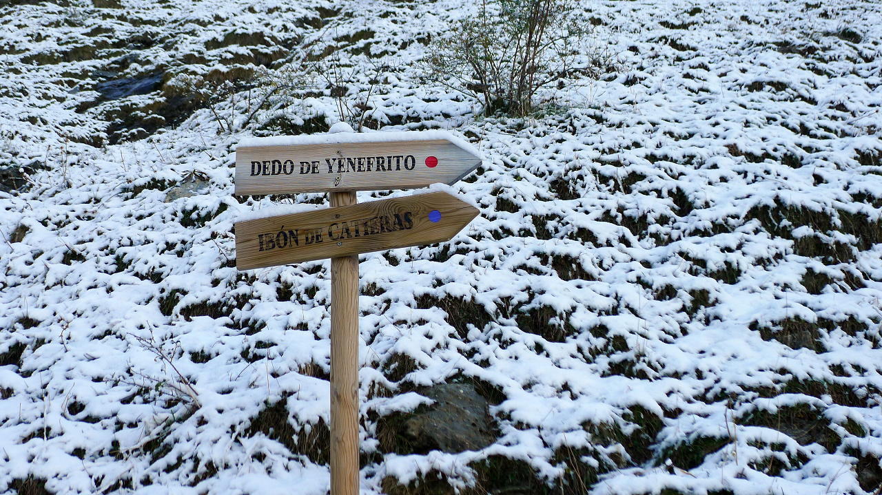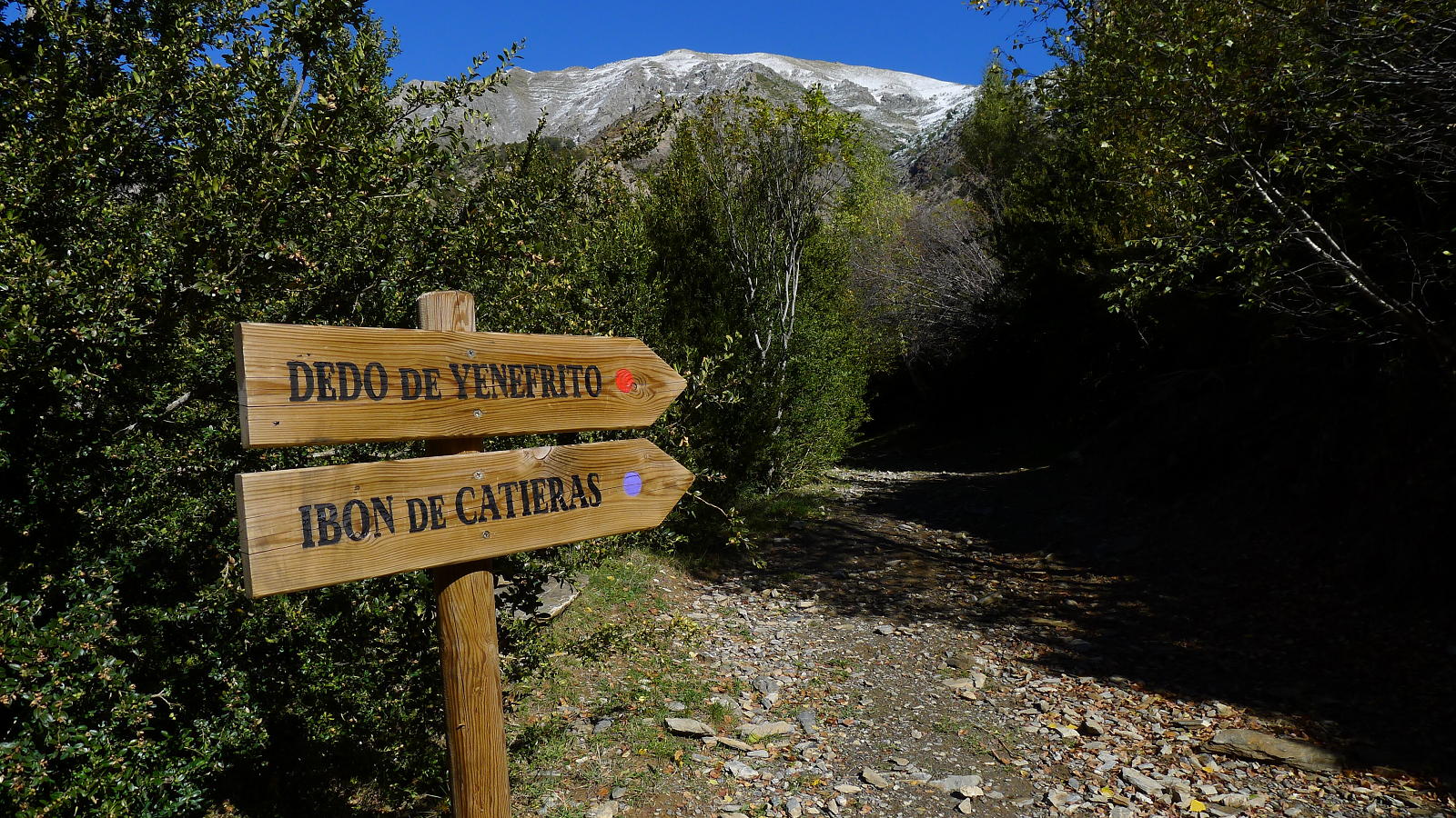 Hay que recorrer esta larga pista por 4km sobre la orilla derecha del río Bolatica. Se cruza el barranco Laulot por un puente (1470m 0h52′) y enseguida sale una senda a la izquierda (hito) (a la bajada llego a la pista un poquito más arriba, donde hay carteles de madera que indican «Dedo de Yenefrito», con marca roja, e «ibón de Catieras», con marca violeta). La senda al principio es un poco confusa, pero luego ya es muy clara y asciende al Cuello de Yenefrito (1790m 1h32′) siguiendo hitos y postes con pintura roja y violeta.