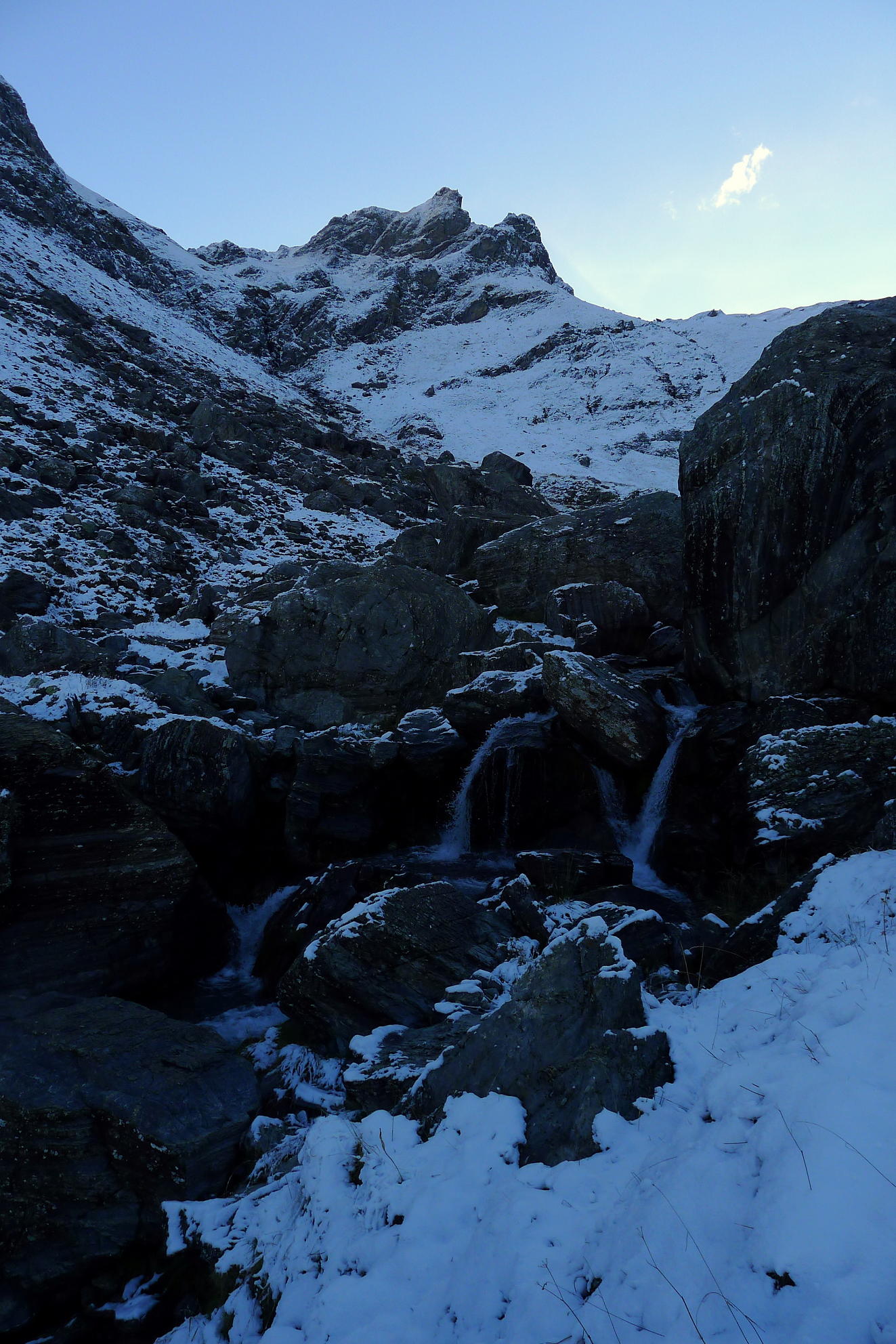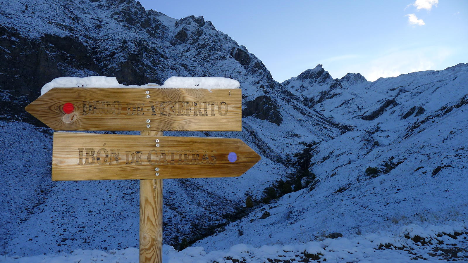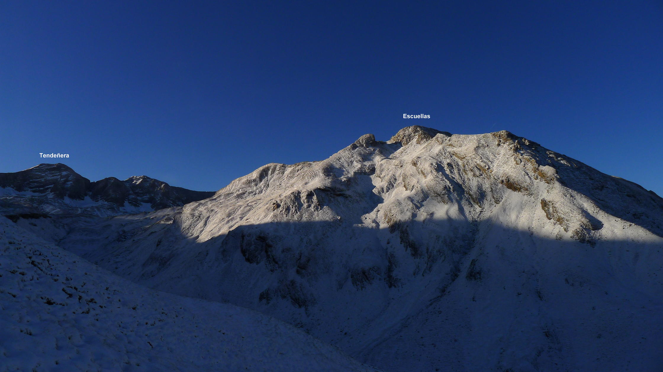 Con la intención de subir los picos Baldairán y Catieras, que fueron los primeros que subí con mi amigo Josan, tengo que reducir mis expectativas y quedarme en el ibón de Catieras, ya que es una ruta muy larga y, con la nieve que ha caído, la progresión es más lenta de lo esperado. Aún así disfruto de un día esplendoroso; anoche estuvo nevando y, como salgo antes de amanecer, disfruto de ser el primero pisando la nieve virgen en este día frío y soleado.