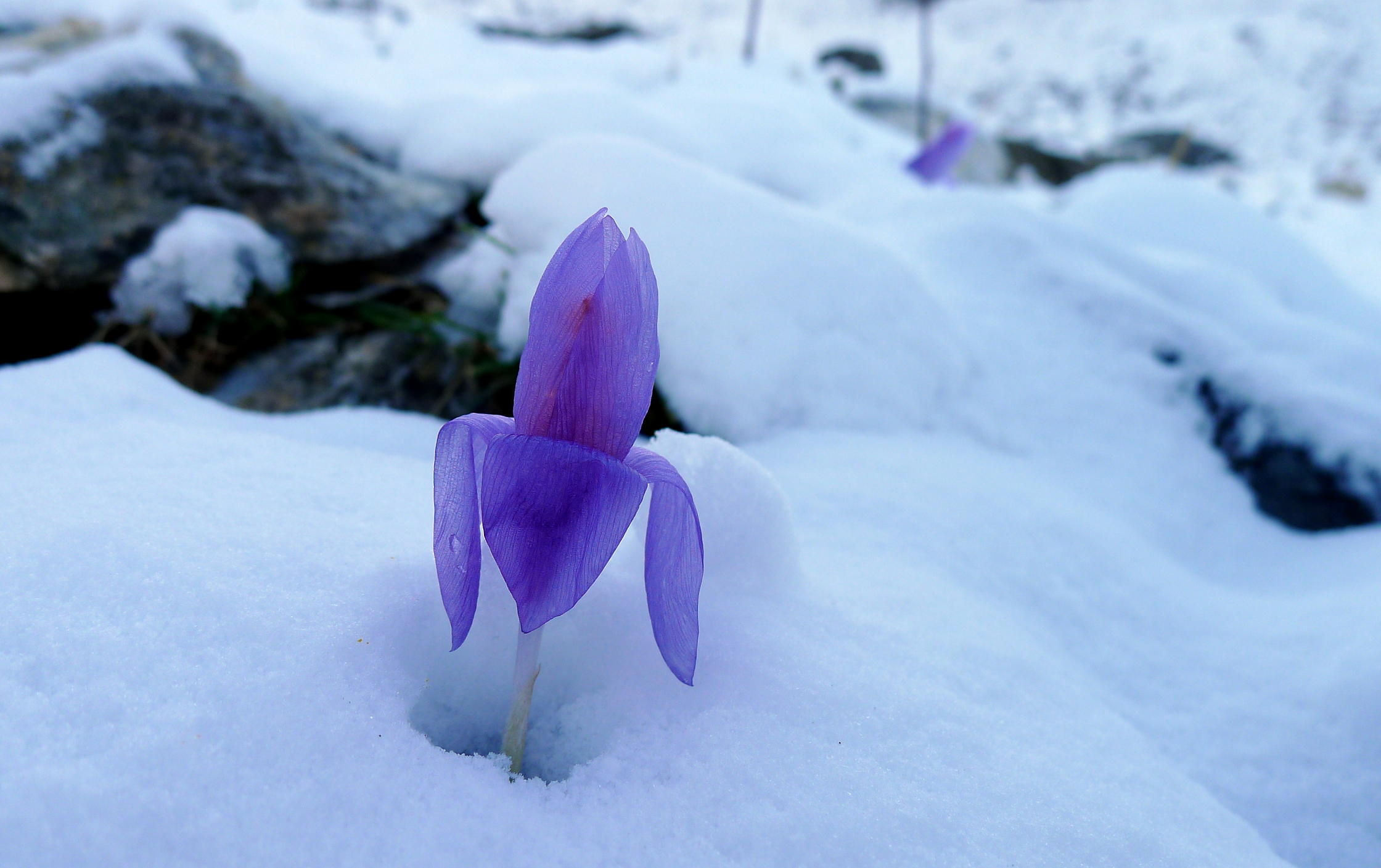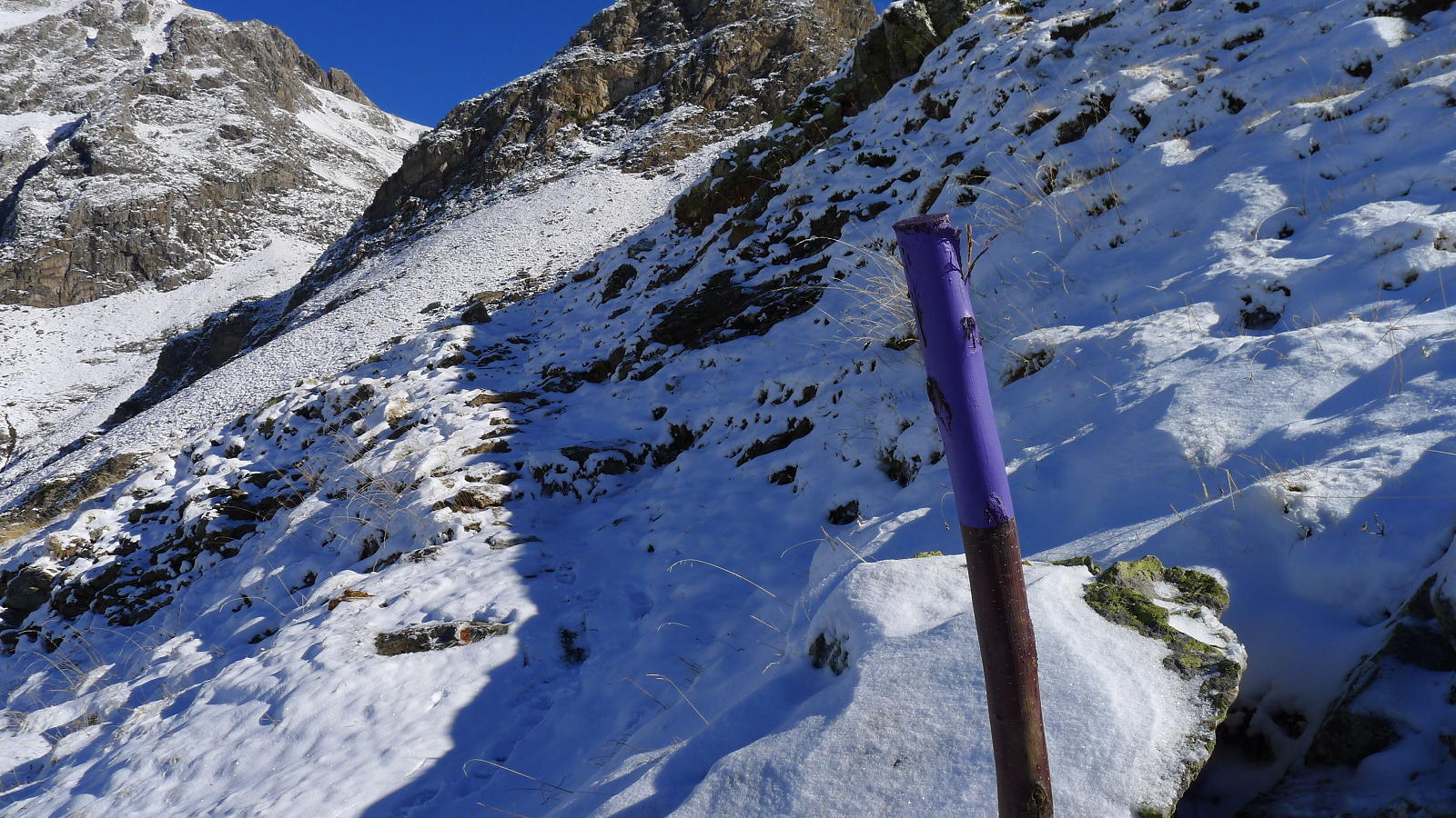 Se sube junto al barranco que baja del ibón de Catieras y se gira a la derecha para ascender por unas suaves lomas. Los palos con pintura violeta ayudan a seguir el camino cubierto de nieve. Después se gira a la izquierda pasando un espolón rocoso y continúa una travesía a media ladera que, finalmente, dobla un hombro un poco hacia la derecha y me introduce en la cubeta del ibón de Catieras (2250m 2h59′), precioso con todas las montañas recién nevadas a su alrededor. Aquí veo que me quedan otros 500m de desnivel para el primer pico, el pico Catieras, por terreno de roca y nieve que se empina y que decido dejar para otra ocasión.