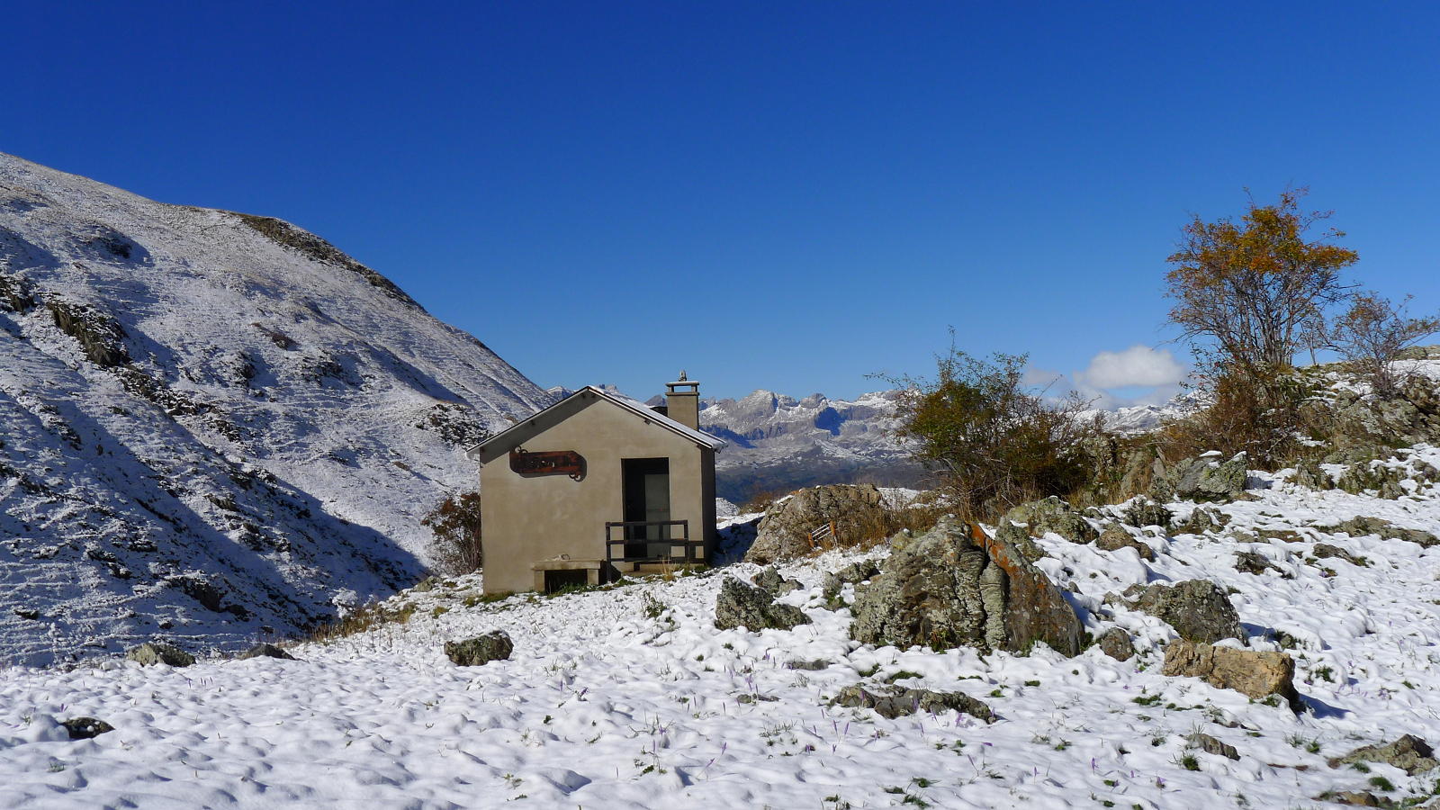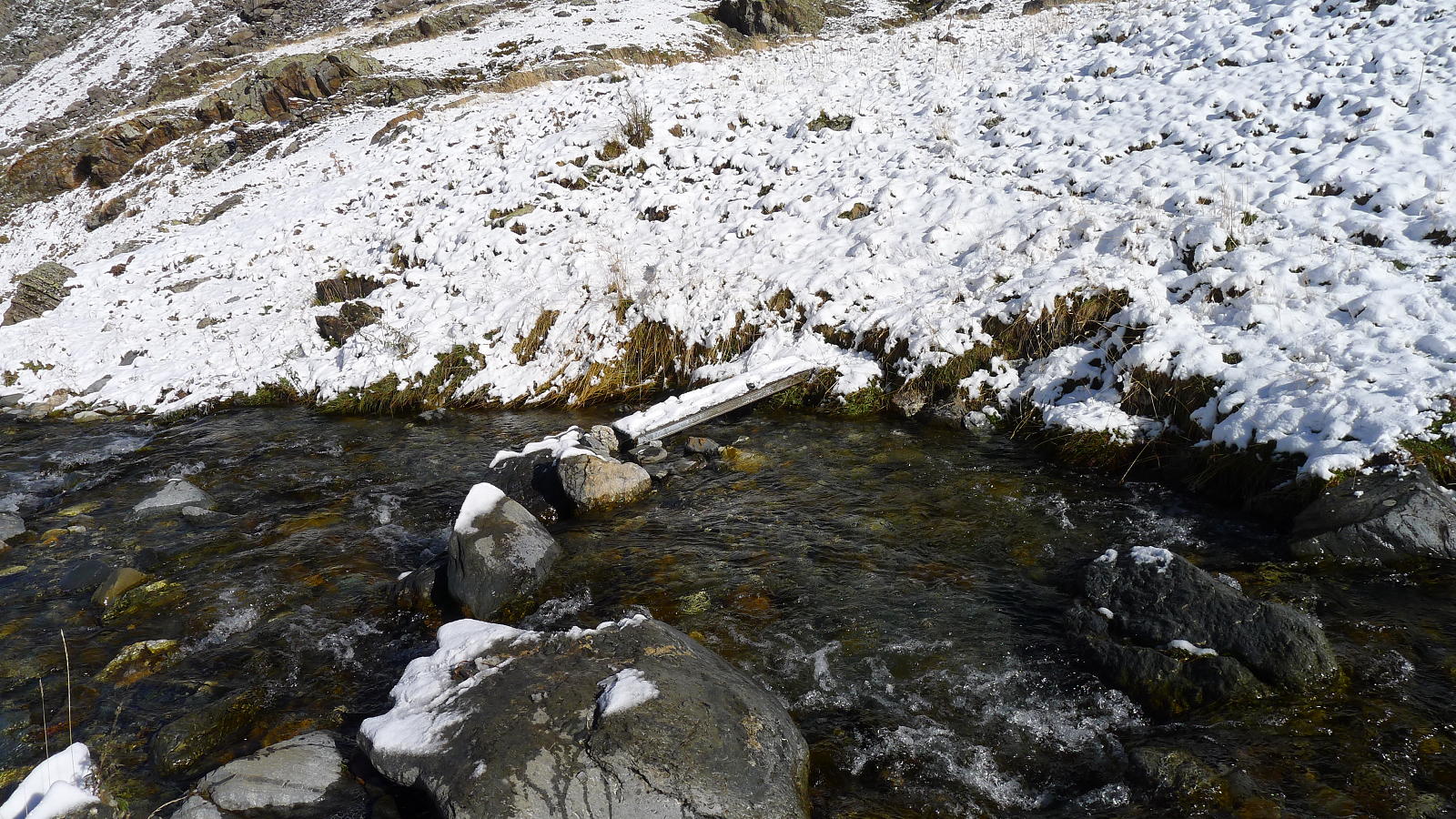 Desde el Cuello sigo la senda al ibón de Catieras y los postes ya solo tienen pintura violeta. Paso bajo el refugio de Yenefrito (1843m), que está en un alto a mi izquierda y no lo veo a la subida, aunque a la bajada entraré para comprobar que, aunque pequeño, está en buen estado. Más arriba se gira a la izquierda y cruzo el barranco Lalulot (1903m 2h02′). Hay que pasar sobre unas piedras y luego hay una pequeña palanca metálica desde la última piedra hasta la otra orilla. Las piedras están muy resbaladizas, así que no dudo en en meter la bota en el agua, que no es muy profunda.