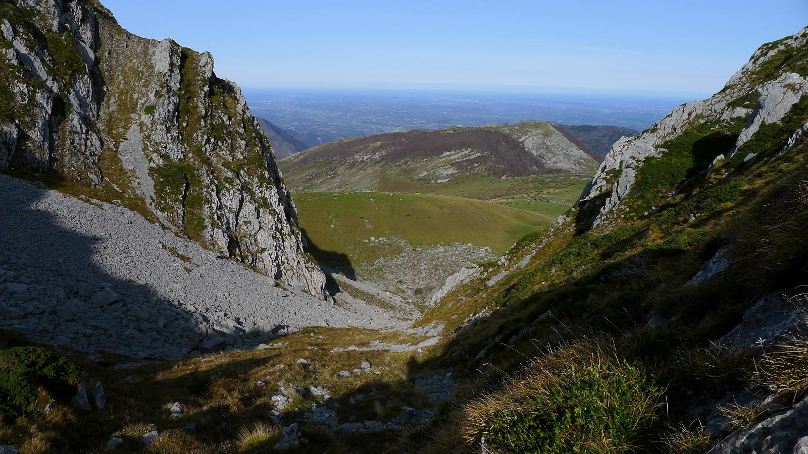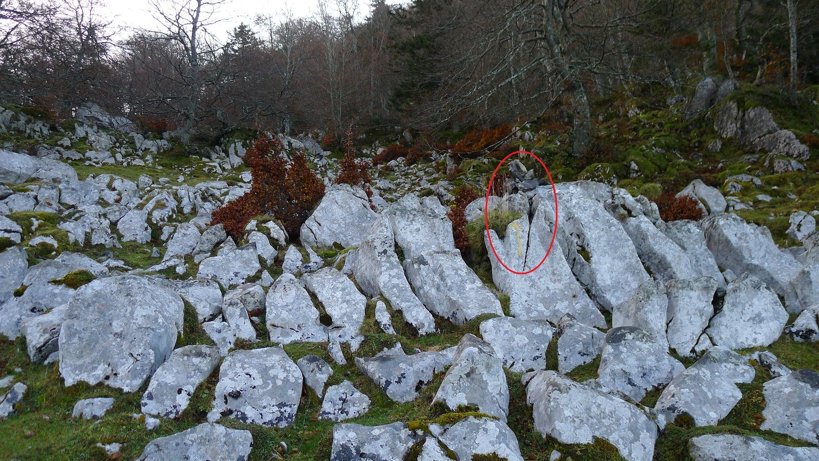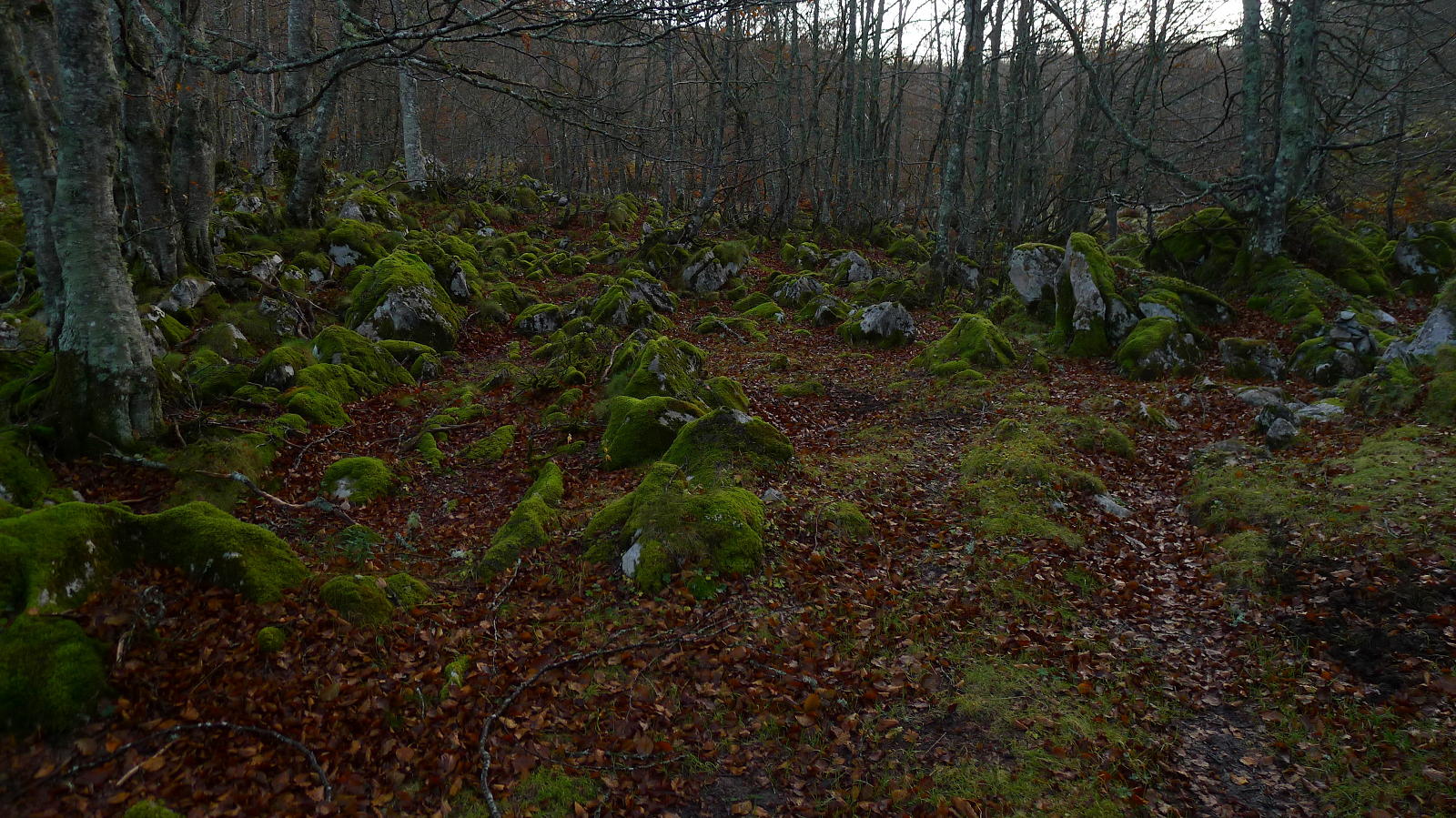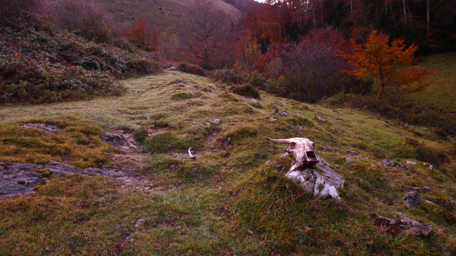 Se avanza por el fondo de este amplio y llano valle. Al pasar un abrevadero (1385m 1h03′) tengo que ir a la derecha y buscar la entrada al bosque marcado por un hito y una flecha amarilla. El sendero por el bosque es confuso, pero hay muchos hitos y también marcas de pintura amarilla, naranja o verde. La mayoría de los árboles son hayas jóvenes y me llama la atención que ya han perdido las hojas. Más arriba se gira bruscamente a la derecha (1525m 1h23′) y se sale del bosque por un estrechamiento entre rocas que se abre al valle de Jaout.