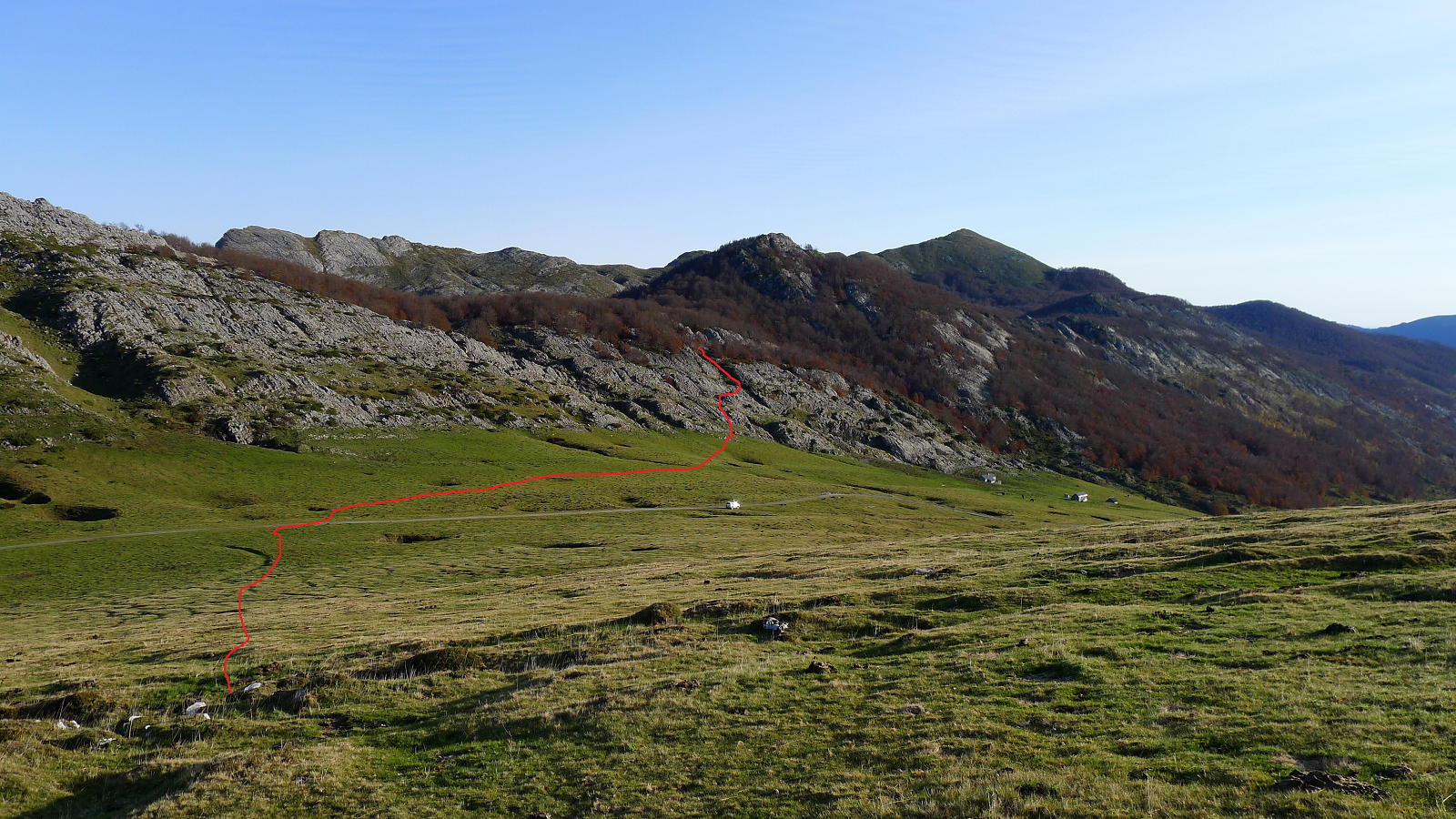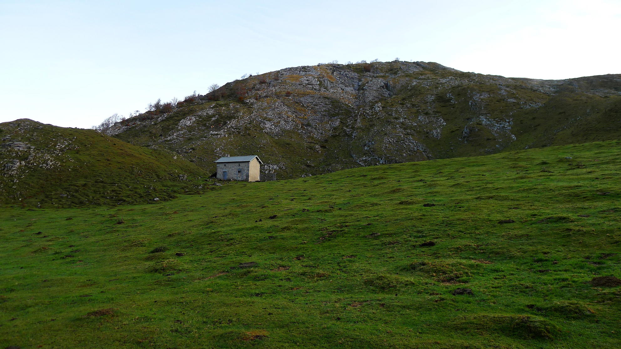 En el collado se gira a la derecha para bajar por una canal, pegado a la pared de la derecha por donde hay sendero, que se va metiendo en zona pedregosa y se desdibuja, pero sigo bajando por ladera de pasto muy fácil. Paso junto a las ruinas de una cabaña (1345m 4h28′) a mi izquierda, en una zona de afloramientos rocosos y tomo un fuerte descenso que desemboca en la pista (1300m 4h31′).
