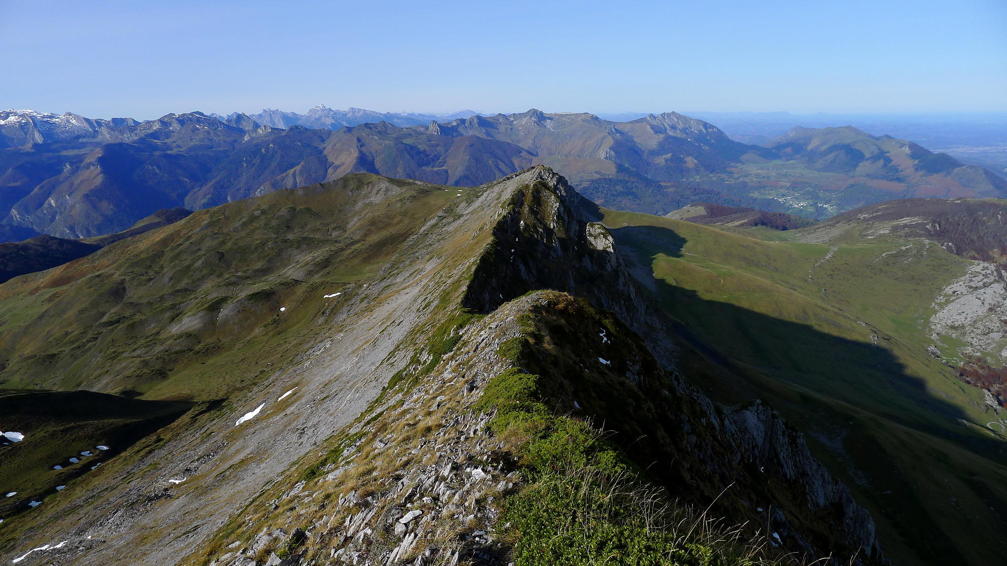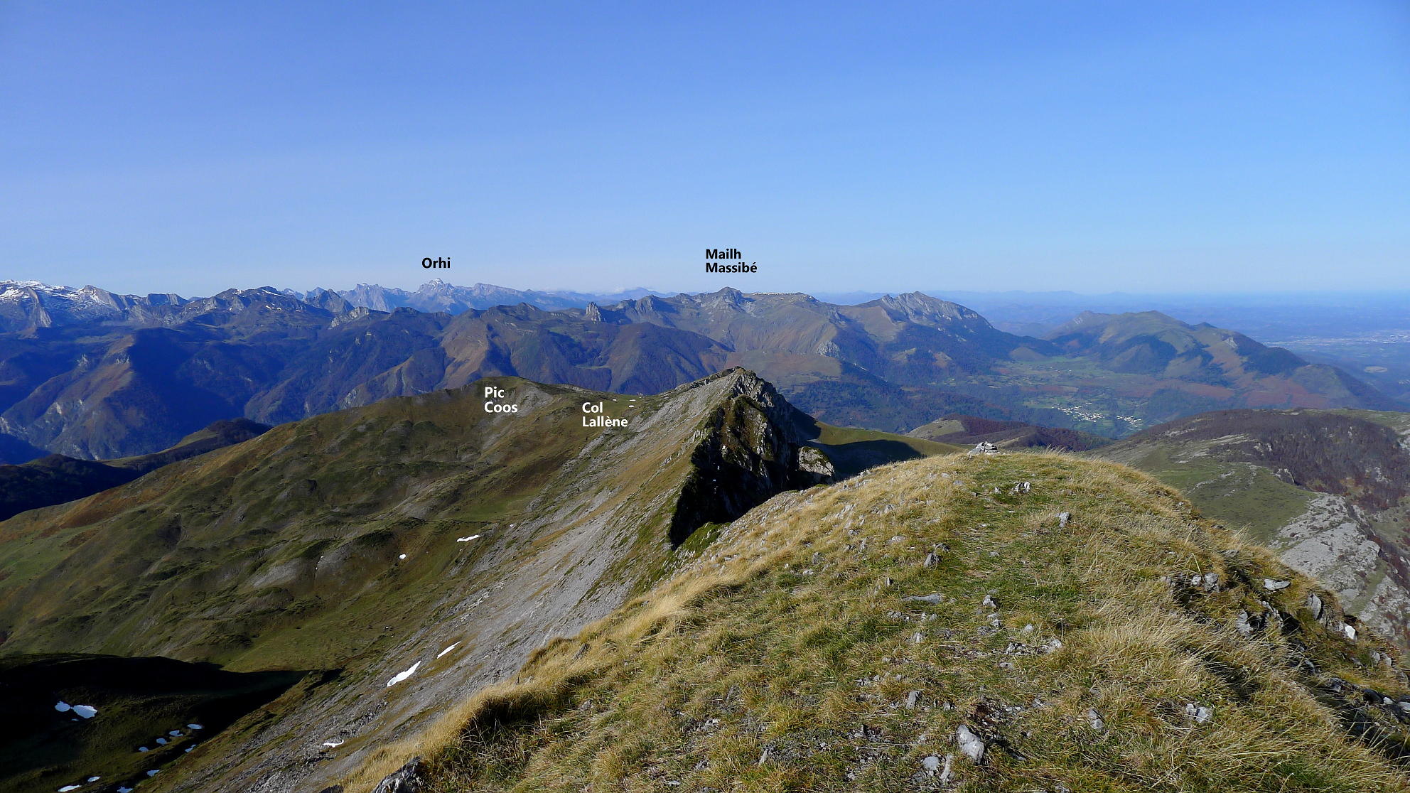 Para el descenso recorro toda la cresta de Coos hacia el oeste. Hay traza de sendero. Casi siempre a plena cresta o un poco por la izquierda (sur). Es fácil, aunque hay algún paso un poco aéreo. Corono una última cota (1920m 3h51′) y desciendo al col de Lallène (1840m 3h57′), donde encuentro a la primera persona desde que he salido.