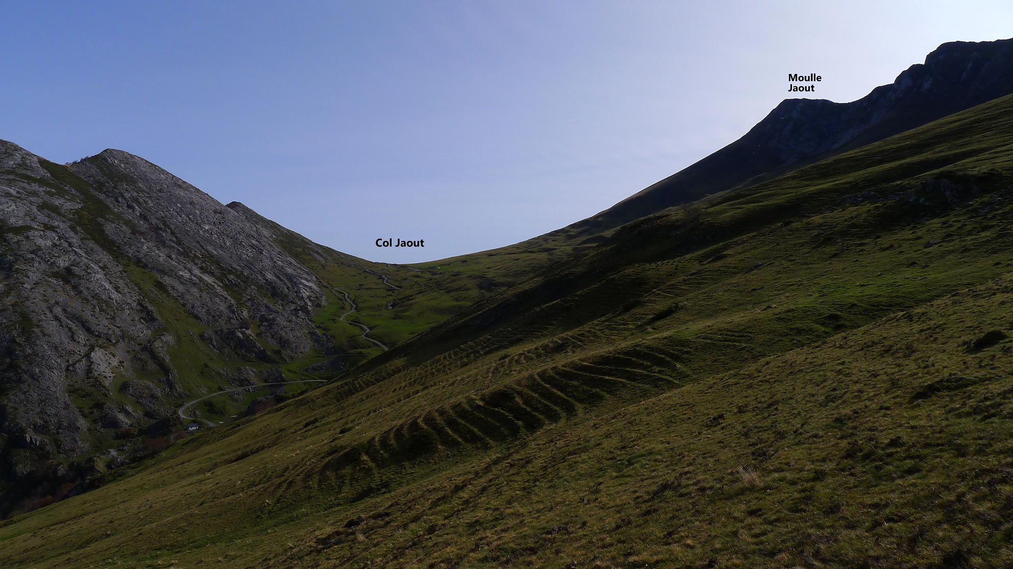 Hay que bajar hasta el amplio col de Jaout (1500m 1h38′). El Moulle Jaout parece cercano, pero quedan más de 500m de desnivel. Se asciende directo la ladera herbosa de fuerte pendiente junto a una valla de alambre con púas que tengo a mi derecha. Hay que graduar el esfuerzo. La valla se convierte en electrificada y la paso al otro lado reptando. Termina la valla (1905m 2h23′). Empieza una zona todavía con más pendiente y con arbustos de rododendro.