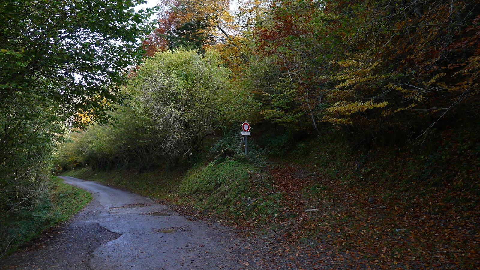Por suerte estas primeras enormes curvas se atajan por sendillas hasta llegar a una portilla (1235m 4h36′). A partir de aquí ya es todo el rato pista, aunque por un vallecito muy majo, en el que ya encuentro algún paseante y algún ciclista. Al final se introduce en el bosque para entroncar con la pista en el punto donde se iniciaba el camino (910m 5h00′)