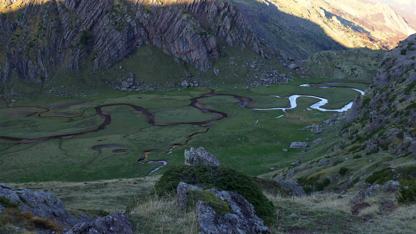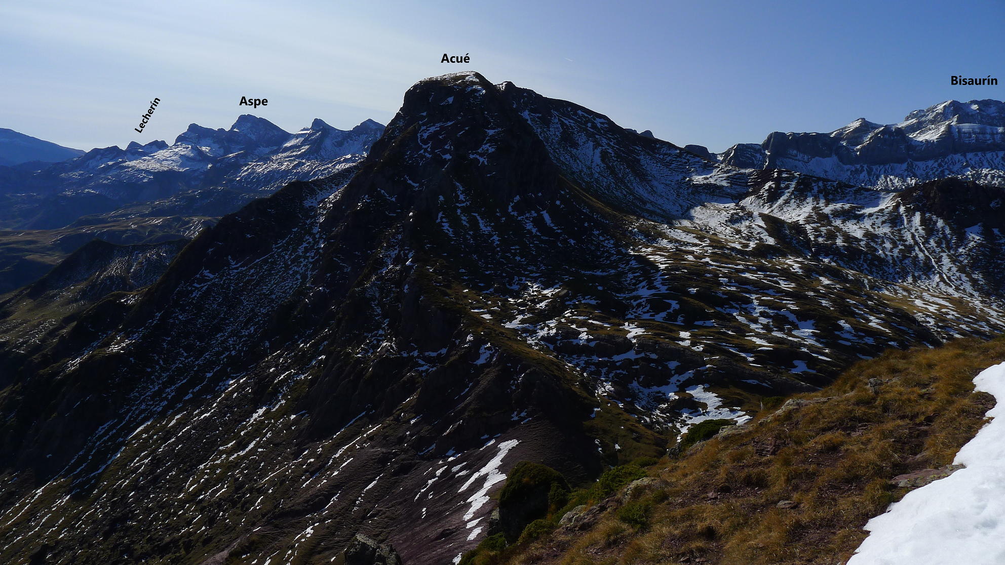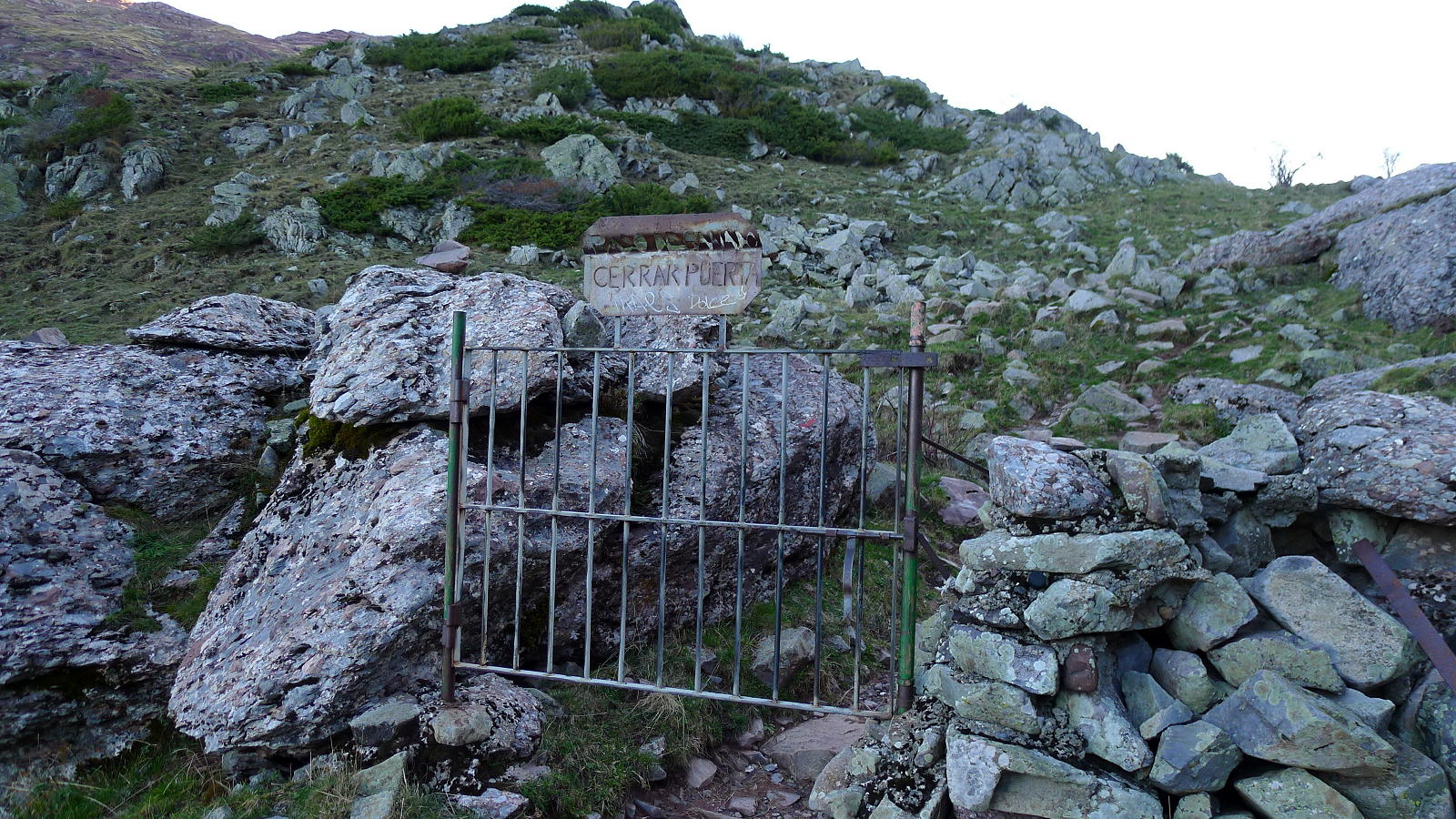 Continúo la cresta, que es una loma herbosa fácil, muy tendida por la vertiente sur, pero vertical sobre el refugio y lago de Arlet. Corono una cota (2191m 3h14′) y la cresta gira a la derecha para alcanzar el pico Arri (2154m 3h33′) y unos metros más allá el pico Arre (2157m 3h39′). Aquí busco la bajada al col de Acué, que me separa al sur del pico Acué o Gabedallos, pero todo lo que veo son canales muy pendientes y no está nada claro que no haya algún cortado más peligroso. Tengo referencia de la página del Komando Kroketa que hicieron la subida del collado al pico Arre, pero al final no me atrevo. Así que busco el descenso desde la cima de Arre hacia Aguas Tuertas por las lomas suaves al NW de esta cima y luego encontrando los mejores pasos en los escalones algo más pendientes que acaban desembocando en el barranco de Acué (1840m 4h16′), donde encuentro la senda tras atravesarlo .