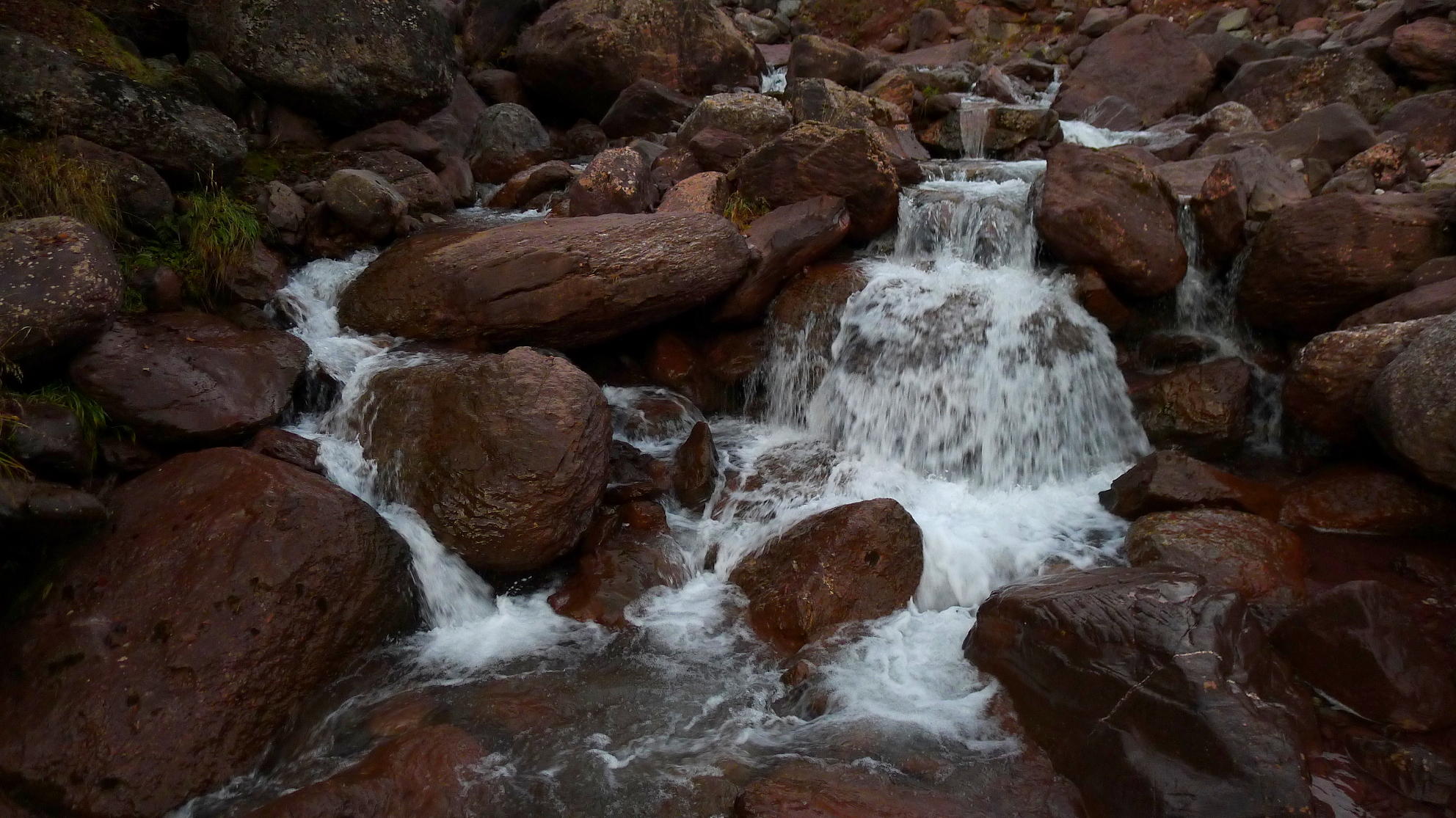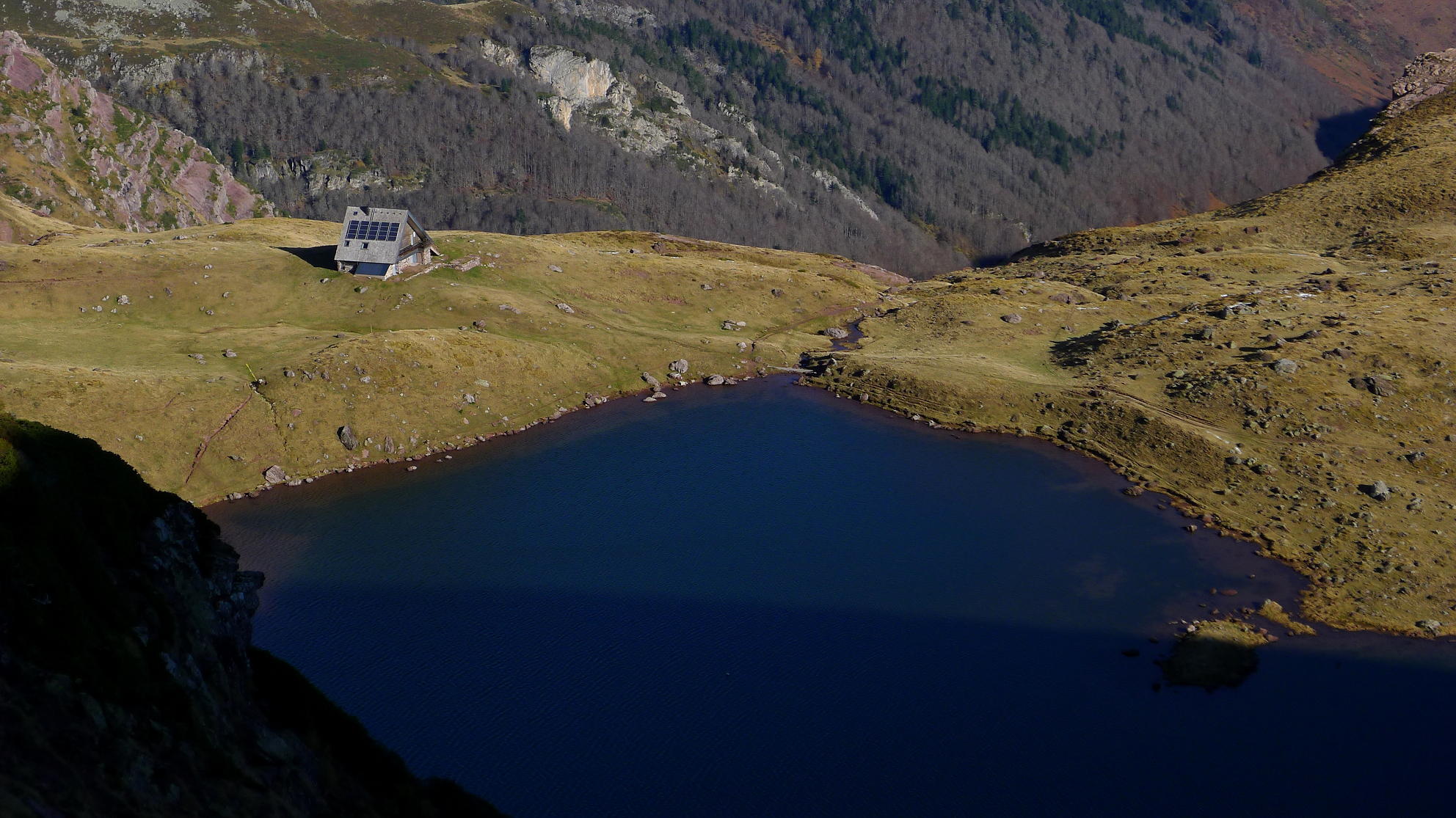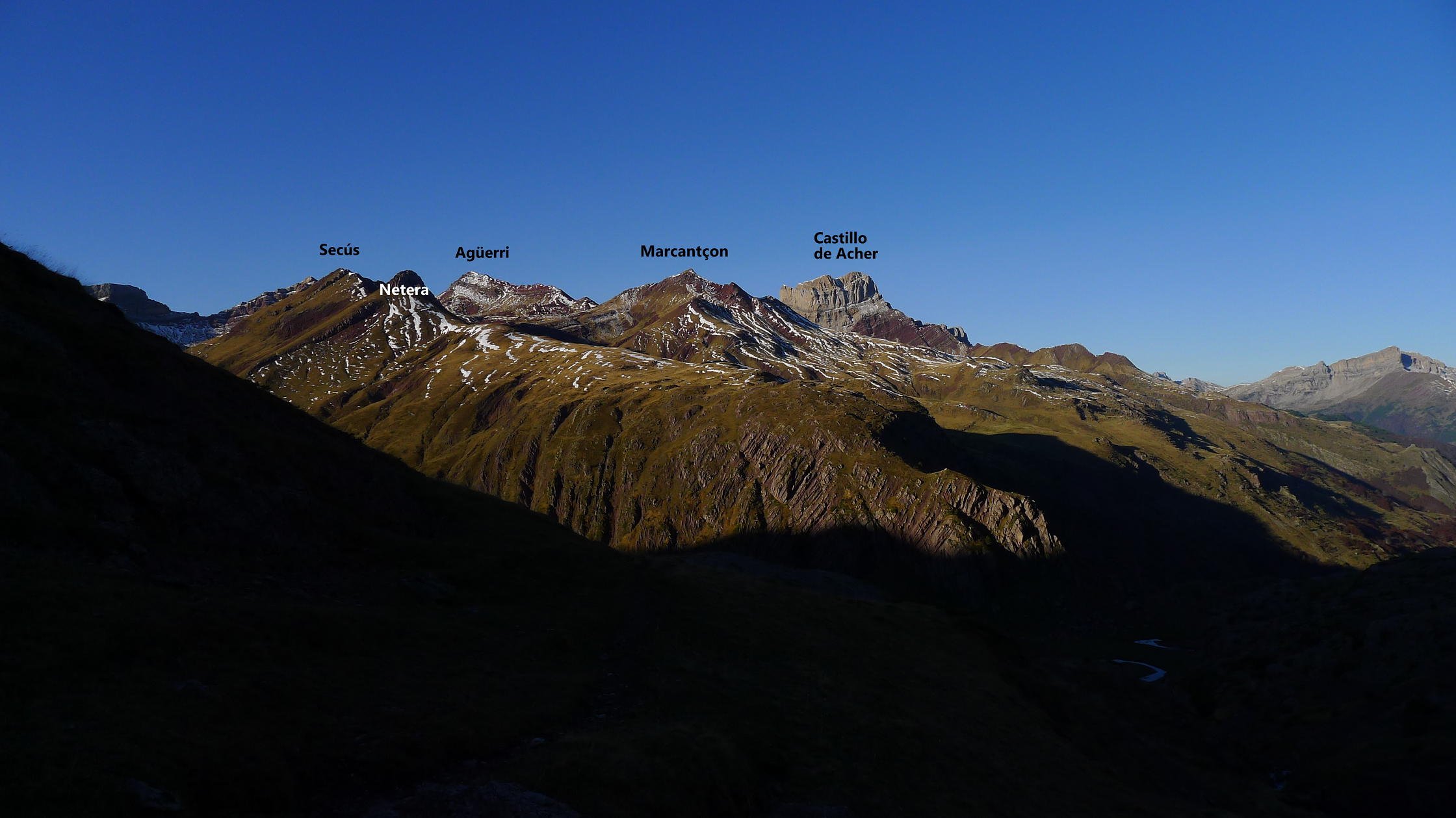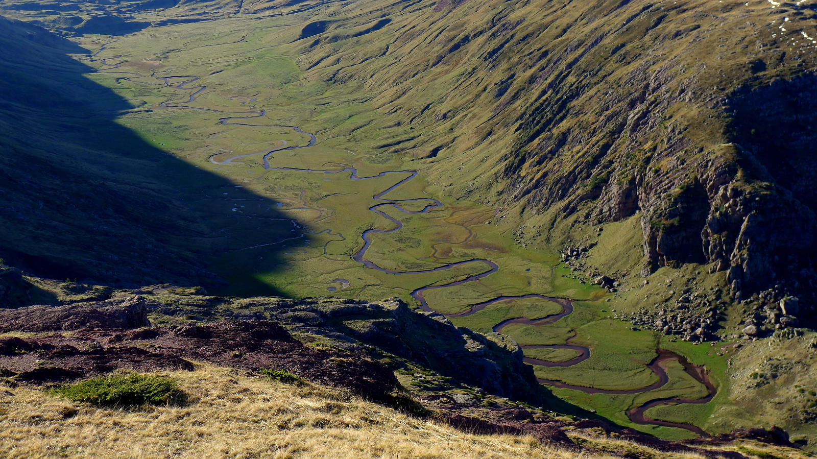 Continúo la cresta, que es una loma herbosa fácil, muy tendida por la vertiente sur, pero vertical sobre el refugio y lago de Arlet. Corono una cota (2191m 3h14′) y la cresta gira a la derecha para alcanzar el pico Arri (2154m 3h33′) y unos metros más allá el pico Arre (2157m 3h39′). Aquí busco la bajada al col de Acué, que me separa al sur del pico Acué o Gabedallos, pero todo lo que veo son canales muy pendientes y no está nada claro que no haya algún cortado más peligroso. Tengo referencia de la página del Komando Kroketa que hicieron la subida del collado al pico Arre, pero al final no me atrevo. Así que busco el descenso desde la cima de Arre hacia Aguas Tuertas por las lomas suaves al NW de esta cima y luego encontrando los mejores pasos en los escalones algo más pendientes que acaban desembocando en el barranco de Acué (1840m 4h16′), donde encuentro la senda tras atravesarlo .