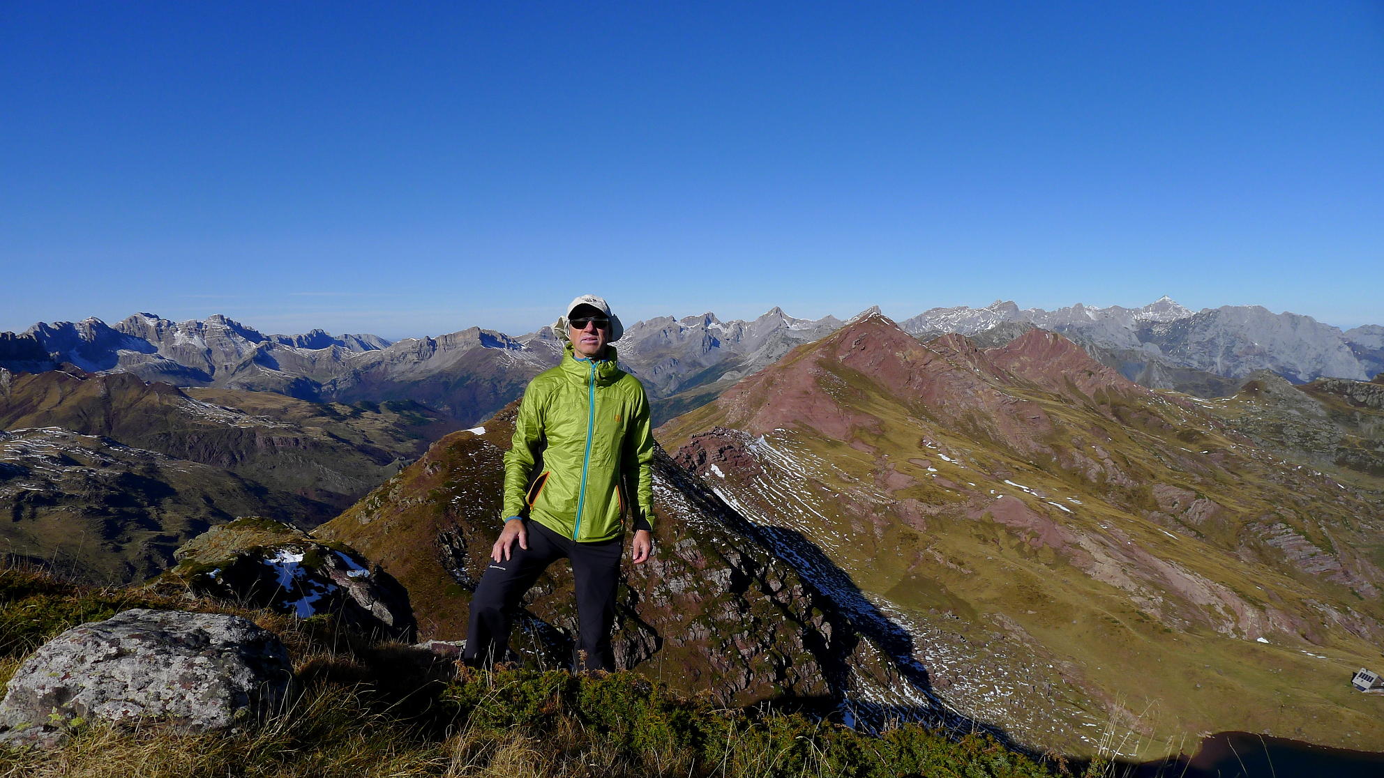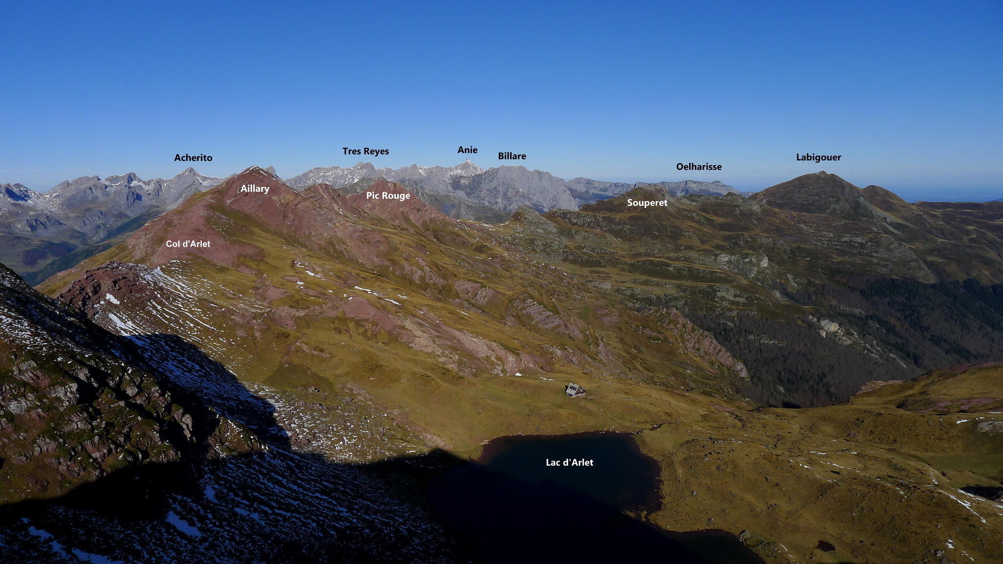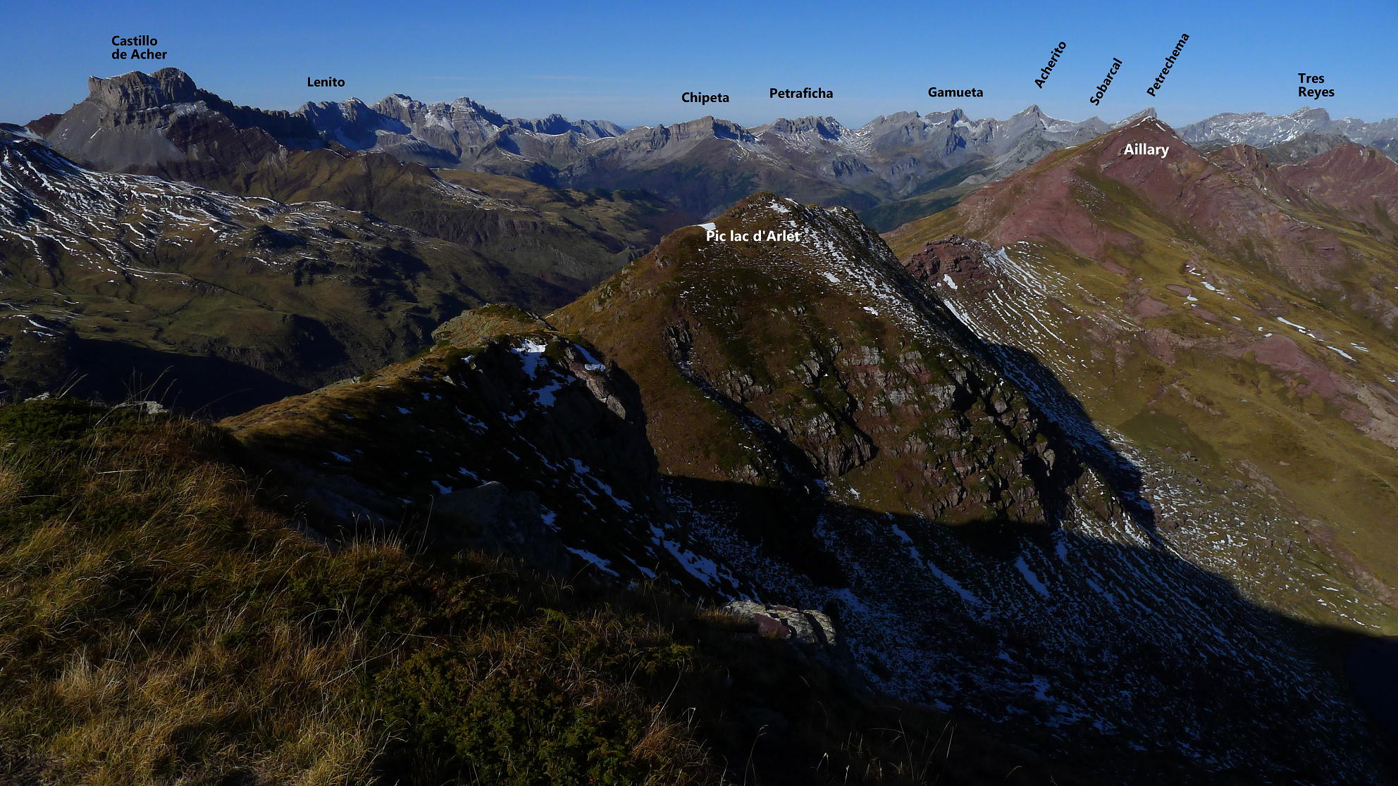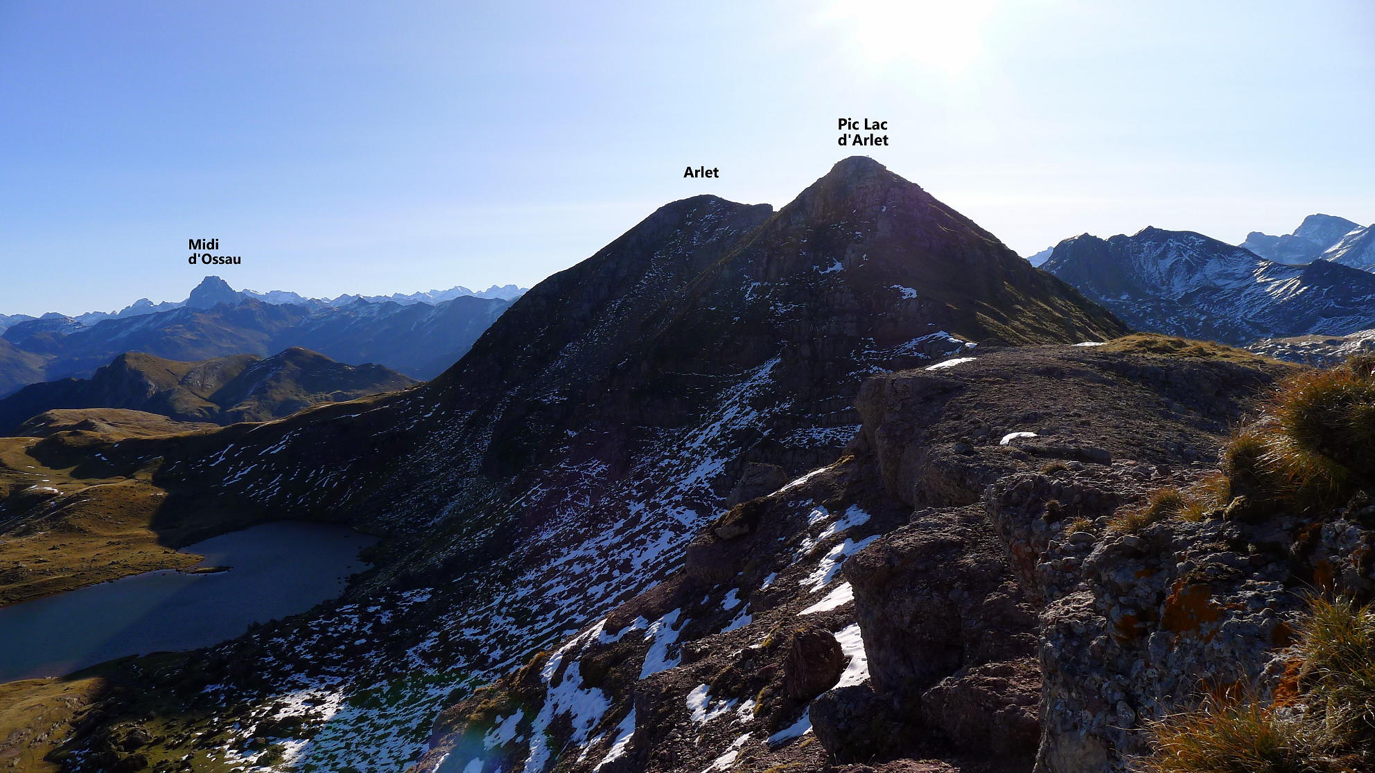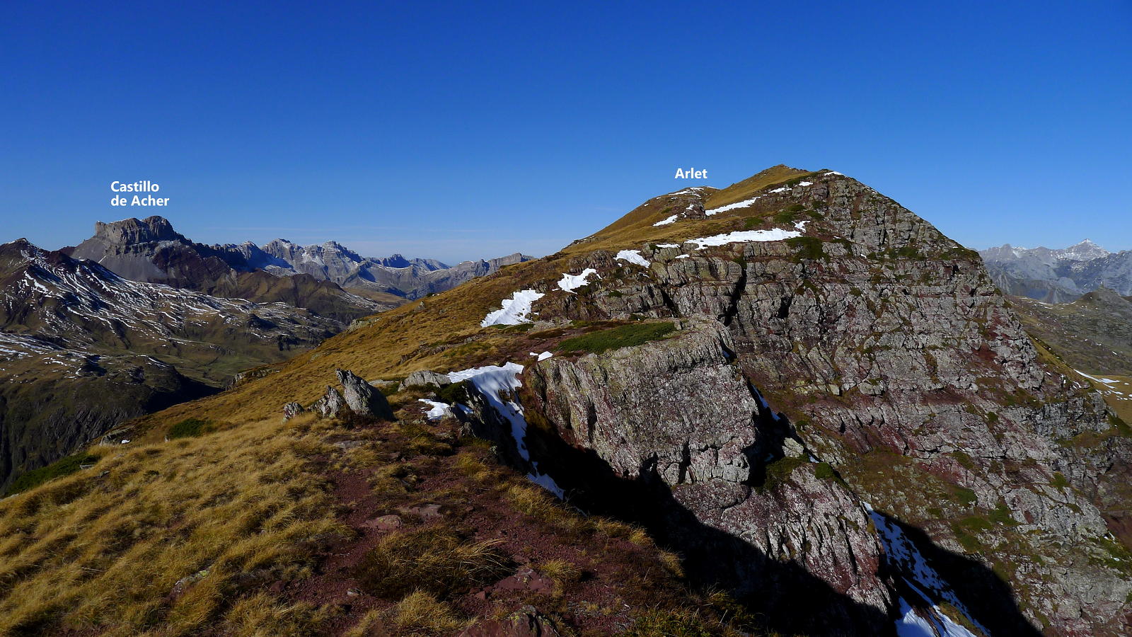 El descenso al collado es fácil y después hay que afrontar otro par de trepadas, ahora más bien por la parte española, hasta la cima del pico Arlet (2208m 2h38′), con una vista magnífica que me entretiene un buen rato identificando picos y haciendo fotos.