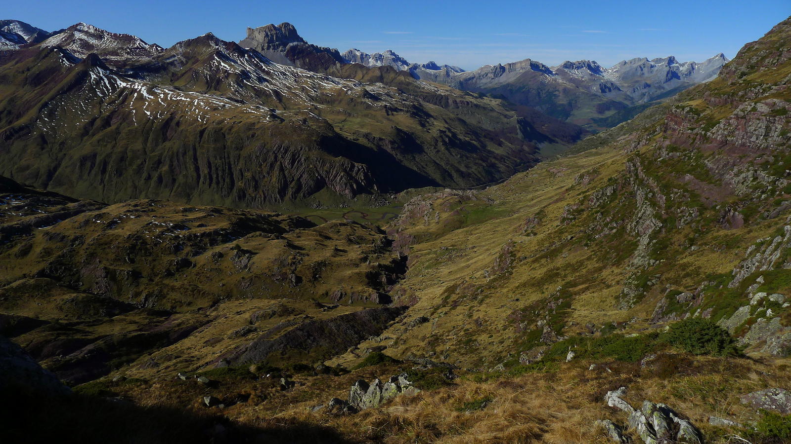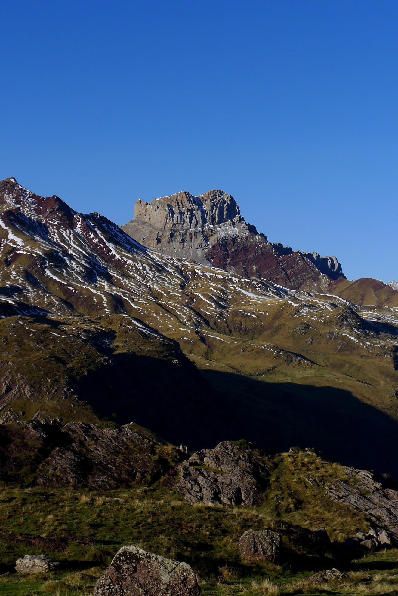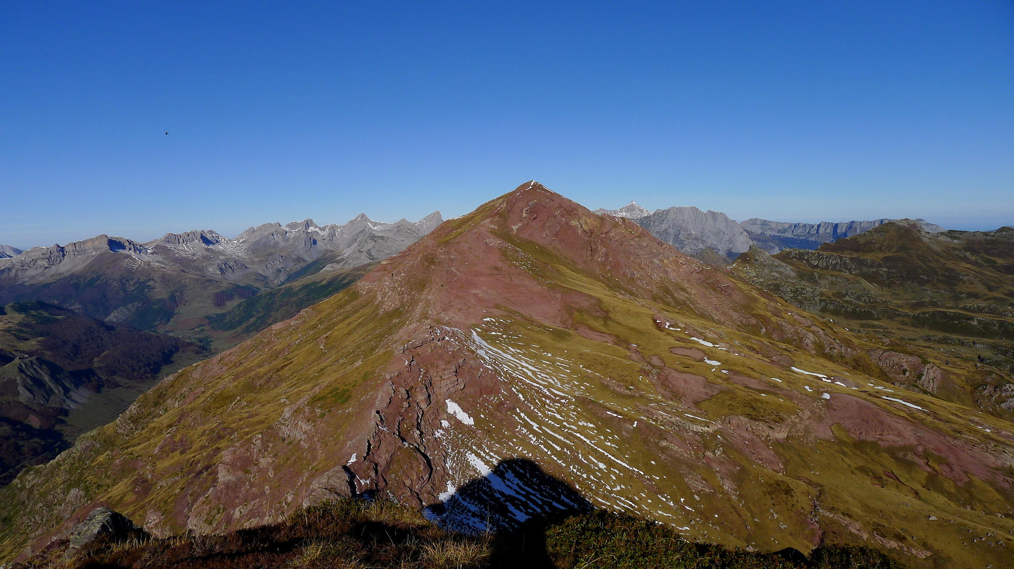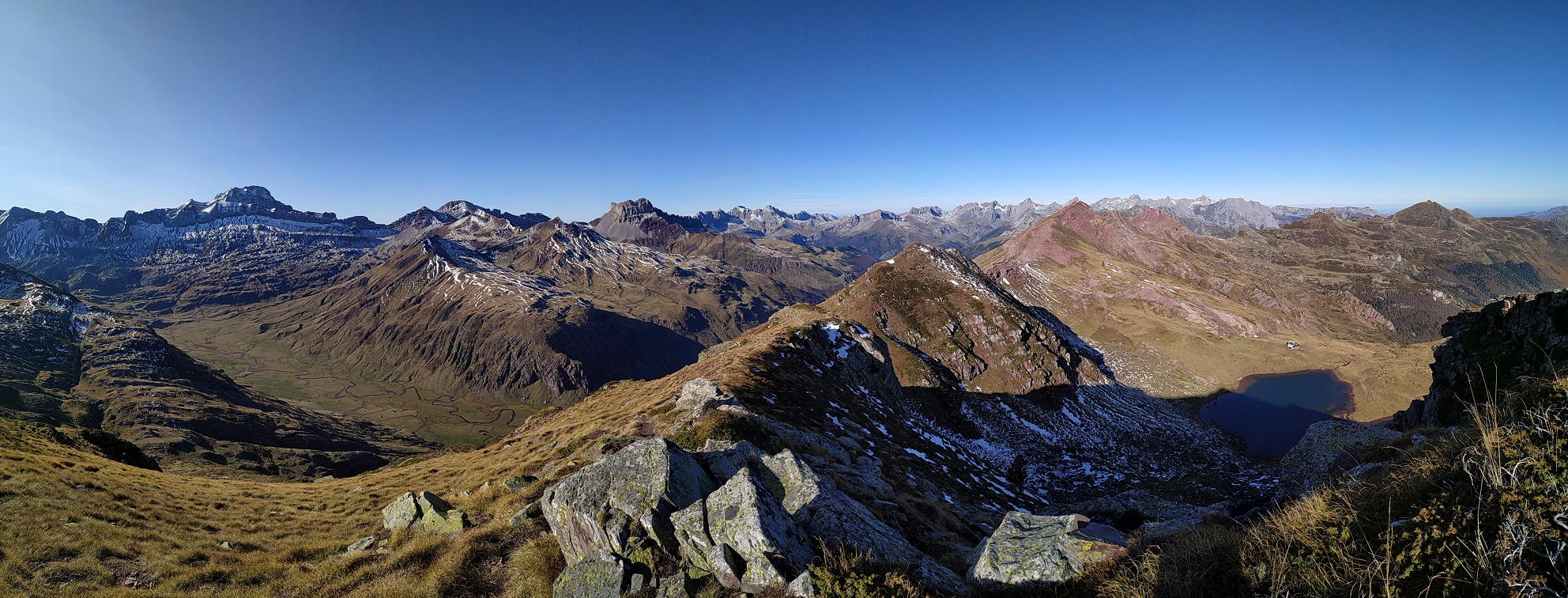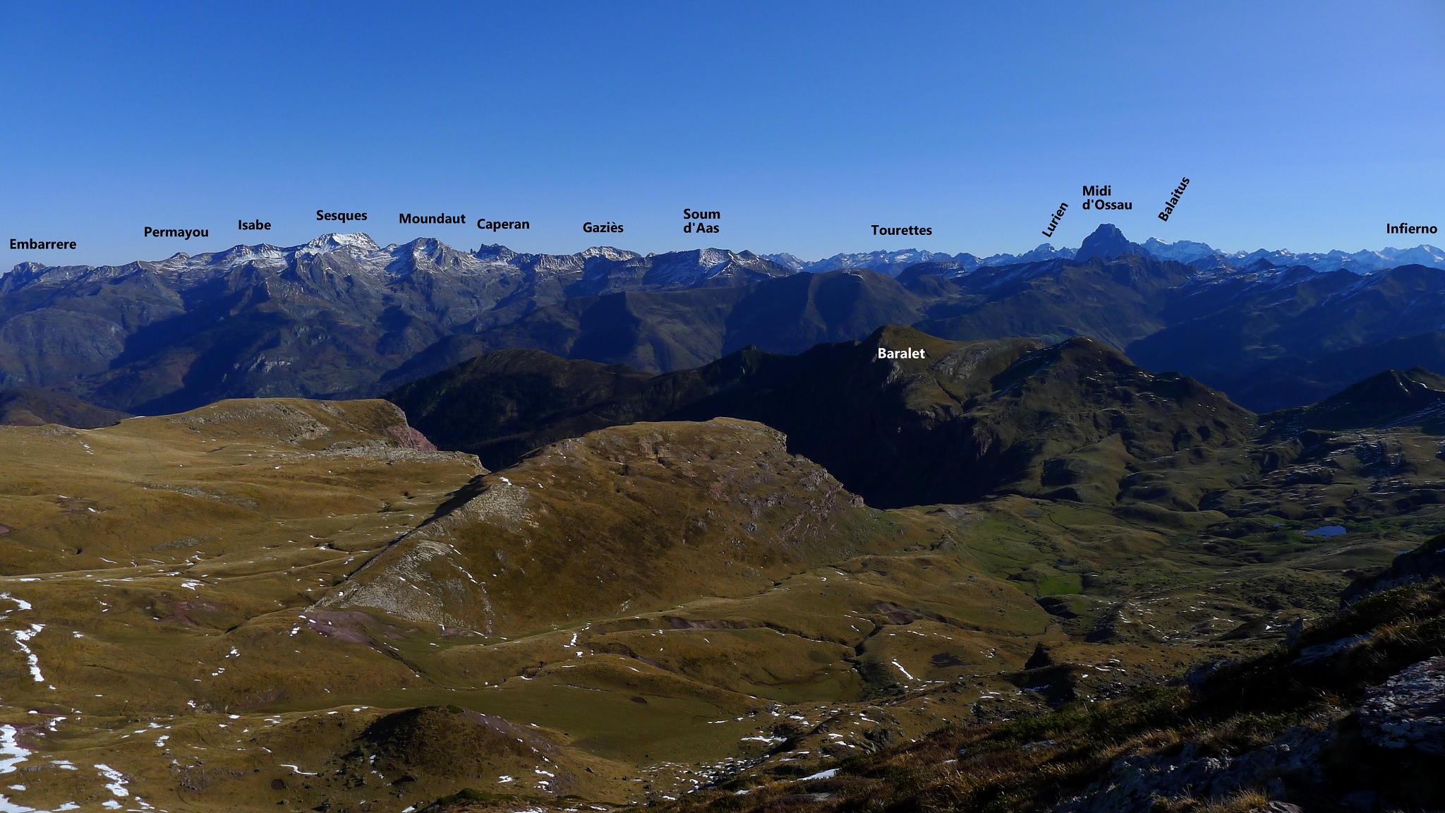 El descenso al collado es fácil y después hay que afrontar otro par de trepadas, ahora más bien por la parte española, hasta la cima del pico Arlet (2208m 2h38′), con una vista magnífica que me entretiene un buen rato identificando picos y haciendo fotos.