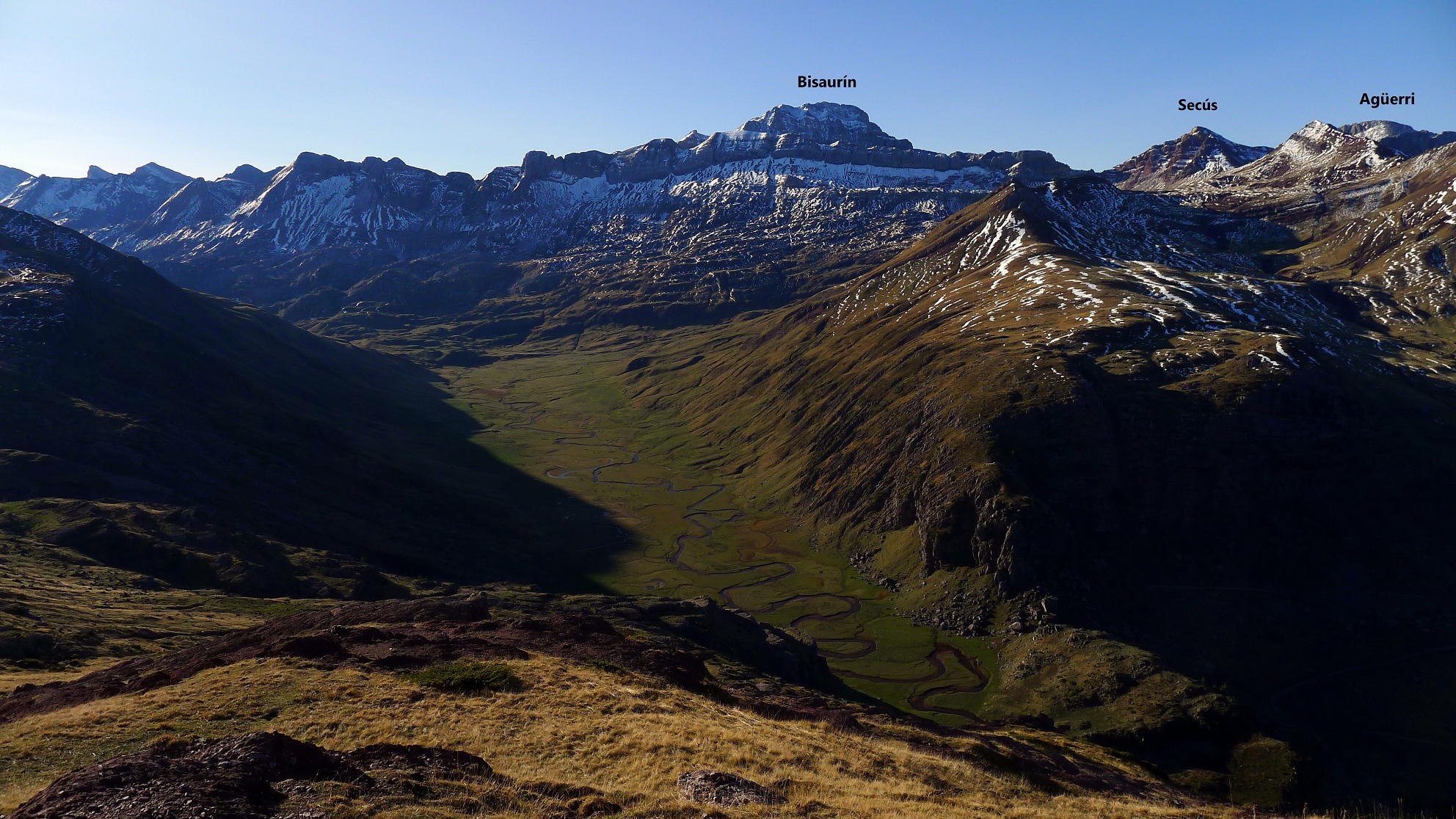 Un poco más adelante tengo que abandonar el GR (1610m 0h42′) para bajar hacia los meandros del valle y cruzar a las bravas el río; no hay otra opción puesto que mi objetivo está en la otra orilla. Subo junto al barranco de Acué, sin senda por su orilla izquierda, aunque luego bajaré por una senda marcada. Algo más arriba tomo dicha senda (1698m 1h13′) y la sigo con sus hitos hasta una bifurcación que tomo a la izquierda (1800m 1h27′). Al descenso llegaré a esta bifurcación desde el ramal de la derecha.