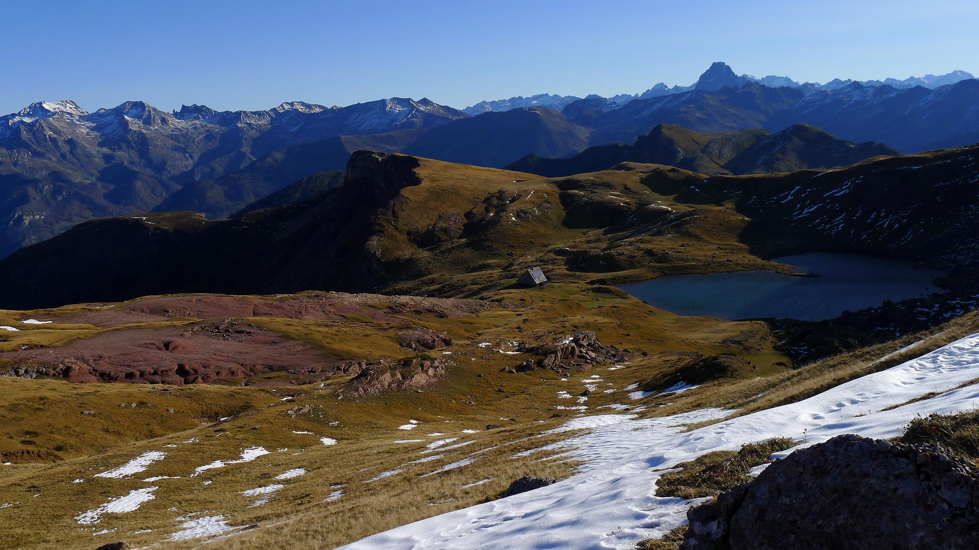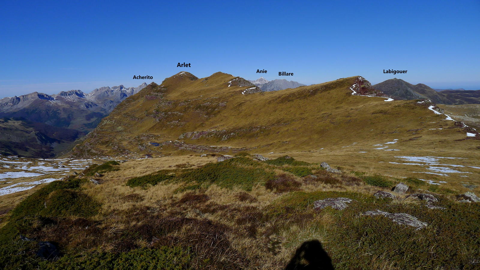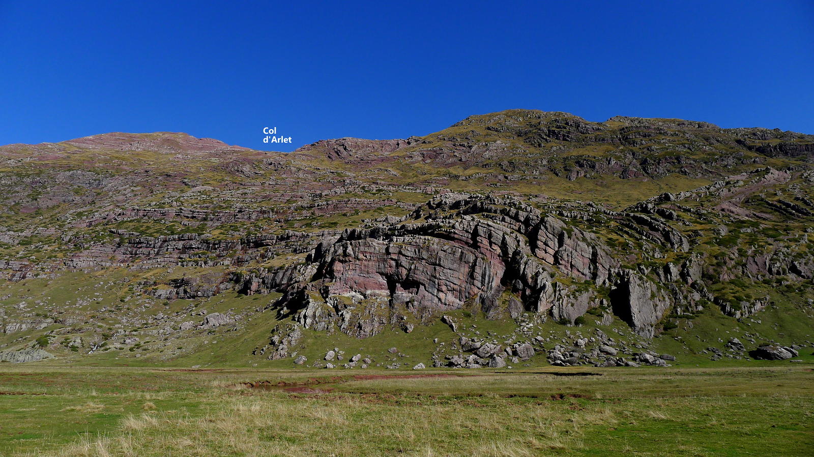 La senda que tomo flanquea en ligera cuesta arriba la ladera herbosa bajo el pico Arlet y, finalmente, gira a la derecha para enfilar la subida al col d’Arlet (2093m 2h04′). Hay que seguir la cresta hacia el SE. Enseguida se evita un resalte rocoso por la izquierda (vertiente francesa) con traza de senda. Se sube una primera cima tratando de seguir la huella más pisada, con un par de trepadas poco expuestas. En los mapas no tiene nombre pero la puedo llamar pic du Lac d’Arlet (2178m 2h24′).