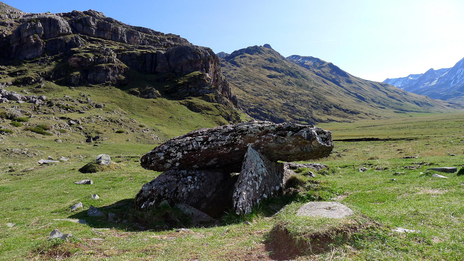 Esta senda me lleva a la bifurcación de la subida (1800m 4h20′) y a terreno ya conocido. De nuevo me tengo que echar a la agua para cruzar Aguas Tuertas y, finalmente, desde la Cabaña me desvío a la derecha para visitar el Dolmen de Aguas Tuertas (1610m 4h49′), uno de los muchos restos megalíticos que hay por esta zona. Luego la pista me lleva al aparcamiento (1355m 5h20′)