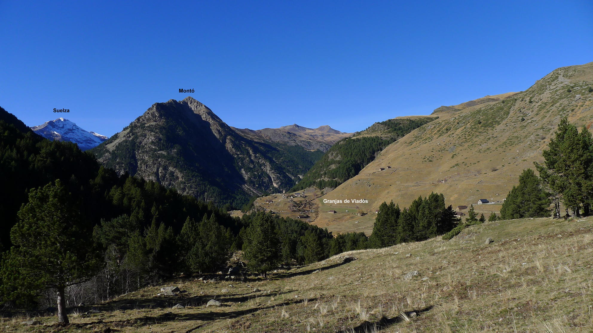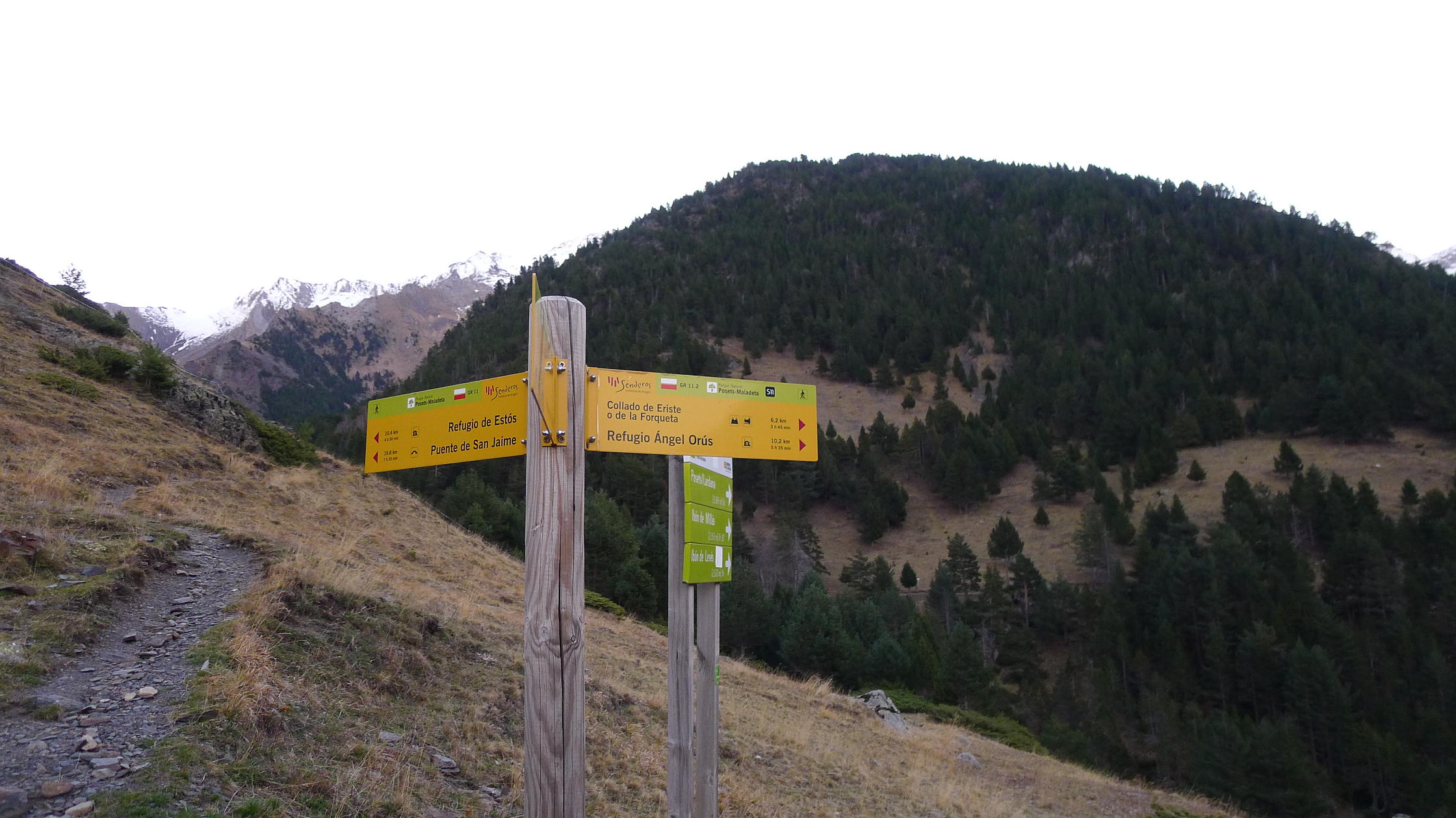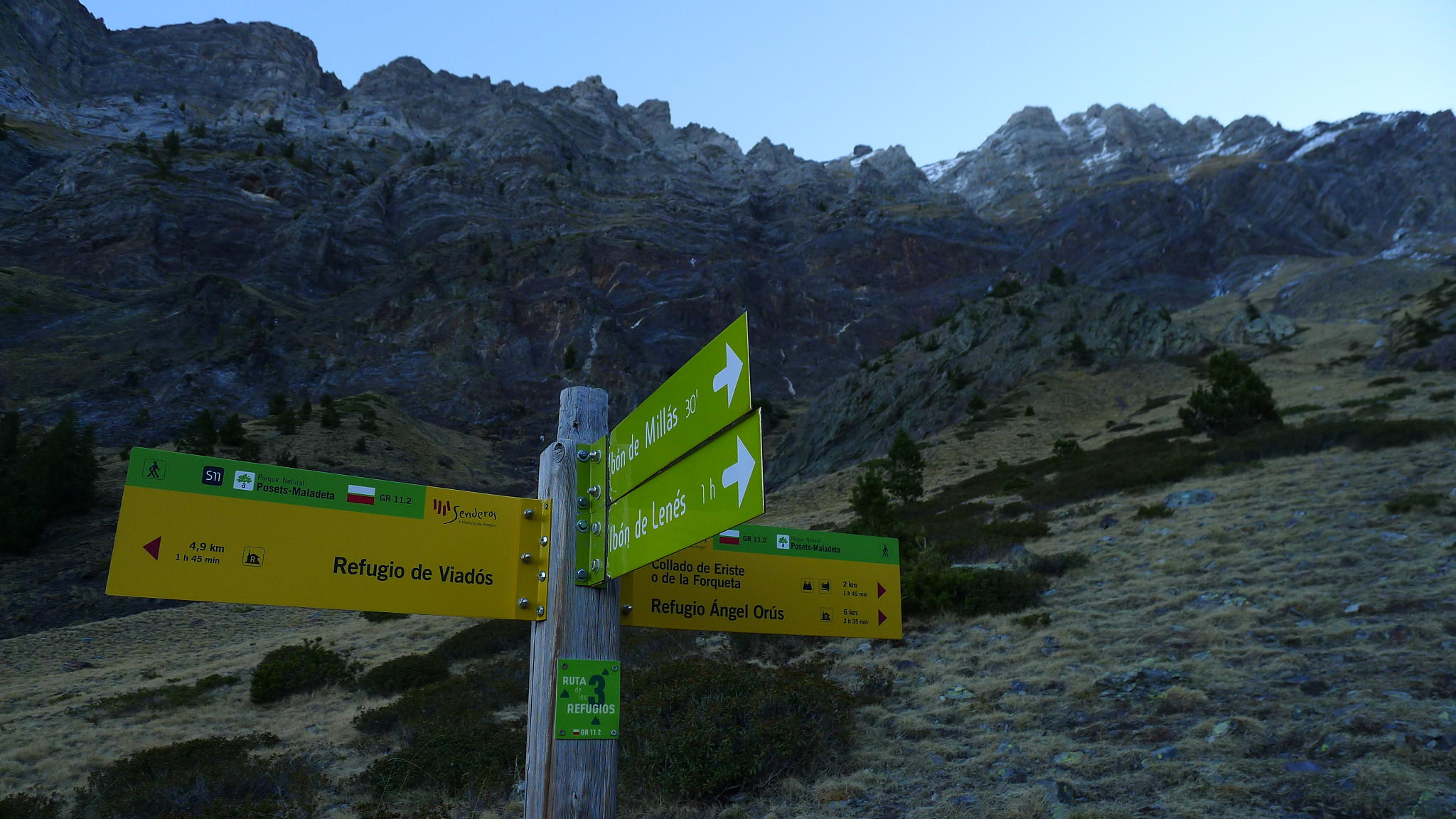 En la primera curva a la izquierda, después de pasar San Juan de Plan, se toma la pista que sube a Viadós. Son 10km de pista que se puede hacer con cualquier coche con bastante cuidado. Con un coche alto se hace sin problemas. Se aparca unos metros por debajo del refugio de Viadós (1700m). Ya andando se continúa la pista entre las bordas de Viadós (GR11) y en el primer cartel se toma el desvío a la derecha que marca collado de Eriste o de la Forqueta, desciende al barranco de Añes Cruces y lo pasa por un puente.