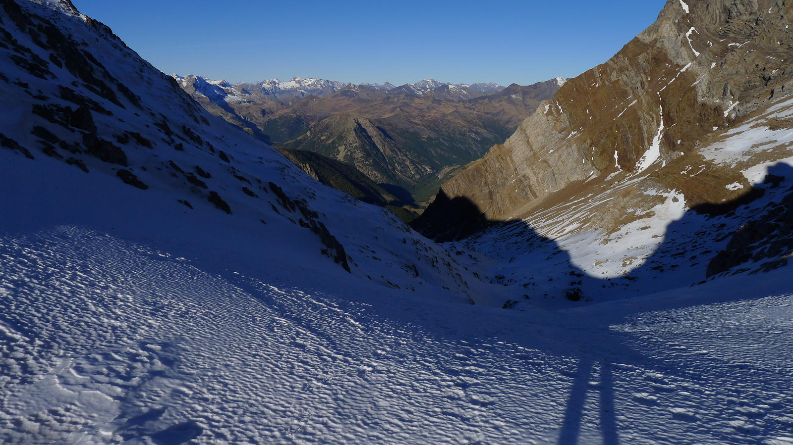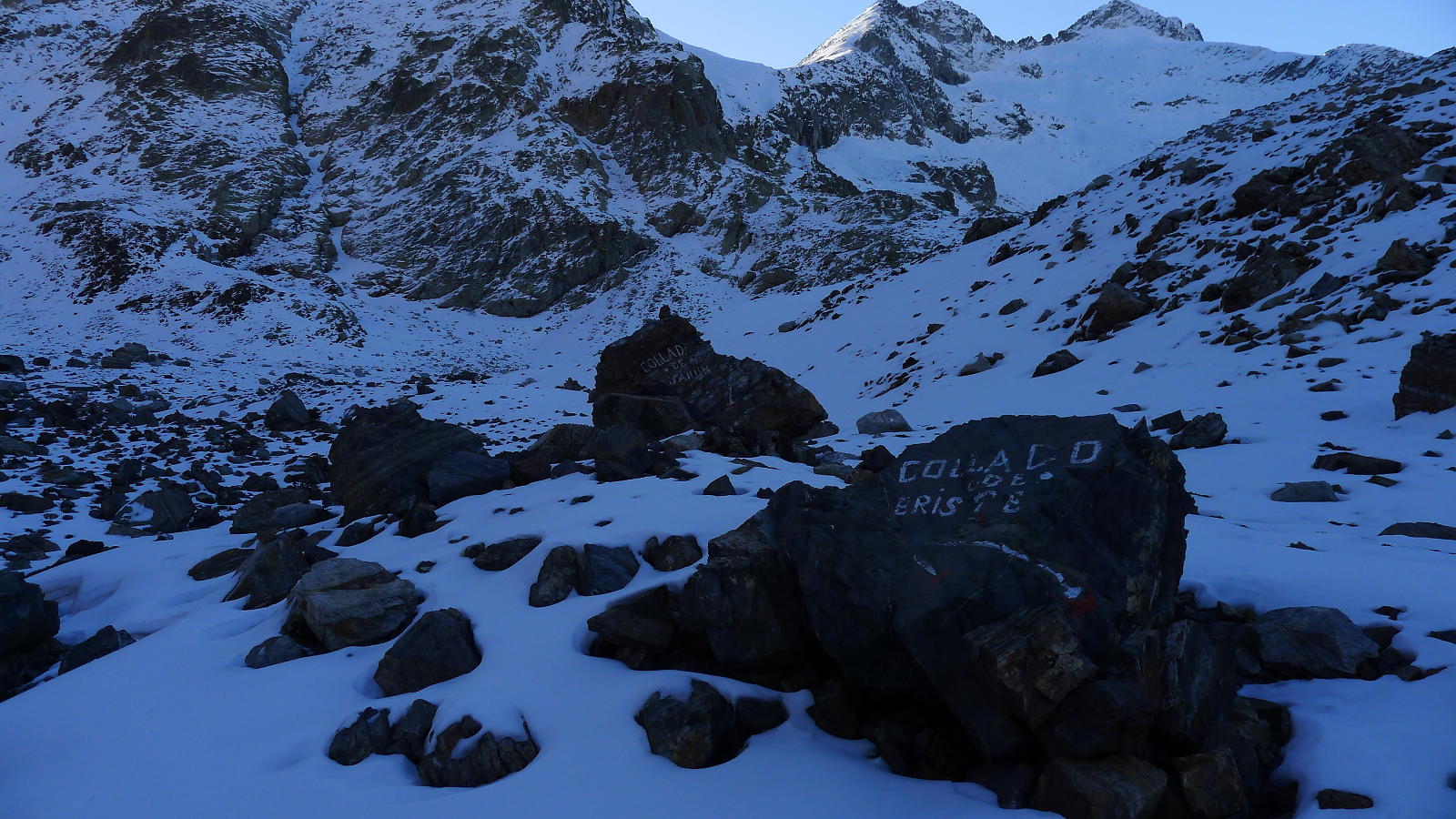 Llego al collado de Eriste o de la Forqueta (2860m 2h31′) y a mi derecha queda el pico de la Forqueta. Comienzo la ascensión pero, cono os he dicho al principio, las placas de nieve empiezan a deslizarse bajo mis crampones y empieza a aumentar la verticalidad, así que decido volver al collado y descender. El punto más alto que alcanzo es 2905m (2h42′).