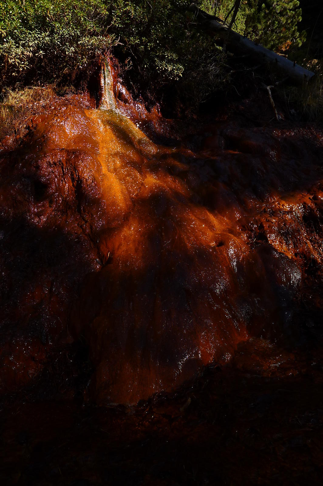 Se sube a unos prados y el camino se introduce por bosque de pinos siempre por la orilla derecha del barranco. Hay un curioso manantial de aguas ferruginosas que tiñen totalmente de rojo las rocas. El camino cruza el barranco secundario de las Tuertas, que baja semihelado y desciende hasta el cauce del barranco principal (2060m 0h56′) para empezar a subir con zigzags.