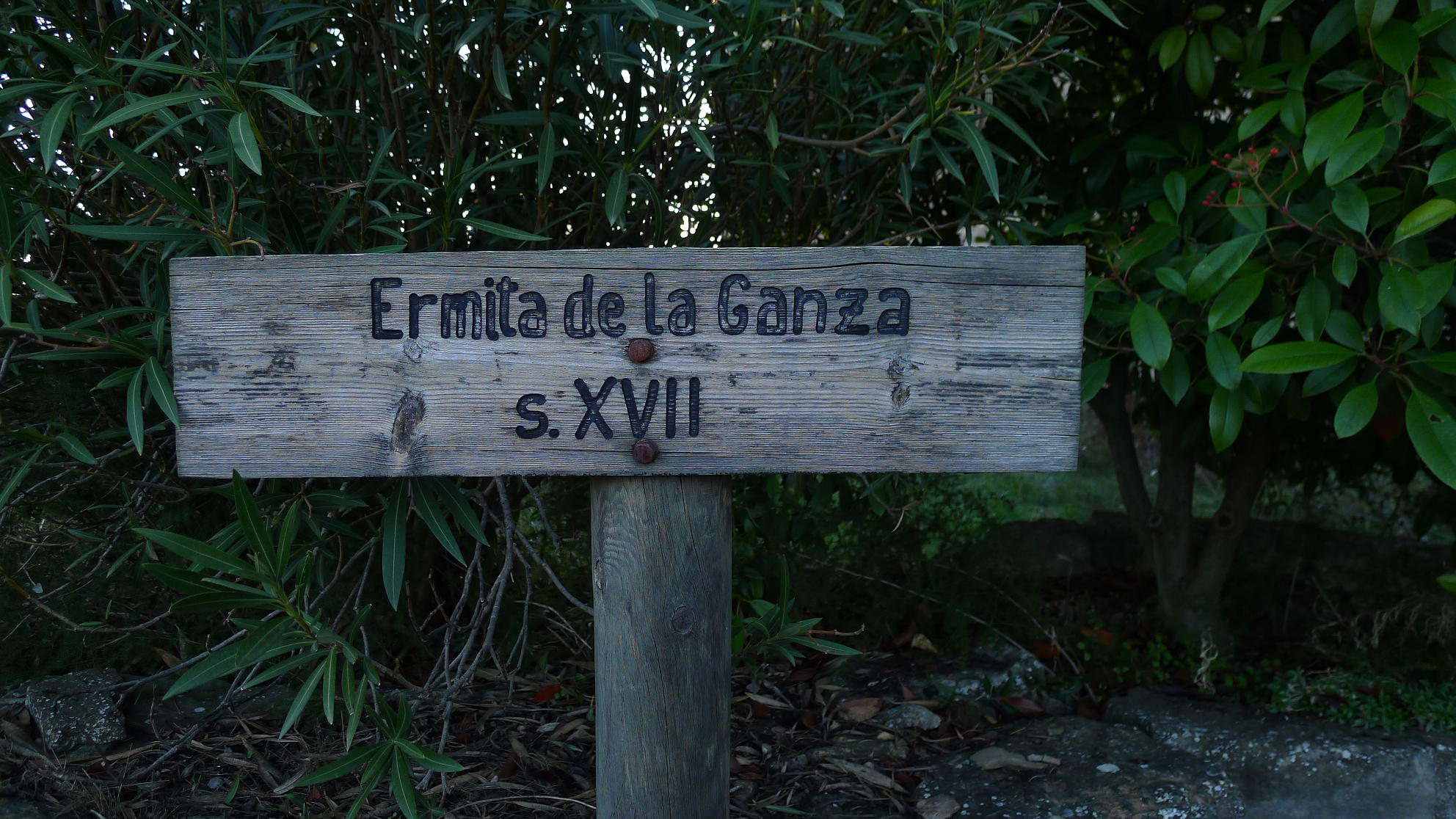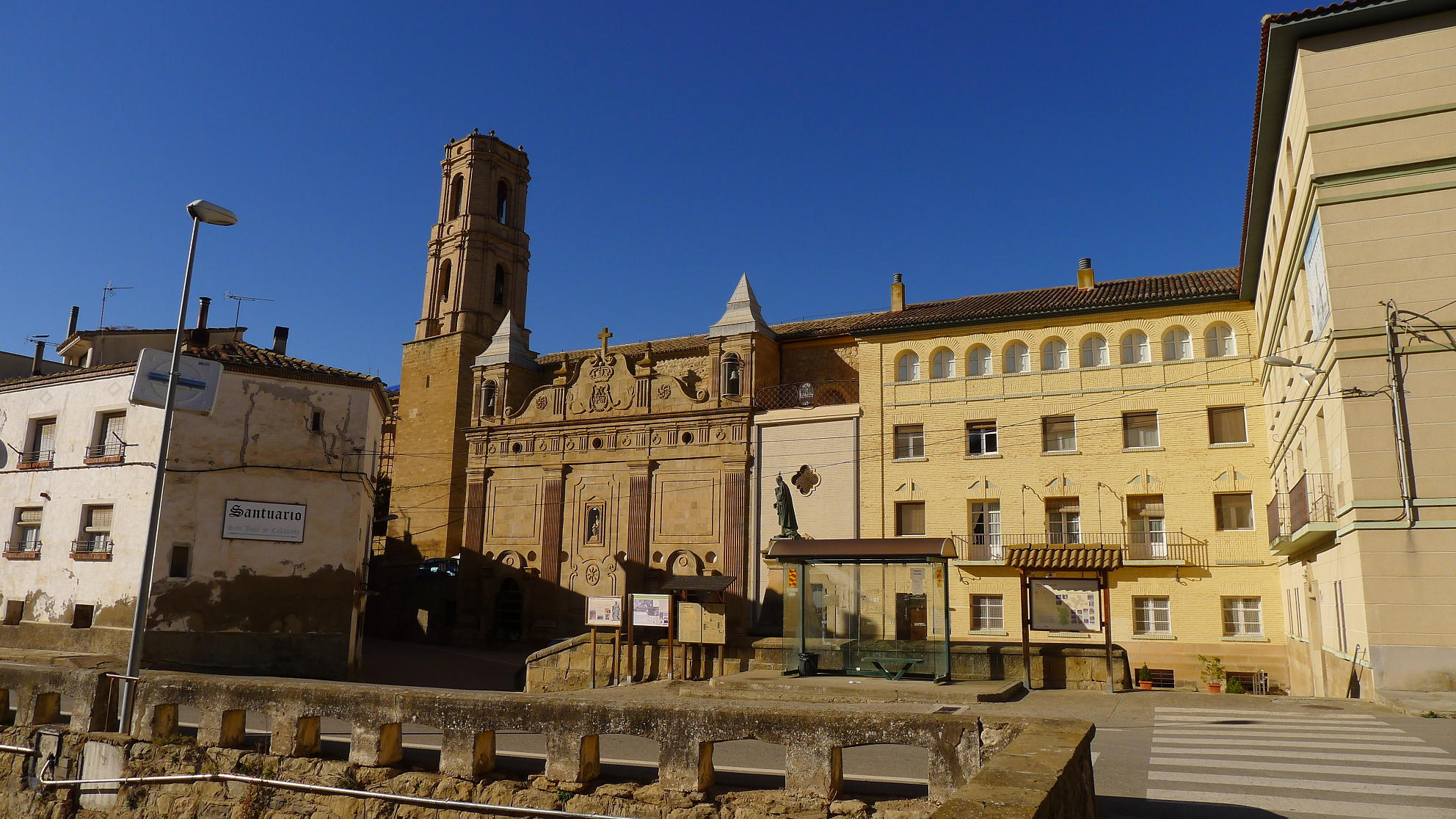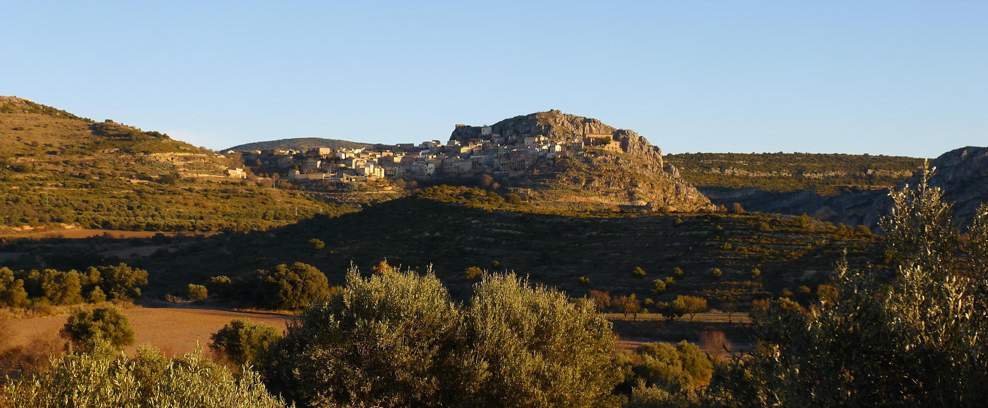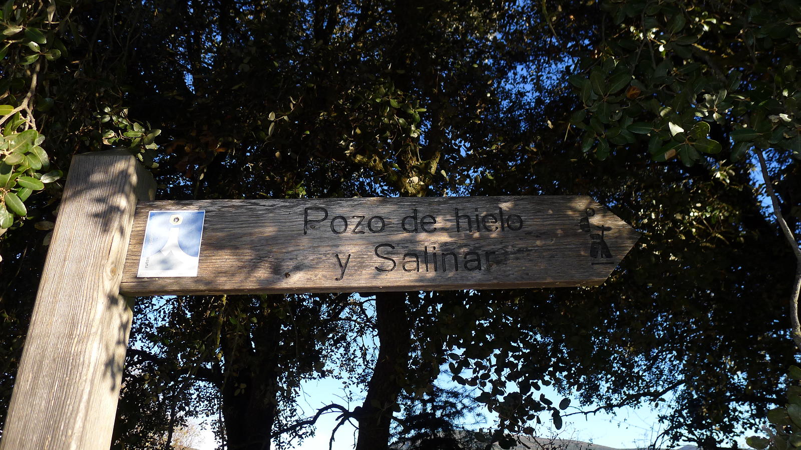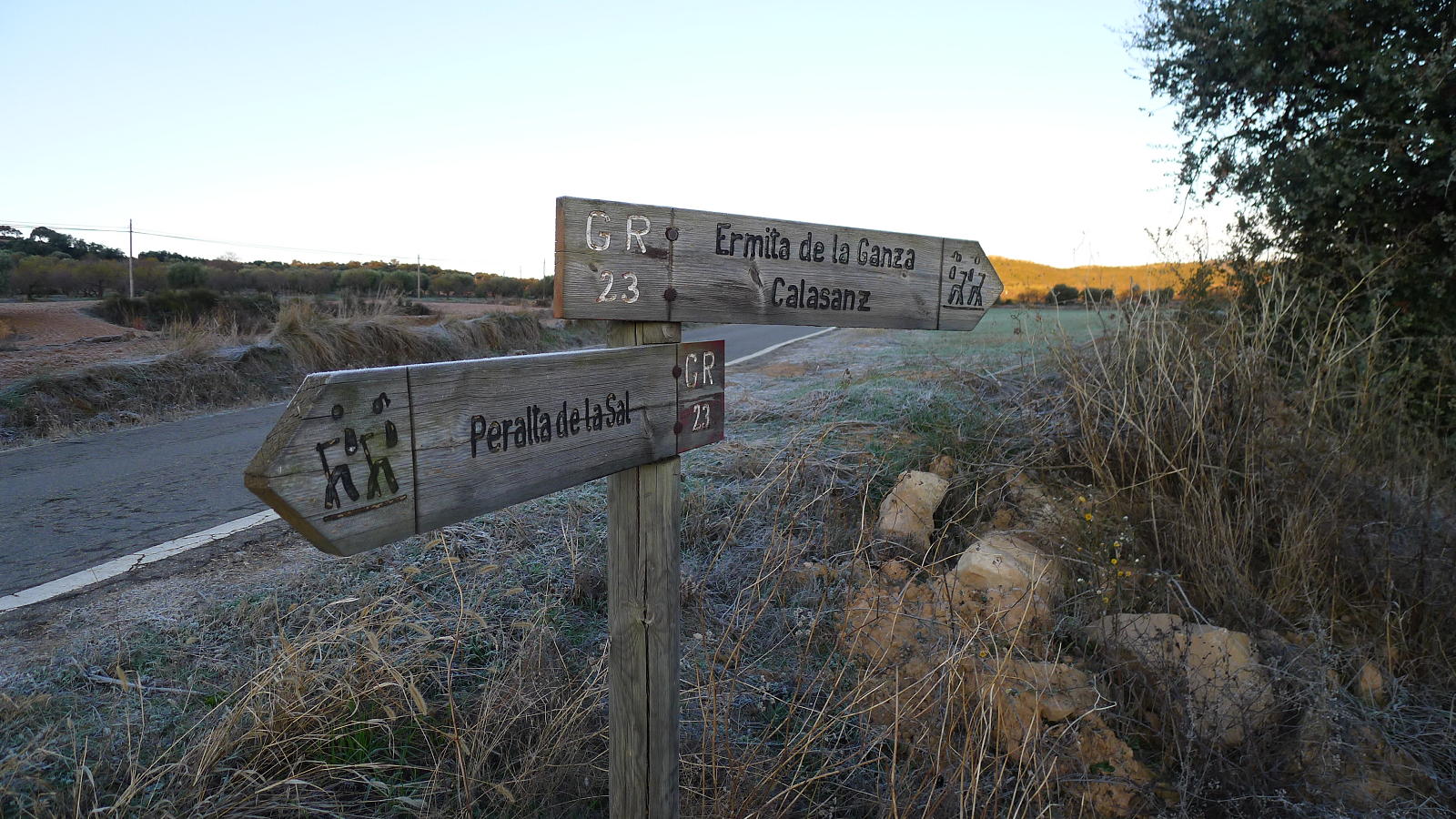 Salgo de Peralta de la Sal (518m); por la calle Mayor se desemboca en la carretera a Calasanz, que sigo por 1km más o menos para salir a la derecha por una pista señalizada como GR23 (572m 0h12′), entre campo de olivos. Pasa junto a la ermita de la Ganza (615m 0h29′) y la pista ya se convierte en un agradable camino que va ascendiendo hasta la entrada en el pueblo de Calasanz (704m 0h54′), situado sobre un promontorio rocoso. Hay que seguir las indicaciones del GR, subiendo hacia el cementerio y saliendo hacia el norte por una pista asfaltada, camino del pozo de hielo y las salinas.