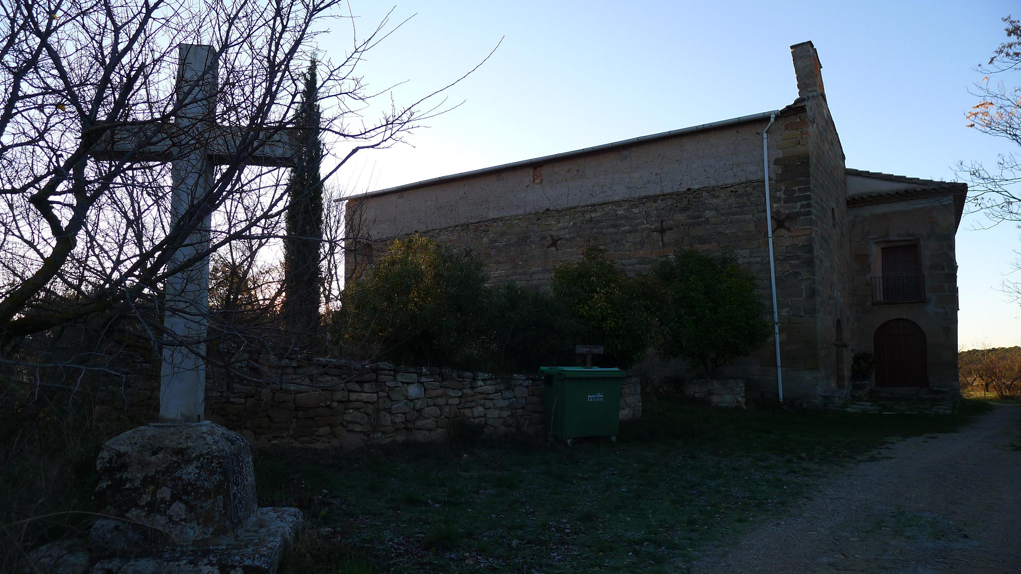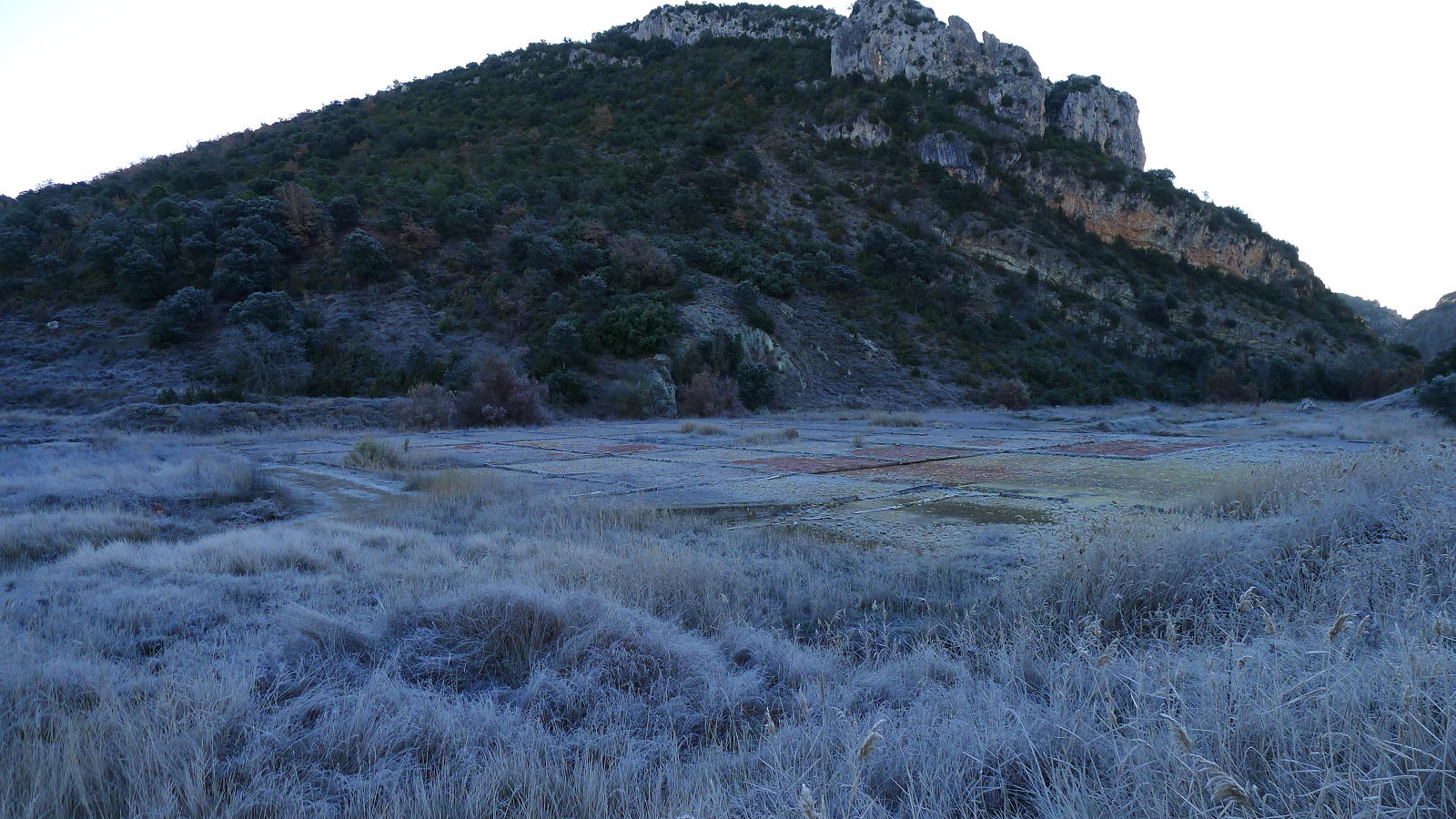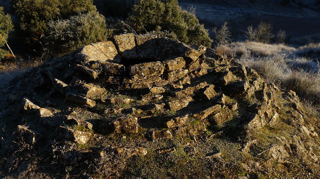 Tras la fuente se gira a la derecha (696m 1h08′) y se deja el GR. Una pista en descenso lleva al pozo de hielo (661m 1h16′), muy bien conservado y restaurado, y luego se gira a la derecha para ir a las antiguas salinas, que se rodean por la izquierda, dejando la pista y desviándome a la derecha por una zona que debió ser antiguamente un camino, pero que ya no se distingue y desemboca otra vez en la pista, de manera que se ataja un trecho. Este es el camino de la Comaleta. Cuando el camino gira a la izquierda yo sigo recto por un campo arado (766m 1h53′) y voy girando ligeramente a la derecha hasta que salgo del campo y asciendo un talud, atravieso matorral de carrasca y enebro, salgo a un camino que atravieso (785m 2h04′) y, unos metros más allá, tomo la pista que sigo a la derecha y que se va dirigiendo hacia el sur.