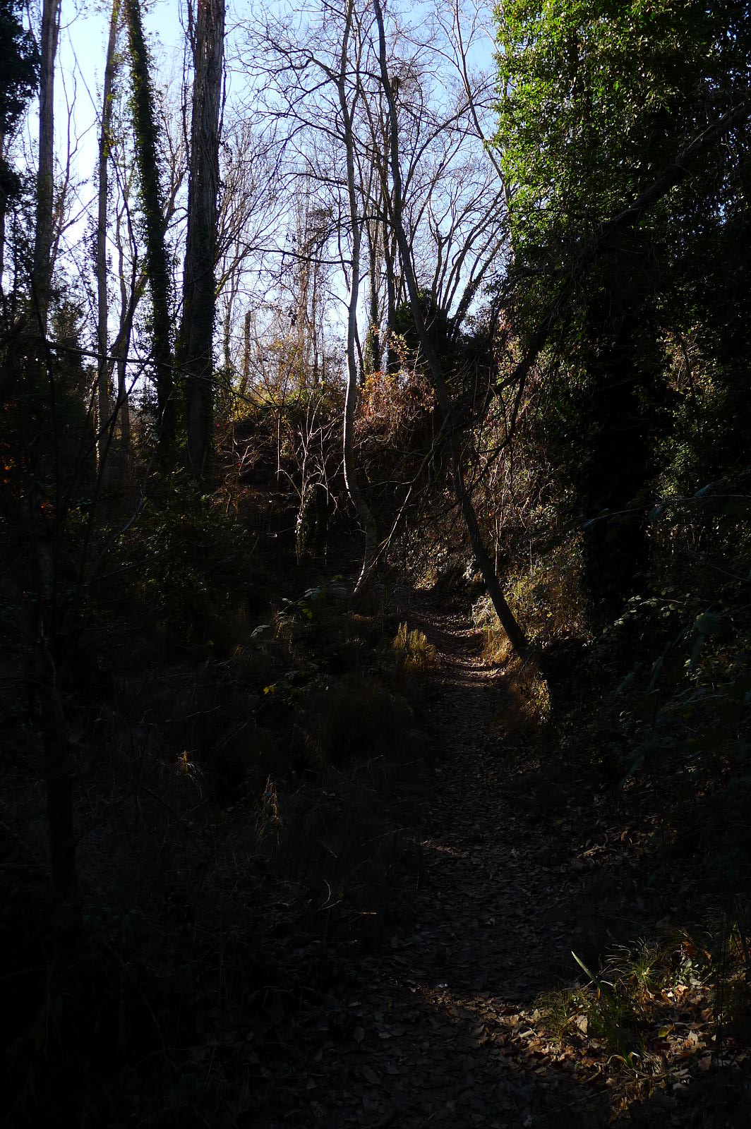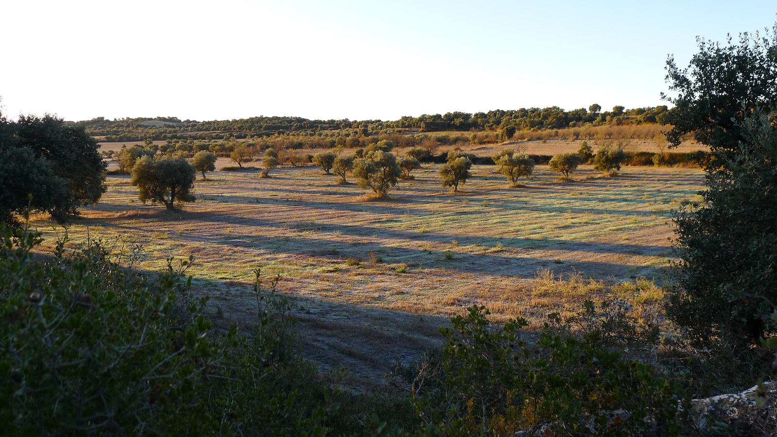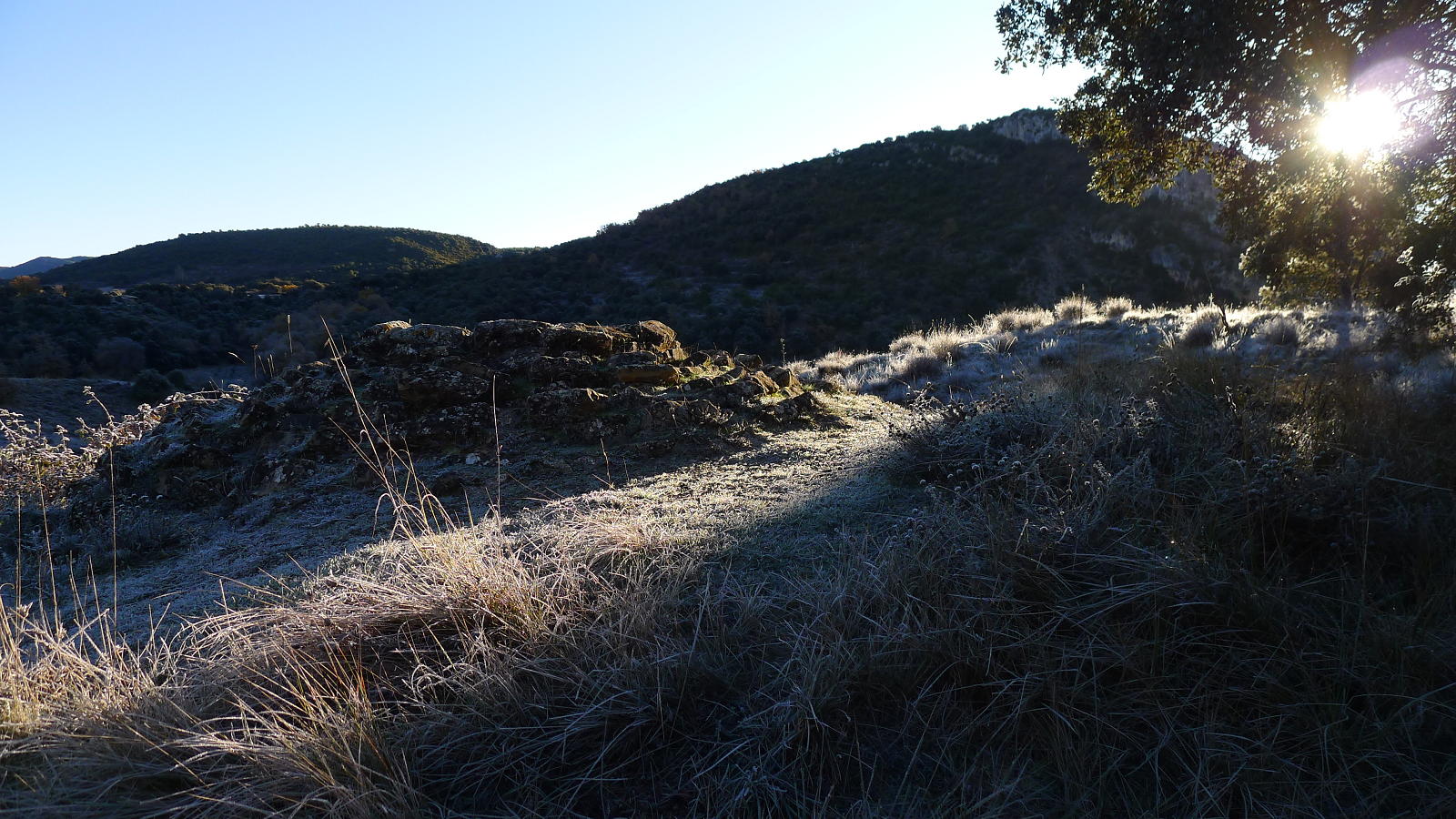 Tras la fuente se gira a la derecha (696m 1h08′) y se deja el GR. Una pista en descenso lleva al pozo de hielo (661m 1h16′), muy bien conservado y restaurado, y luego se gira a la derecha para ir a las antiguas salinas, que se rodean por la izquierda, dejando la pista y desviándome a la derecha por una zona que debió ser antiguamente un camino, pero que ya no se distingue y desemboca otra vez en la pista, de manera que se ataja un trecho. Este es el camino de la Comaleta. Cuando el camino gira a la izquierda yo sigo recto por un campo arado (766m 1h53′) y voy girando ligeramente a la derecha hasta que salgo del campo y asciendo un talud, atravieso matorral de carrasca y enebro, salgo a un camino que atravieso (785m 2h04′) y, unos metros más allá, tomo la pista que sigo a la derecha y que se va dirigiendo hacia el sur.