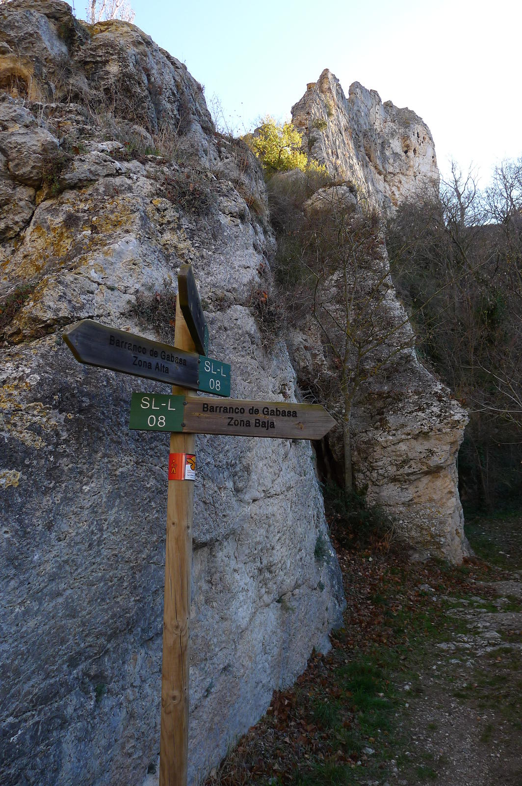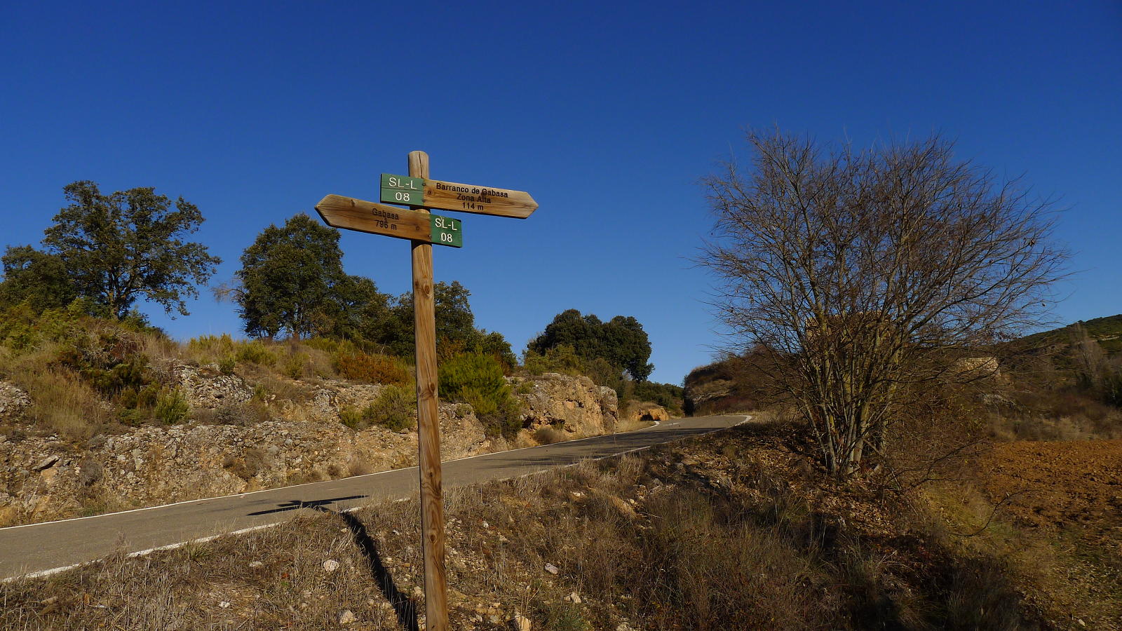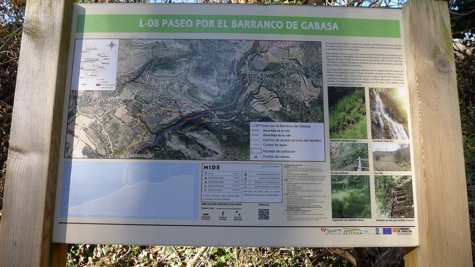 Dejo la pista y salgo a la izquierda a un campo arado (787m 2h12′) otra vez y salgo del campo por una senda a la izquierda que casi no se ve. Avanza entre carrasca y enebro y se sigue prestando mucha atención. Luego desciende por una zona más abierta directamente a la carretera de Gabasa (681m 2h37′). Sigo la carretera unos metros hacia la izquierda y ahí está el desvío señalizado a la derecha del camino SL-L-08 al barranco de Gabasa. Enseguida, a la derecha, hay una zona de bancos y carteles con información sobre el barranco de Gabasa y ahí se inicia la parte más atractiva del recorrido, un sendero acondicionado junto al barranco, un rincón de verdor y frescor, con una espectacular cascada, nacimiento del río Sosa.