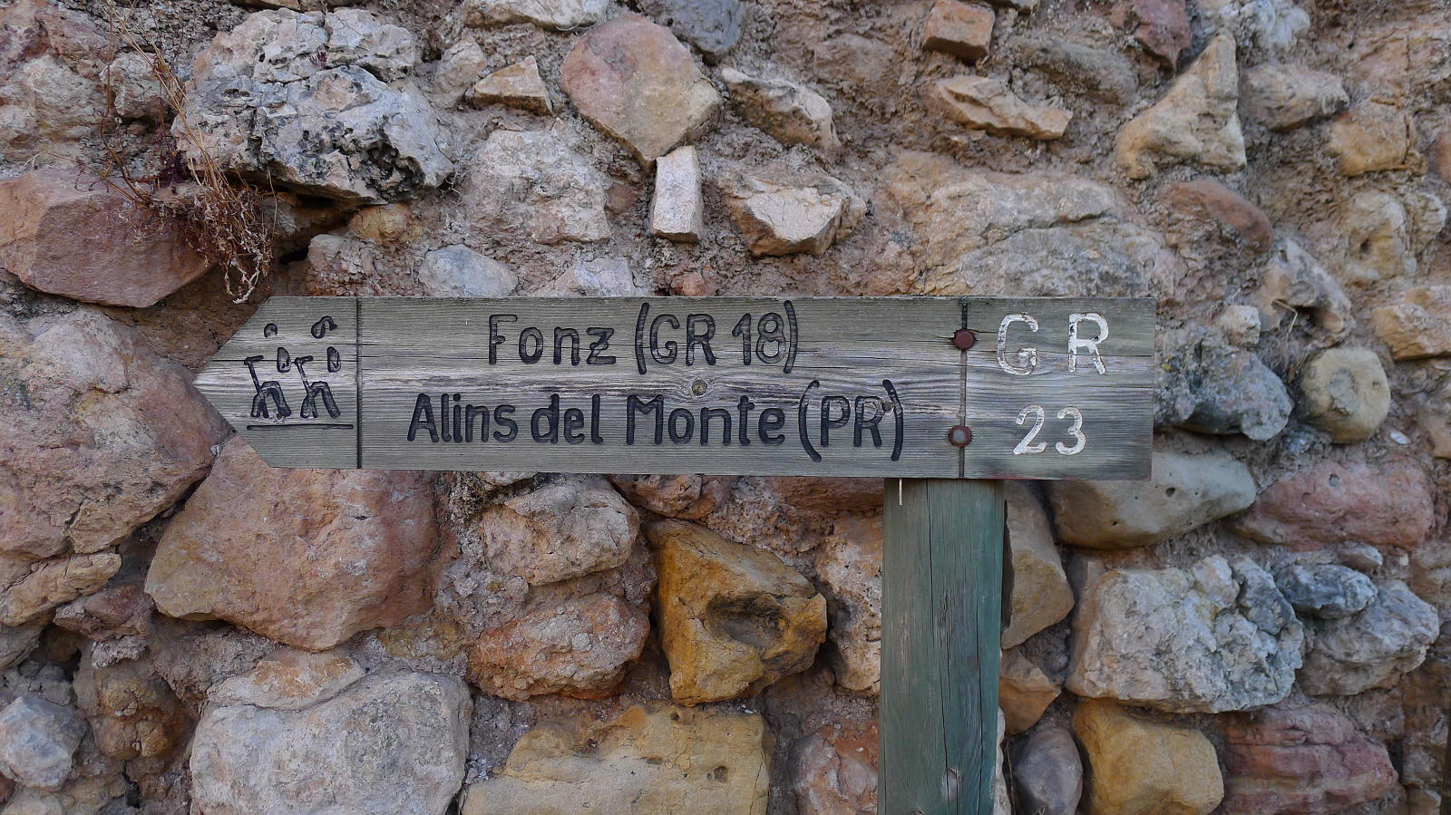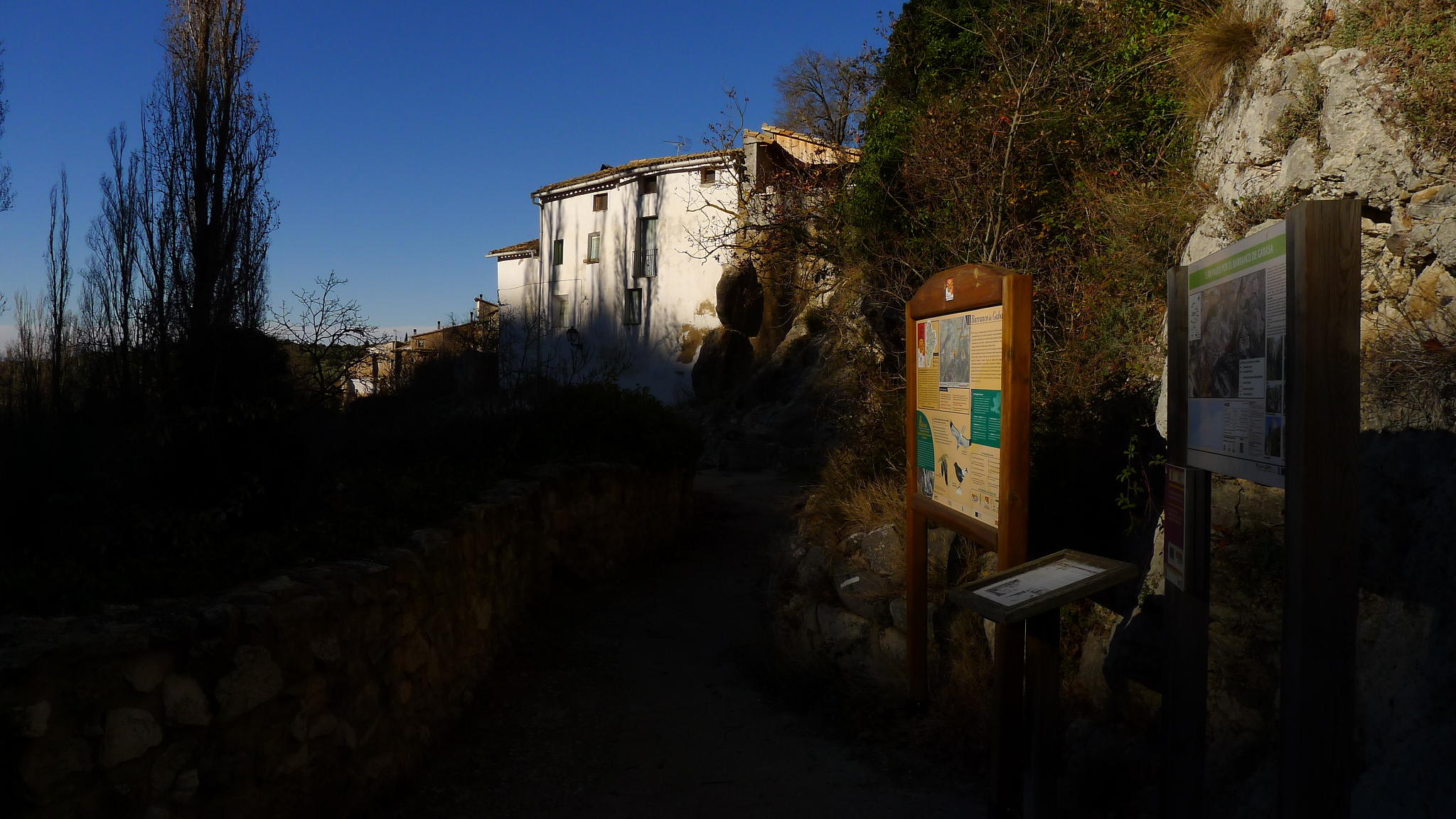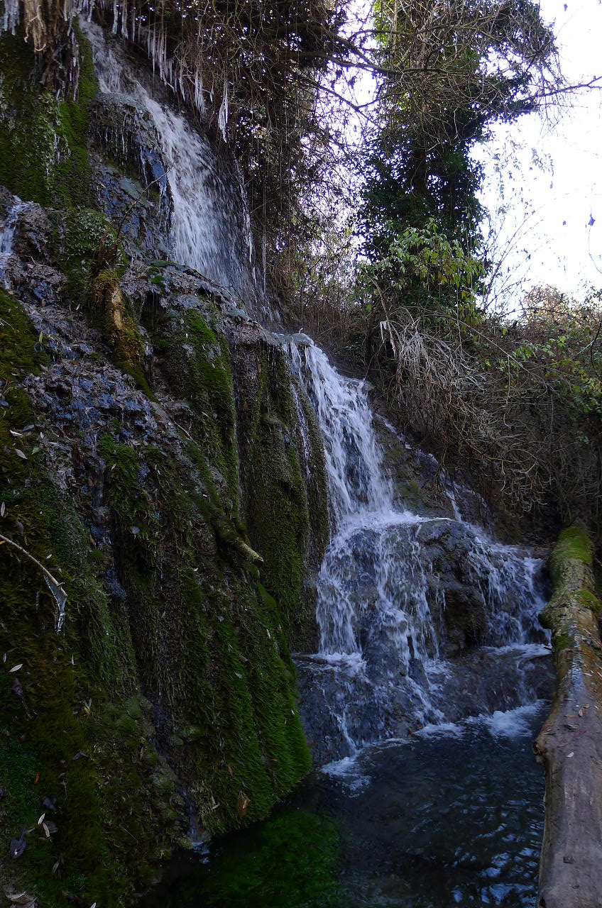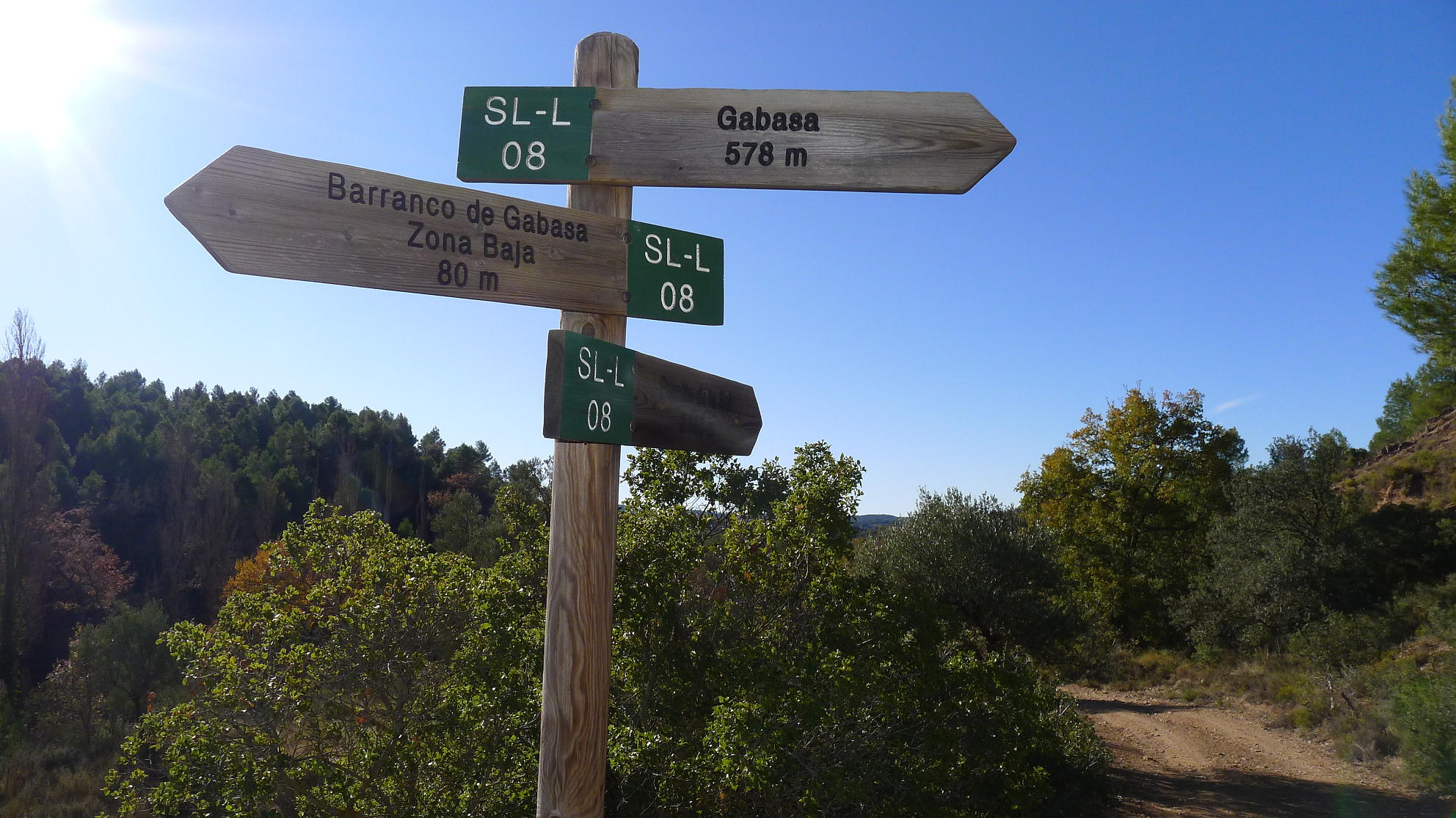 Dejo la pista y salgo a la izquierda a un campo arado (787m 2h12′) otra vez y salgo del campo por una senda a la izquierda que casi no se ve. Avanza entre carrasca y enebro y se sigue prestando mucha atención. Luego desciende por una zona más abierta directamente a la carretera de Gabasa (681m 2h37′). Sigo la carretera unos metros hacia la izquierda y ahí está el desvío señalizado a la derecha del camino SL-L-08 al barranco de Gabasa. Enseguida, a la derecha, hay una zona de bancos y carteles con información sobre el barranco de Gabasa y ahí se inicia la parte más atractiva del recorrido, un sendero acondicionado junto al barranco, un rincón de verdor y frescor, con una espectacular cascada, nacimiento del río Sosa.
