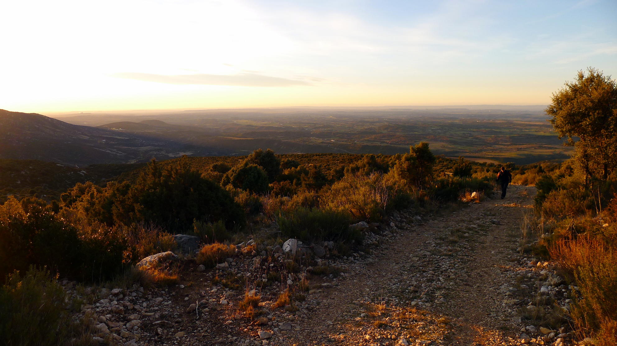Con las primeras luces del amanecer empezamos la marcha siguiendo la pista que indica hacia el Tozal de Guara. Una bifurcación (1150m) se toma a la derecha y comienza la senda que sube todo el rato con pendiente moderada. A nuestra izquierda las amplias vistas de la Hoya de Huesca y el Somontano.