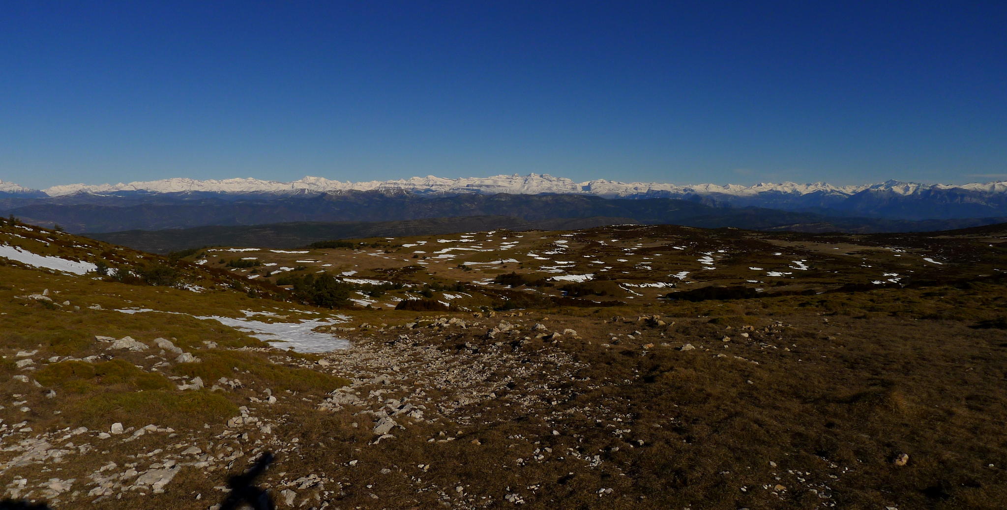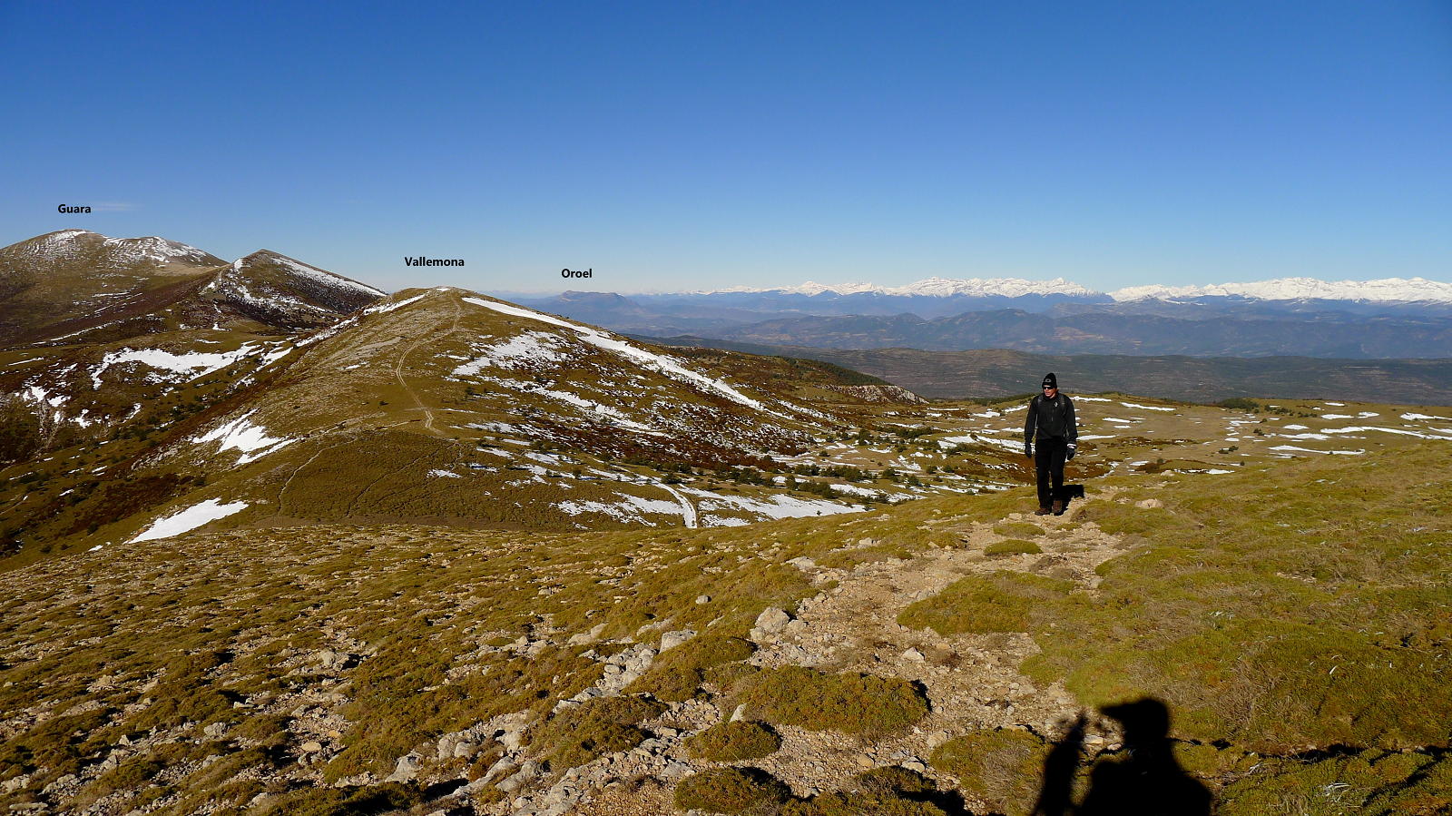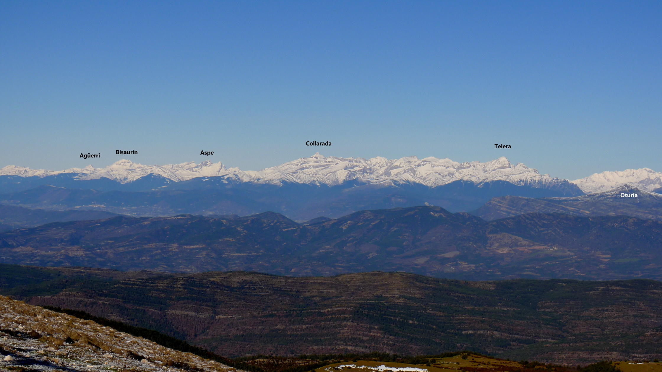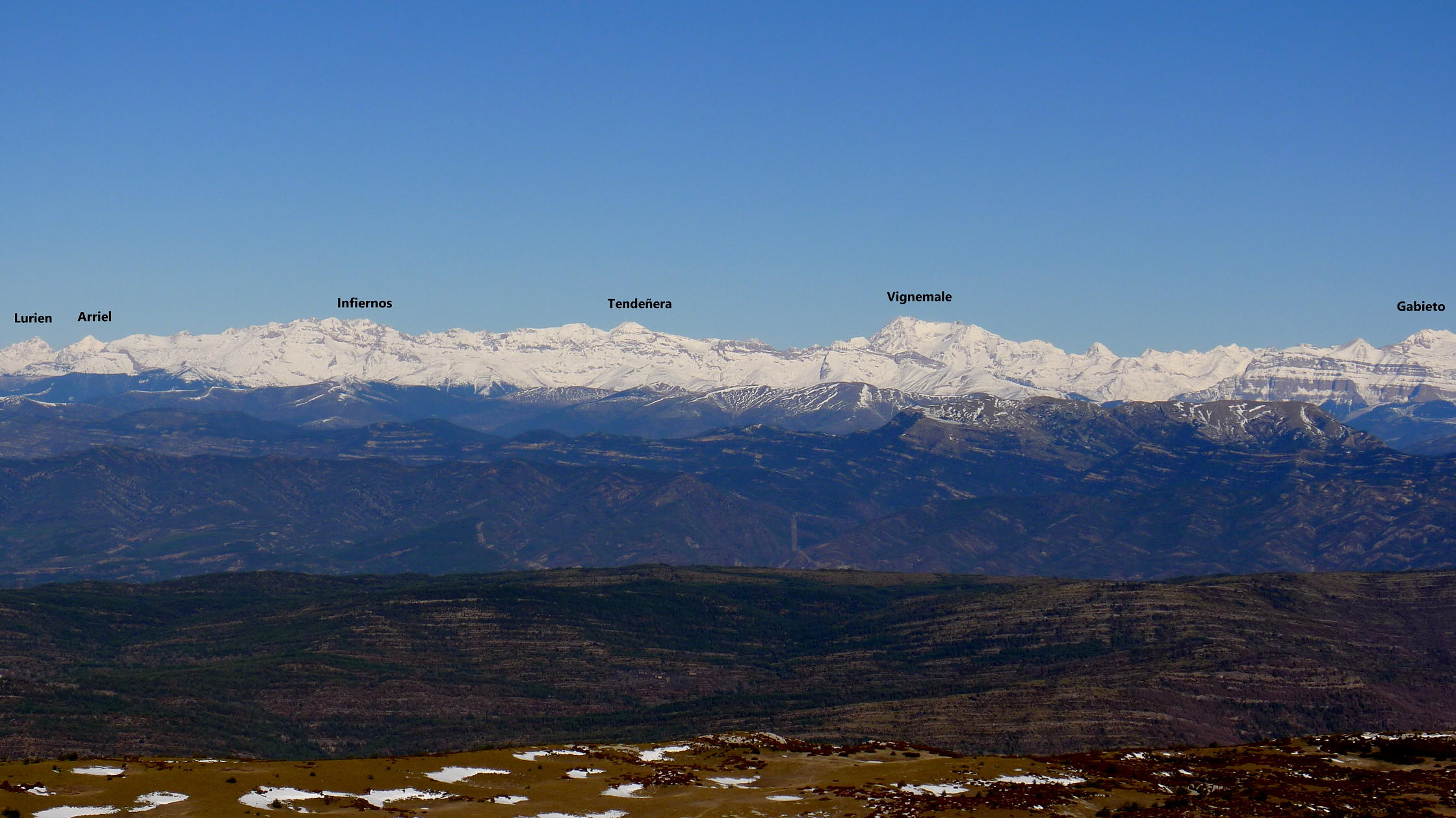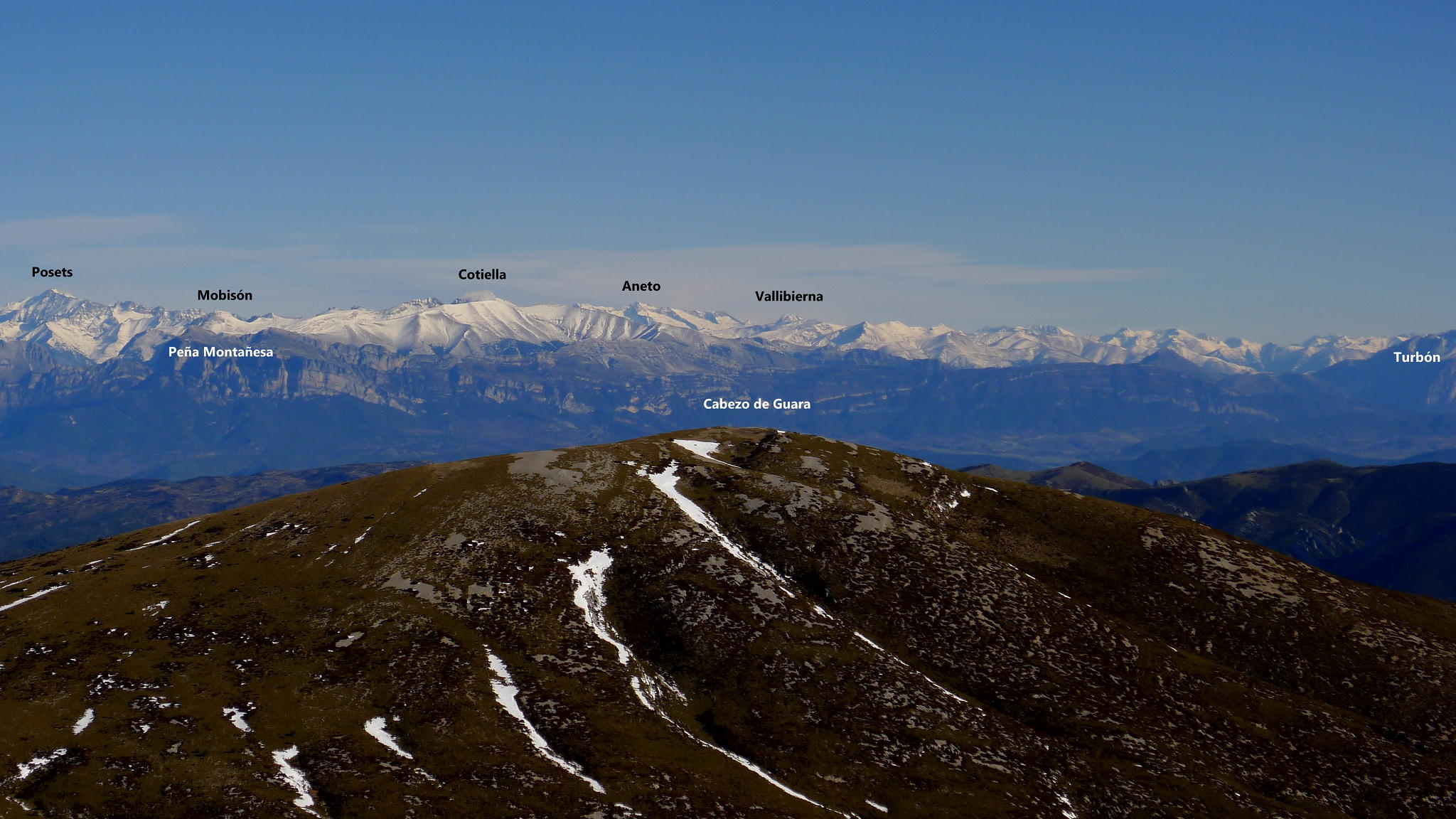 Llegamos a una segunda bifurcación (1735m) que, a la izquierda, se dirige directo hacia el Tozal de Guara; nosotros tomamos a la derecha el ramal que sube al collado. Jorge nos esperará en esta bifurcación a la bajada. La llegada al collado nos ofrece una vista imponente del Pirineo oscense. Desde el Cuello de la Cruceta de Cubilás (1805m 3h49′) se toma la cresta a la derecha con nuestro objetivo a la vista y fácilmente accesible.