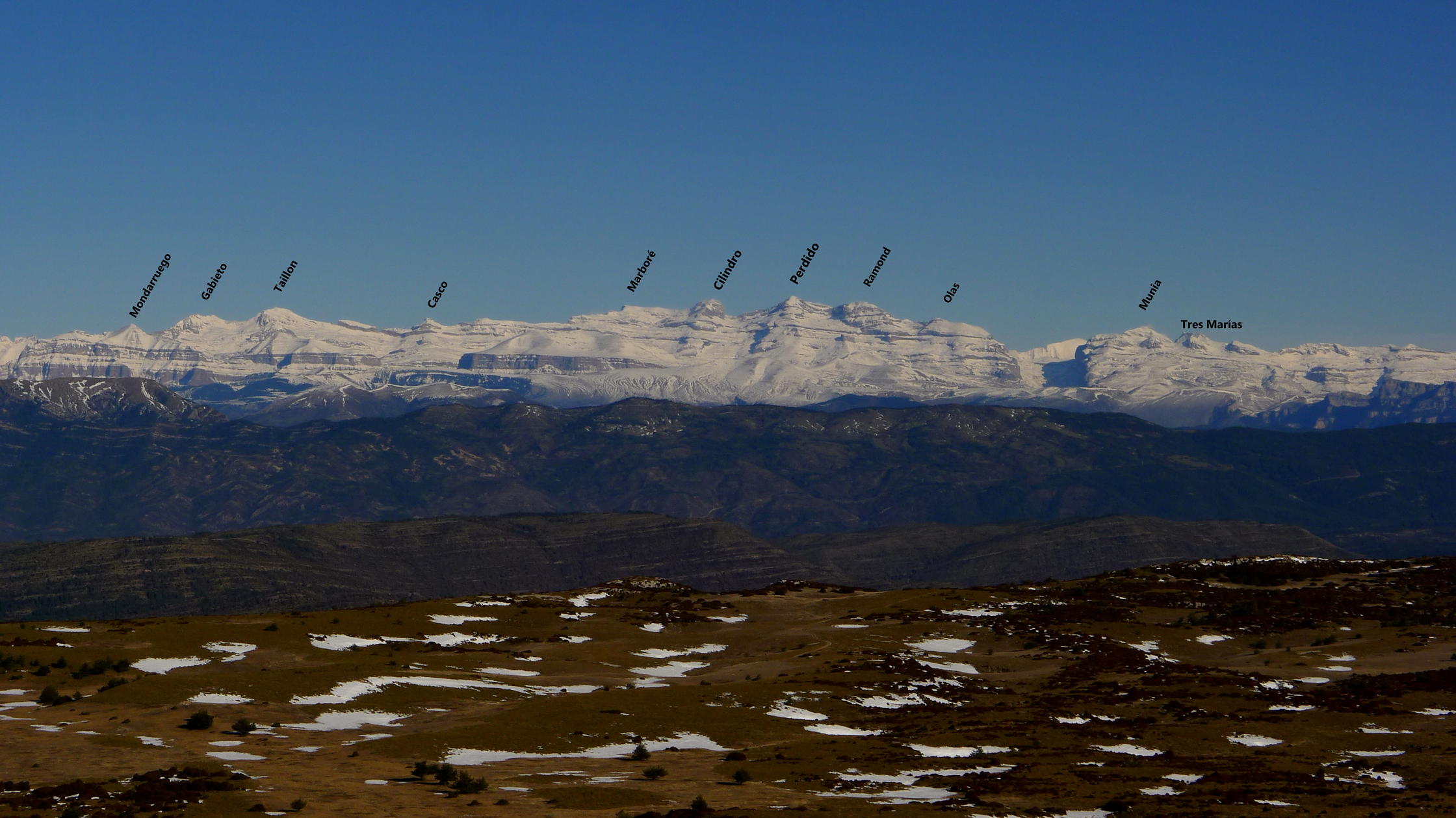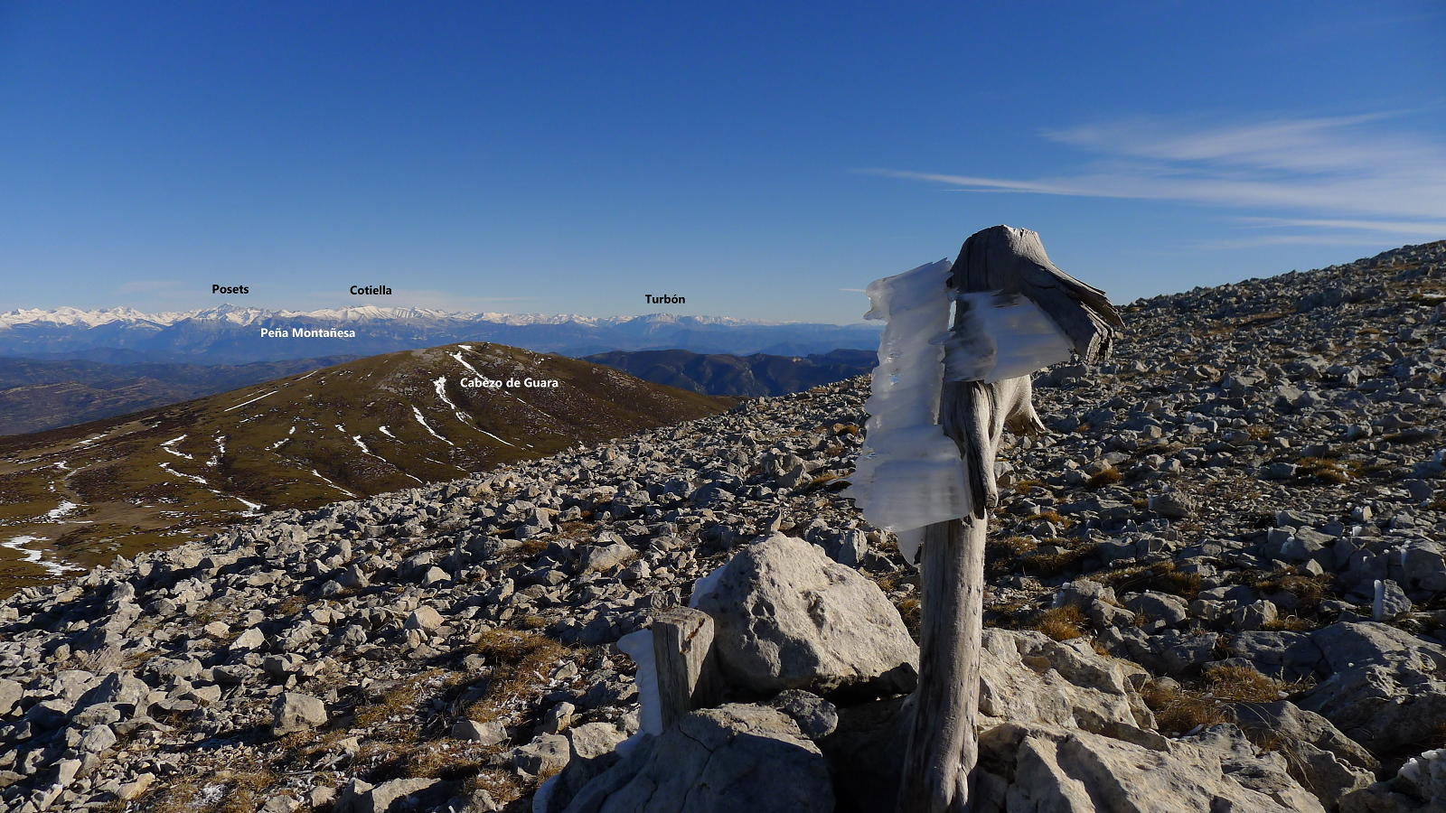 Otra cita navideña con la sierra de Guara. Pensaba que el día iba a ser ventoso y que nos iba a hacer dura la subida, sobre todo en la cresta, donde el viento norte azota con fuerza y te deja helado; al amanecer, con -5º, empezó a soplar confirmando mis pronósticos, pero por suerte fue amainando y tuvimos un día espléndido en la cumbre.