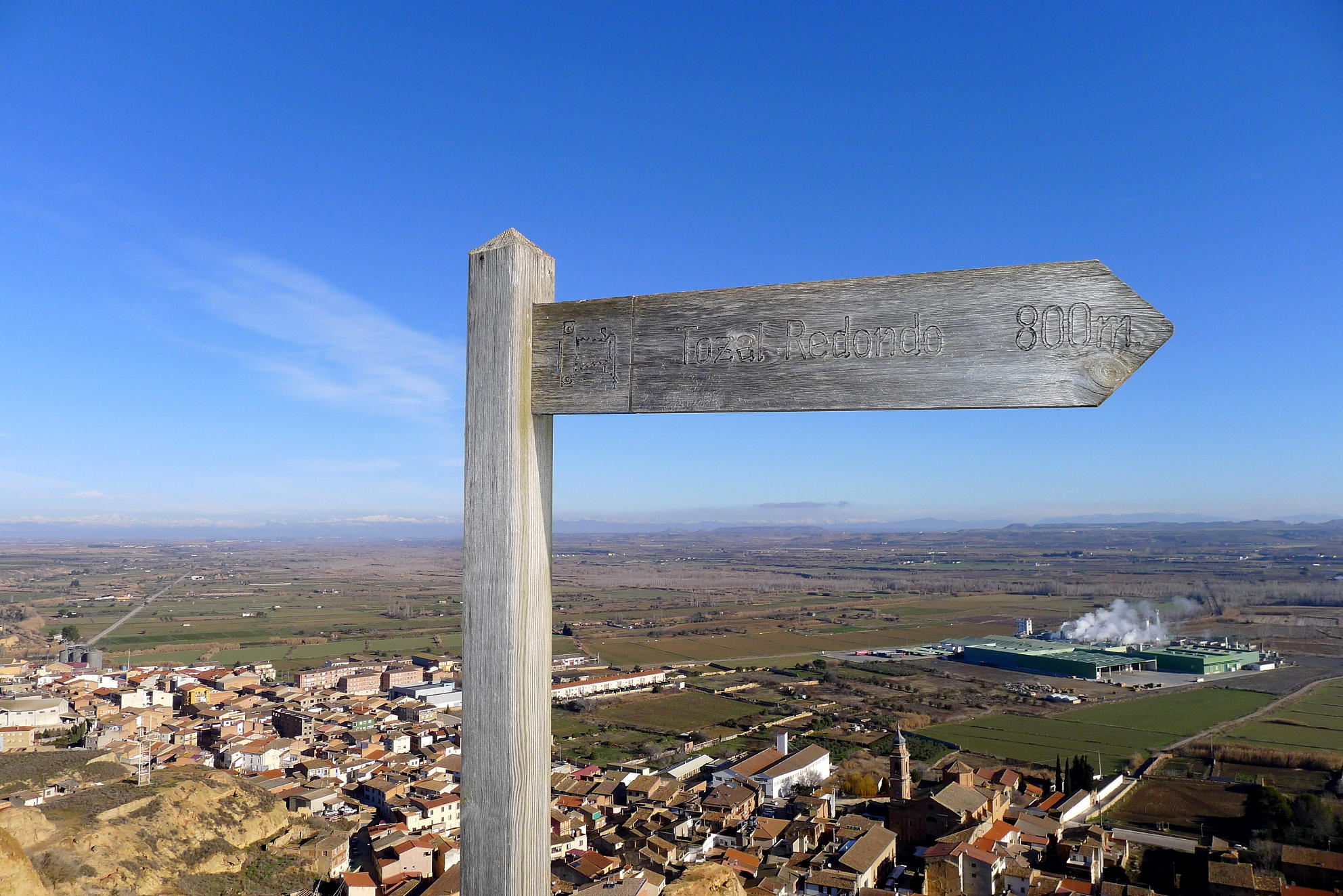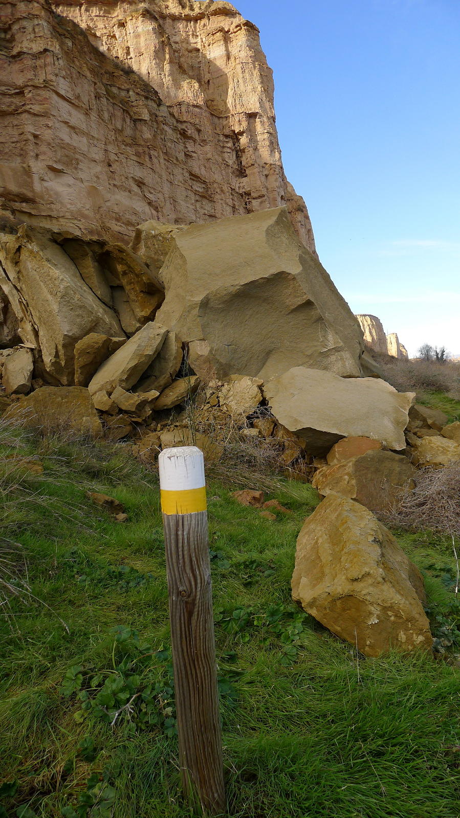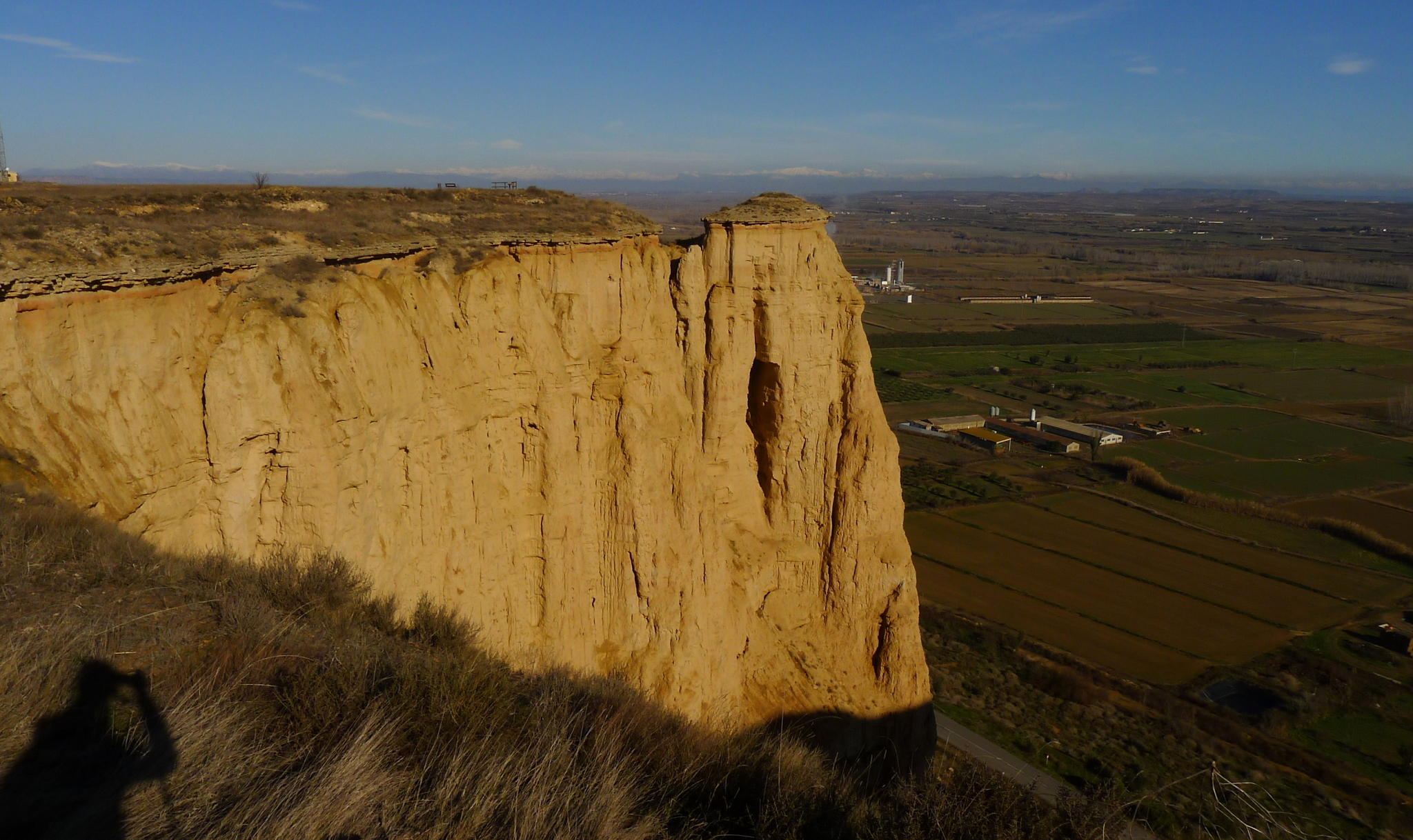 Desde allí se toma una pista que recorre la parte superior de las Ripas, pasa junto a unas antenas y llega a una curiosa formación que es el Tozal Redondo (288m 0h49′). En vez de seguir la pista nos vamos pegados al borde del cortado, pero pasa a ser un campo arado y con la fusión de la nieve de la semana pasada está muy embarrado; se hace pesado andar con un kilo de barro pegado a la bota, así que nos volvemos a la pista.