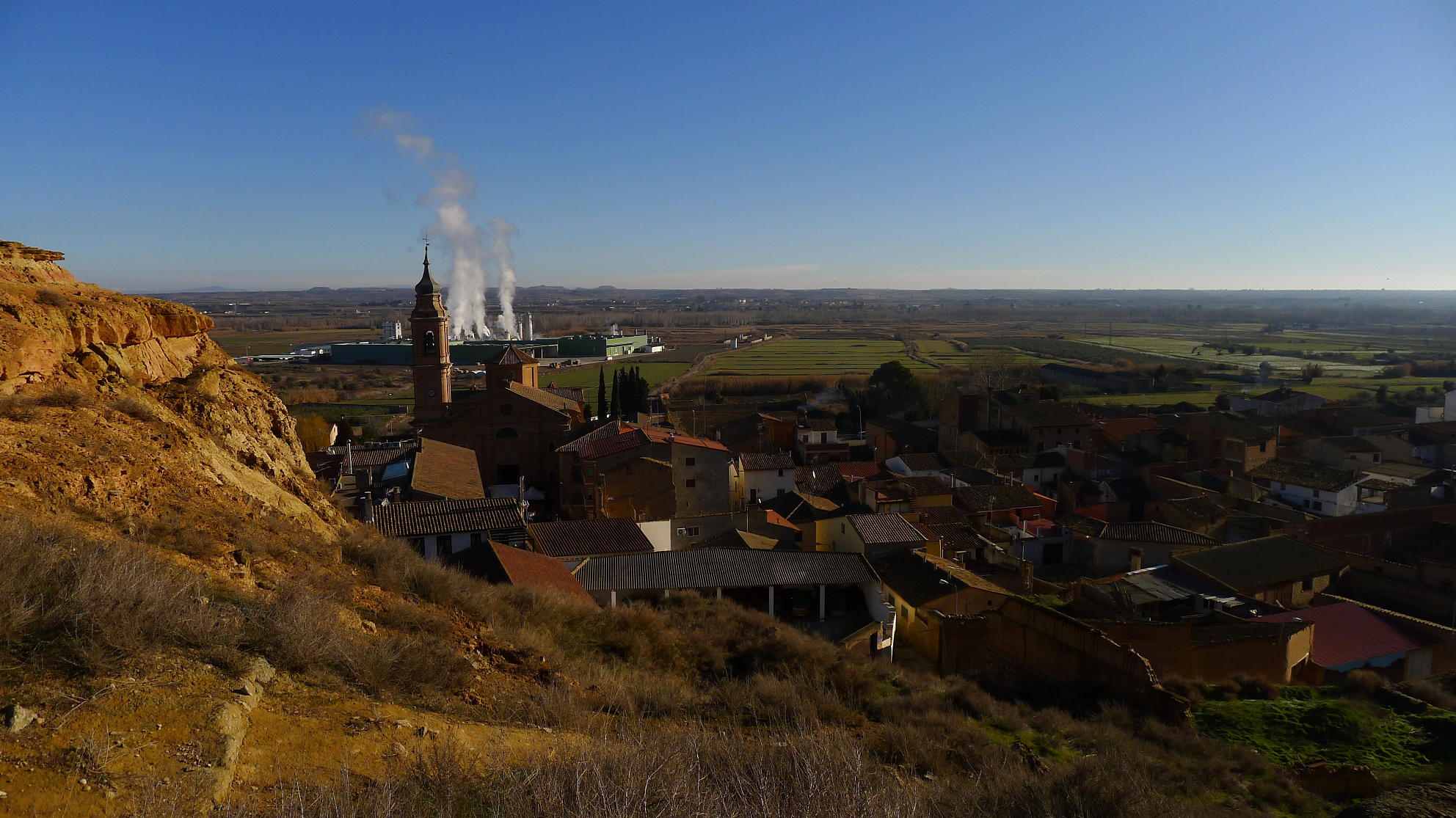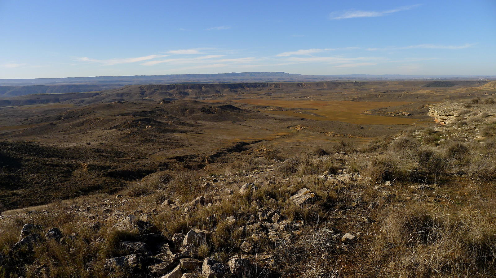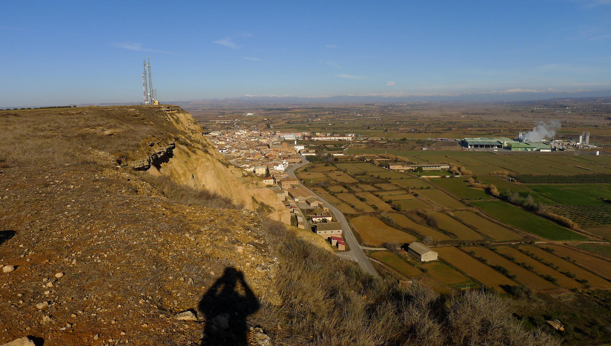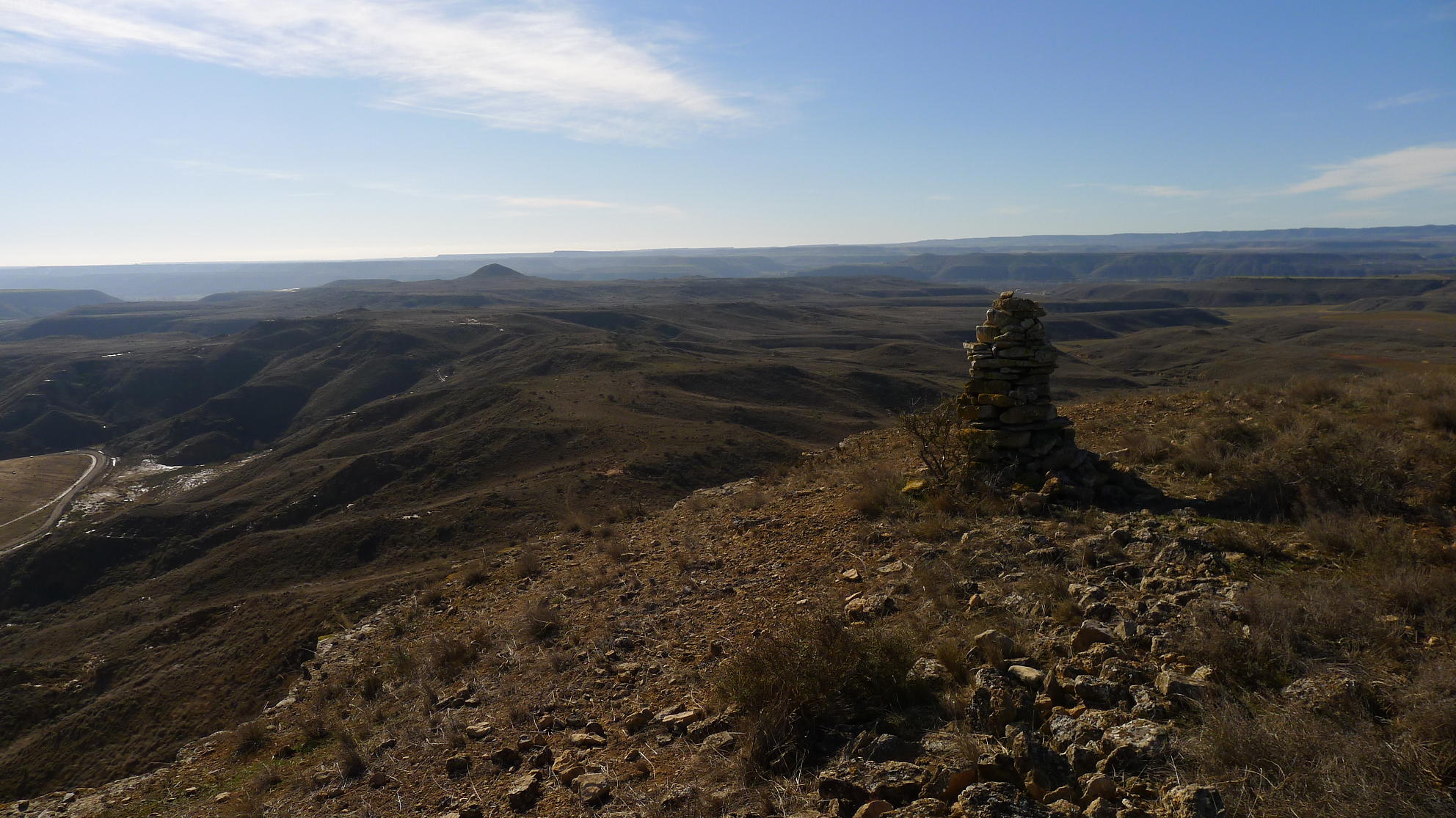 Desde allí se toma una pista que recorre la parte superior de las Ripas, pasa junto a unas antenas y llega a una curiosa formación que es el Tozal Redondo (288m 0h49′). En vez de seguir la pista nos vamos pegados al borde del cortado, pero pasa a ser un campo arado y con la fusión de la nieve de la semana pasada está muy embarrado; se hace pesado andar con un kilo de barro pegado a la bota, así que nos volvemos a la pista.