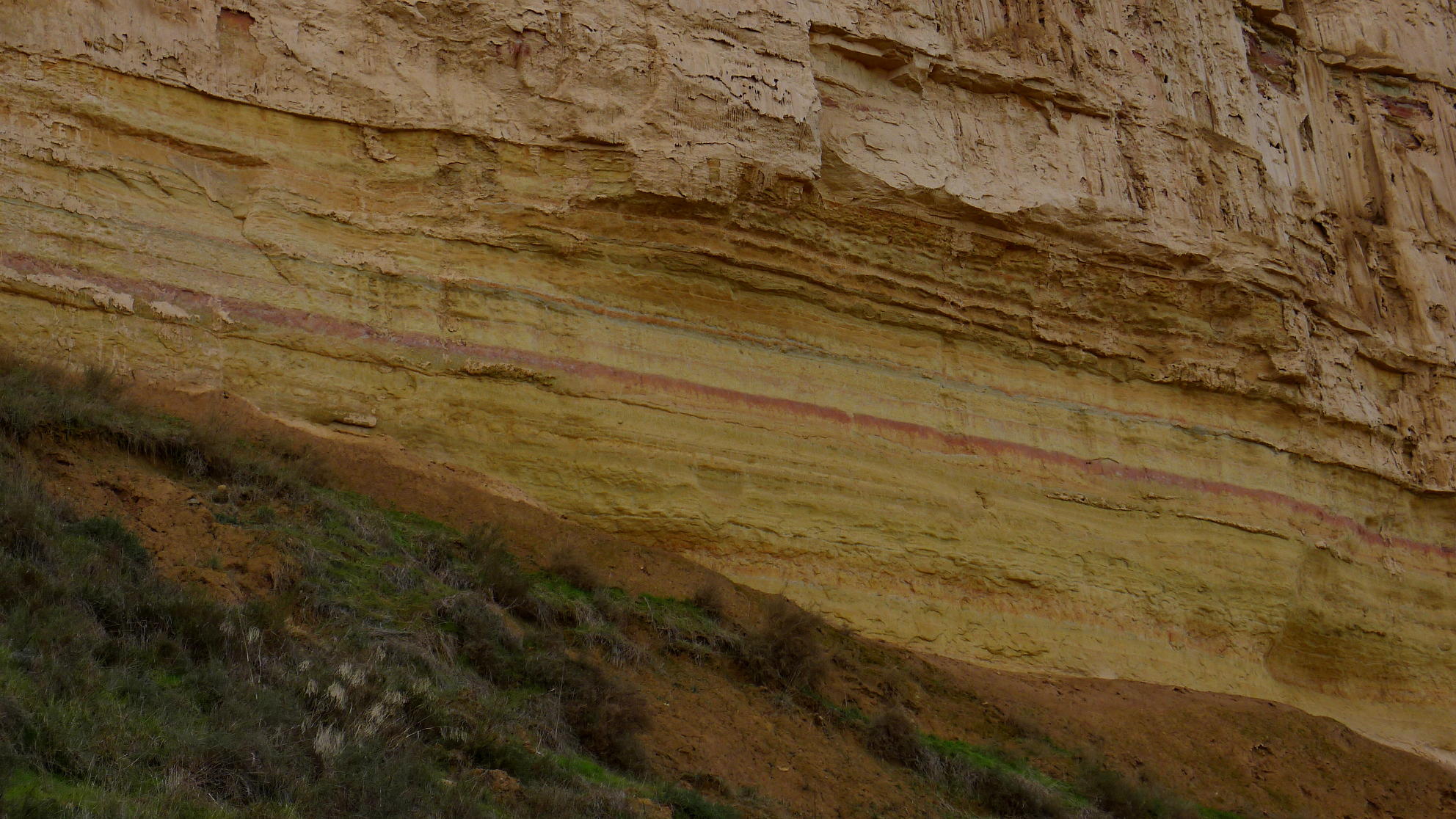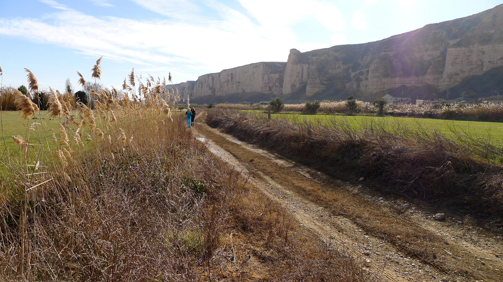 Seguimos un poco la carretera ya de vuelta hacia Alcolea, pero vemos que justo bajo las Ripas, hay postes que señalizan un PR discurriendo entre la hierba. Hay que fijarse bien en la muralla rocosa donde hay unos curiosos estratos de colores. Después cruzamos la carretera para tomar un agradable camino que discurre junto a una acequia (180m 2h56′) y nos lleva tranquilamente al pueblo, entrando ya en la Plaza Mayor de Alcolea (186m 3h31′)