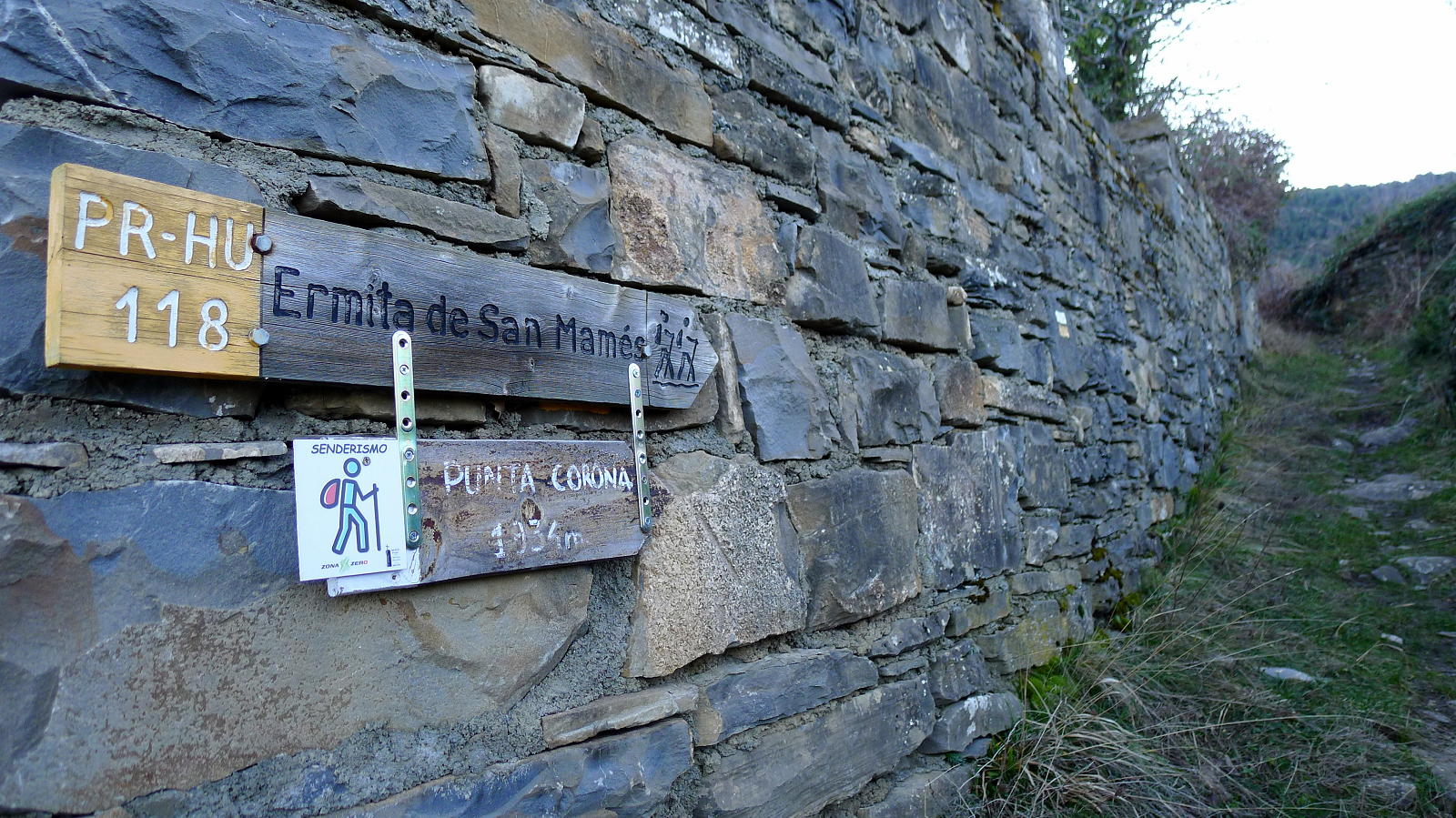 En Asín de Broto (1110m) salgo siguiendo los carteles de PR-HU-118 hacia la ermita de San Mamés y Punta Corona. Un camino empedrado sube con buena pendiente. Un poco más arriba (1185m) dejo a la derecha el camino a San Mamés, por el que bajaré, y sigo a la izquierda hacia arriba, cerca del cauce del barranco del Lugar (curioso nombre). Después se une otro camino desde la izquierda (1335m 0h27′) que también viene de Asín. Termina la senda empedrada, pero el camino sigue siendo bueno y está balizado con hitos.