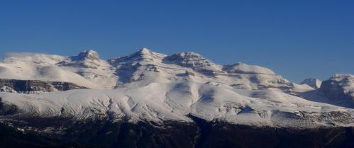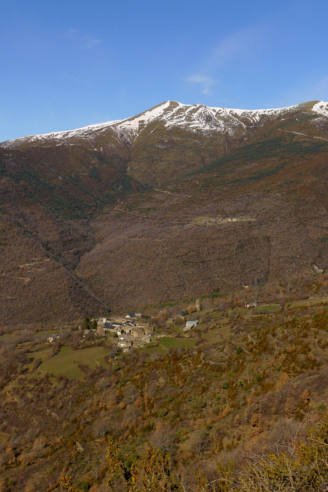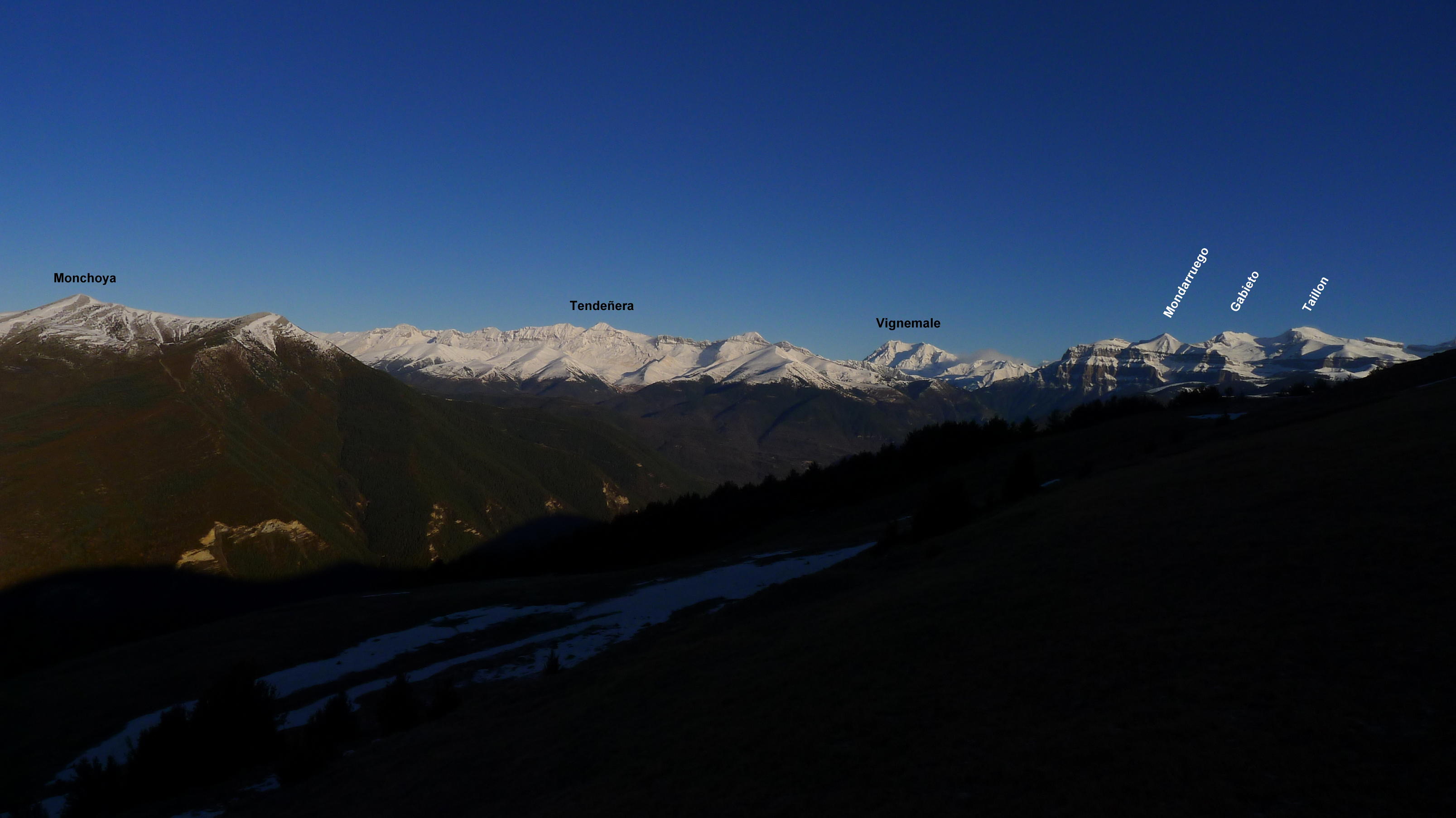 Después de 3 fines de semana de mal tiempo, por fin sale un domingo soleado, ventana de buen tiempo entre un sábado lluvioso y un domingo por la tarde ya muy nublado. Así que, deseando salir al monte, subo estos picos de la sierra de la Corona, al este del río Ara, con unas vistas espectaculares del macizo de Monte Perdido, y en soledad absoluta. Haré una ruta circular, con una subida directa y un descenso que pasa por la ermita de San Mamés.