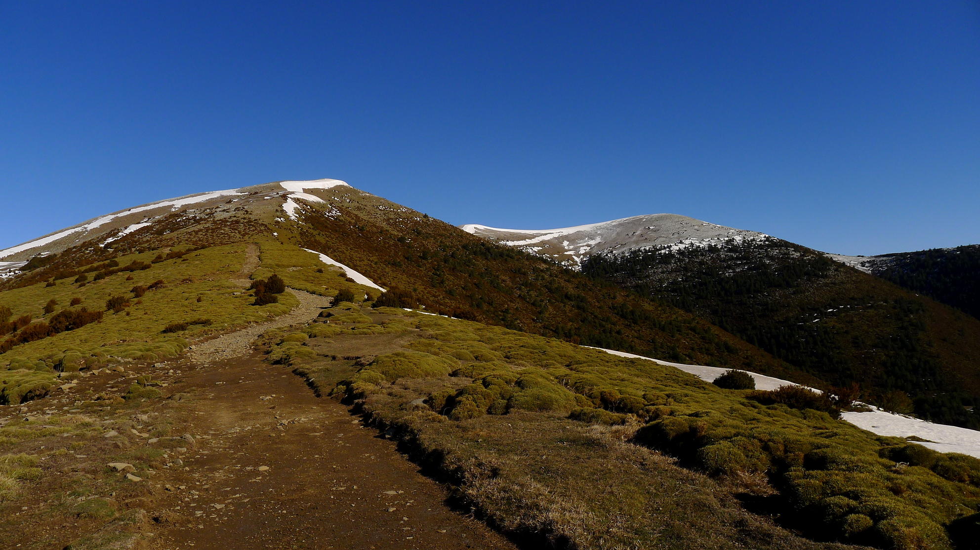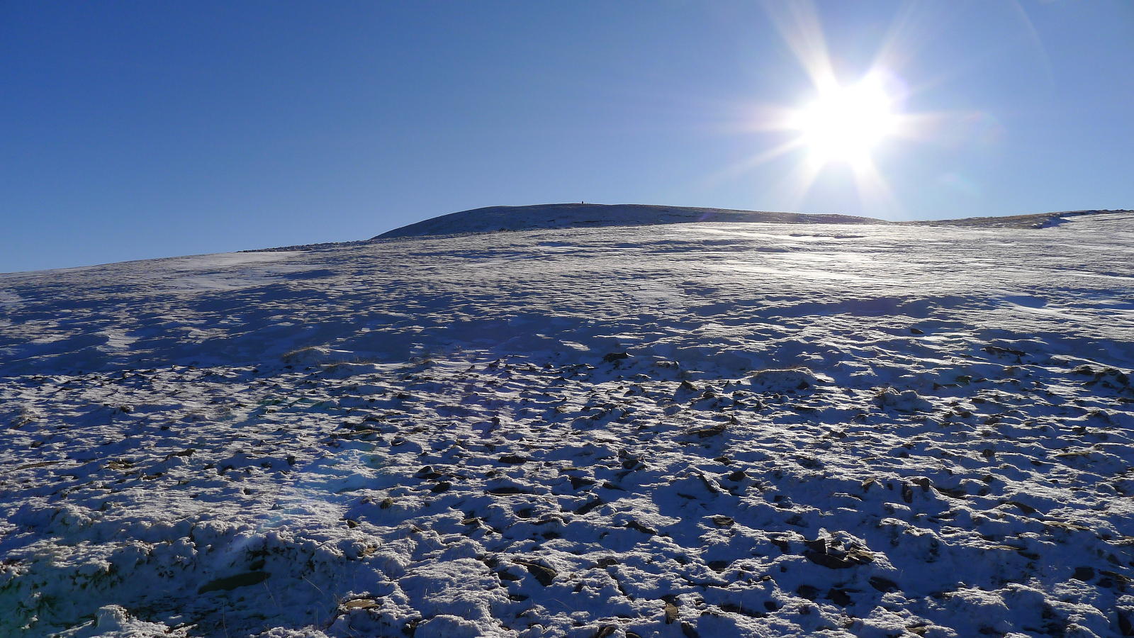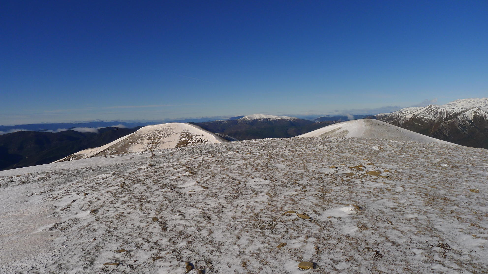 Llego a una zona de prados (1490m 0h45′) algo encharcados, es un poco confuso pero ahí arriba hay un cartel y se recupera el camino claro. Tengo referencia de que se puede subir derecho la ladera, así que dejo el camino (1563m 0h53′) y tiro recto por laderas herbosas, con pendiente fuerte pero nada problemática, incluso aunque está cubierta de una capilla de nieve, lo justo para seguir sin crampones (que llevo en la mochila por si acaso). Cruzo varias veces el camino y llego a la Corona o Punta Fobions (1934m 1h32′), con una vista estupenda y un sol precioso pero un viento helador.