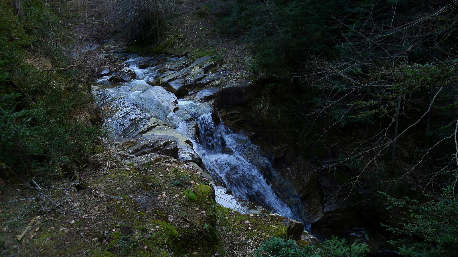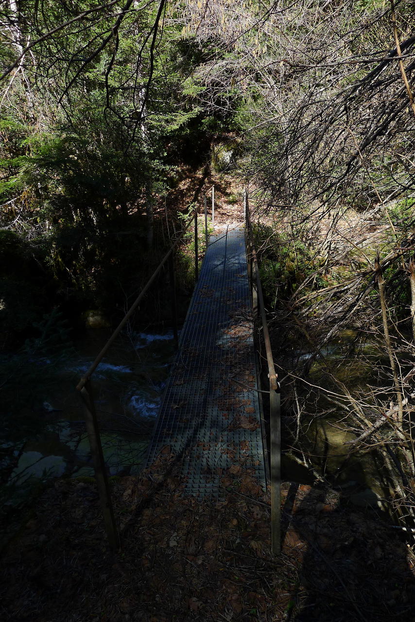 Este camino, a la sombra de frondosos pinos, se introduce en la orilla derecha del barranco de Arán. Es uno de los tramos más bonitos de la ruta. Hay una gran cascada (1320m 1h00′) en la otra orilla y continúa el Paso del Onso, con barandillas a mi derecha y saltos de agua y pequeñas cascadas ruidosas. Finalmente una pasarela (1325m 1h05′) atraviesa el barranco.