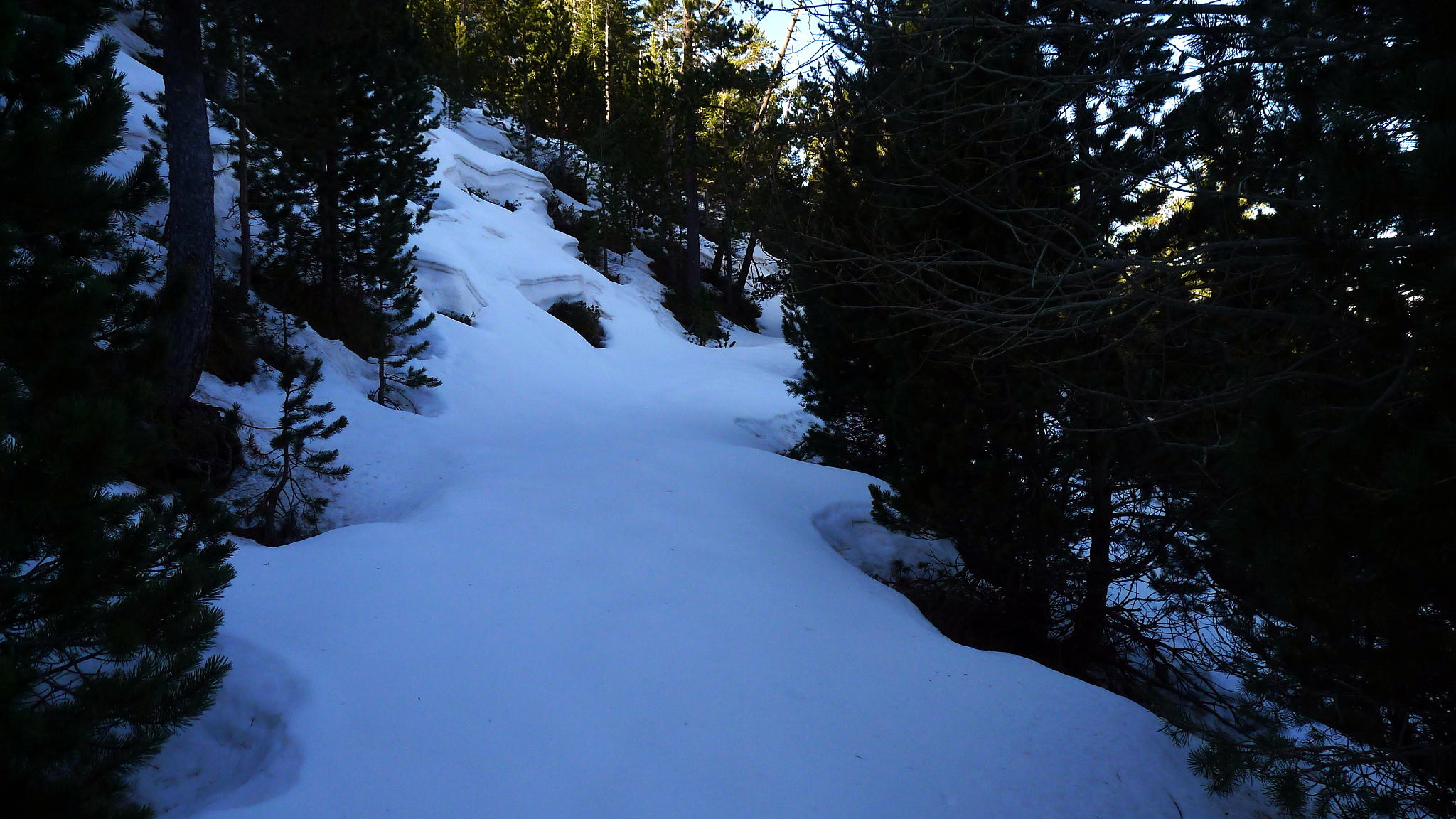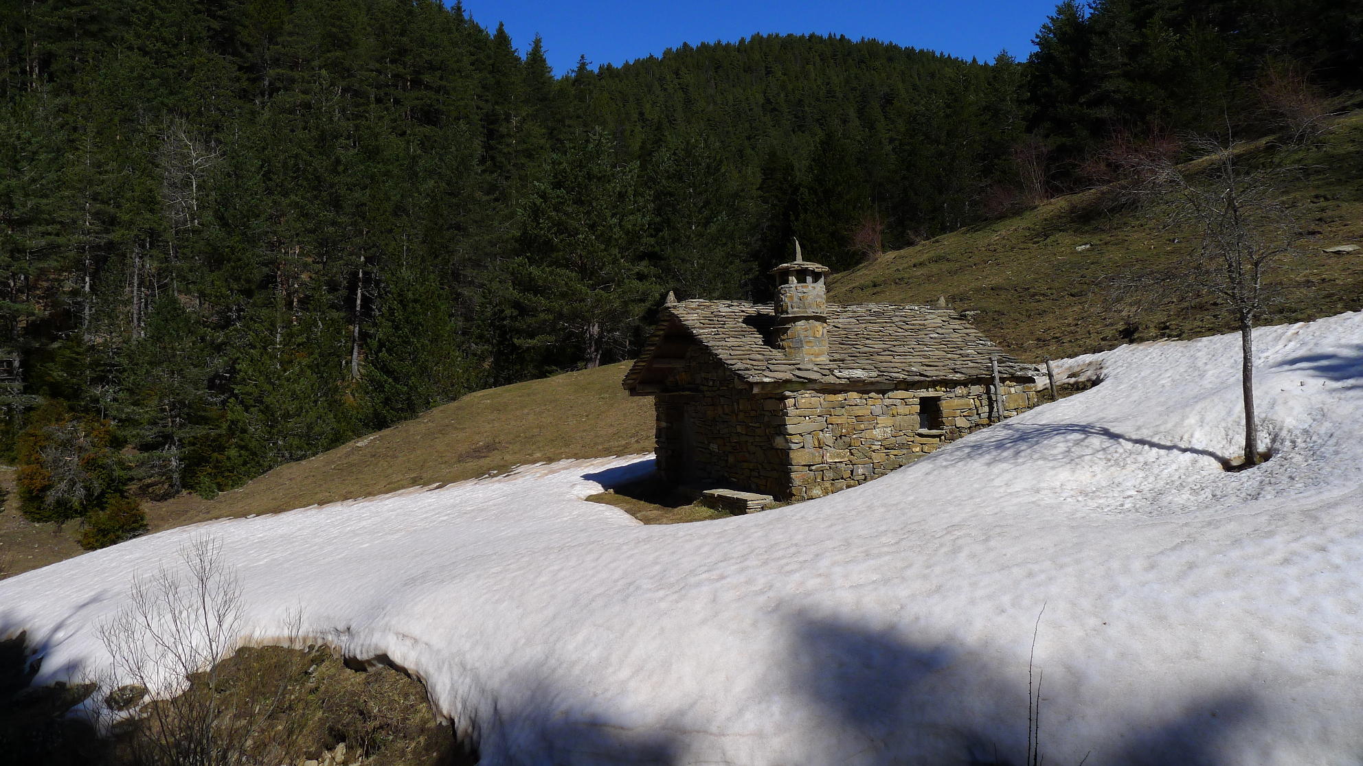 Al otro lado, una pista se ataja inmediatamente por una pendiente trocha que vuelve a salir a la pista. Ahora ya hay que seguirla por varios kilómetros. Al cruzar el barranco lateral de Chate, en curva a izquierda, empieza a haber nieve. Está bastante dura, pero no resbala apenas. Me planteo que si aquí ya hay nieve, qué será por arriba, pero bueno, si se pone peor ya decidiré. Por suerte, aunque hay mucha nieve de aquí en adelante, no voy a tener problemas en la progresión. Más arriba, en otra curva a izquierda, atravieso el barranco de Arán por un vado (1580m) y enseguida encuentro a la derecha el refugio de Femallas (1595m 1h33′).