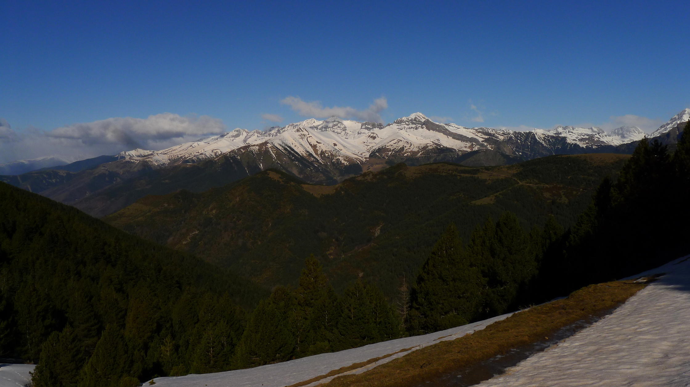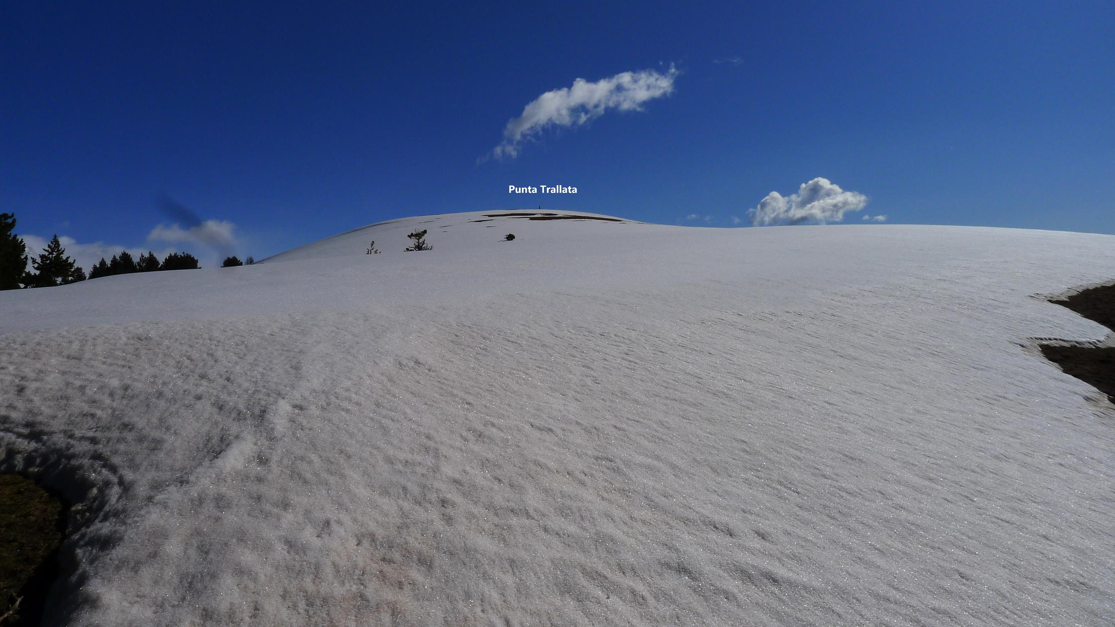 Llego al collado SW (1850m 2h24′) que separa la Punta Trallata de la Punta Estralieto y giro a la izquierda para subir una gran ladera de hierba con bastante pendiente, fuera de sendero. Después se pasa entre algún pino y arbusto de enebro y encaro el gran lomo nevado que me lleva a cima de Punta Trallata (2026m 2h41′), disfrutando de una panorámica extraordinaria y muy satisfecho porque no tenía nada claro poder llegar.
