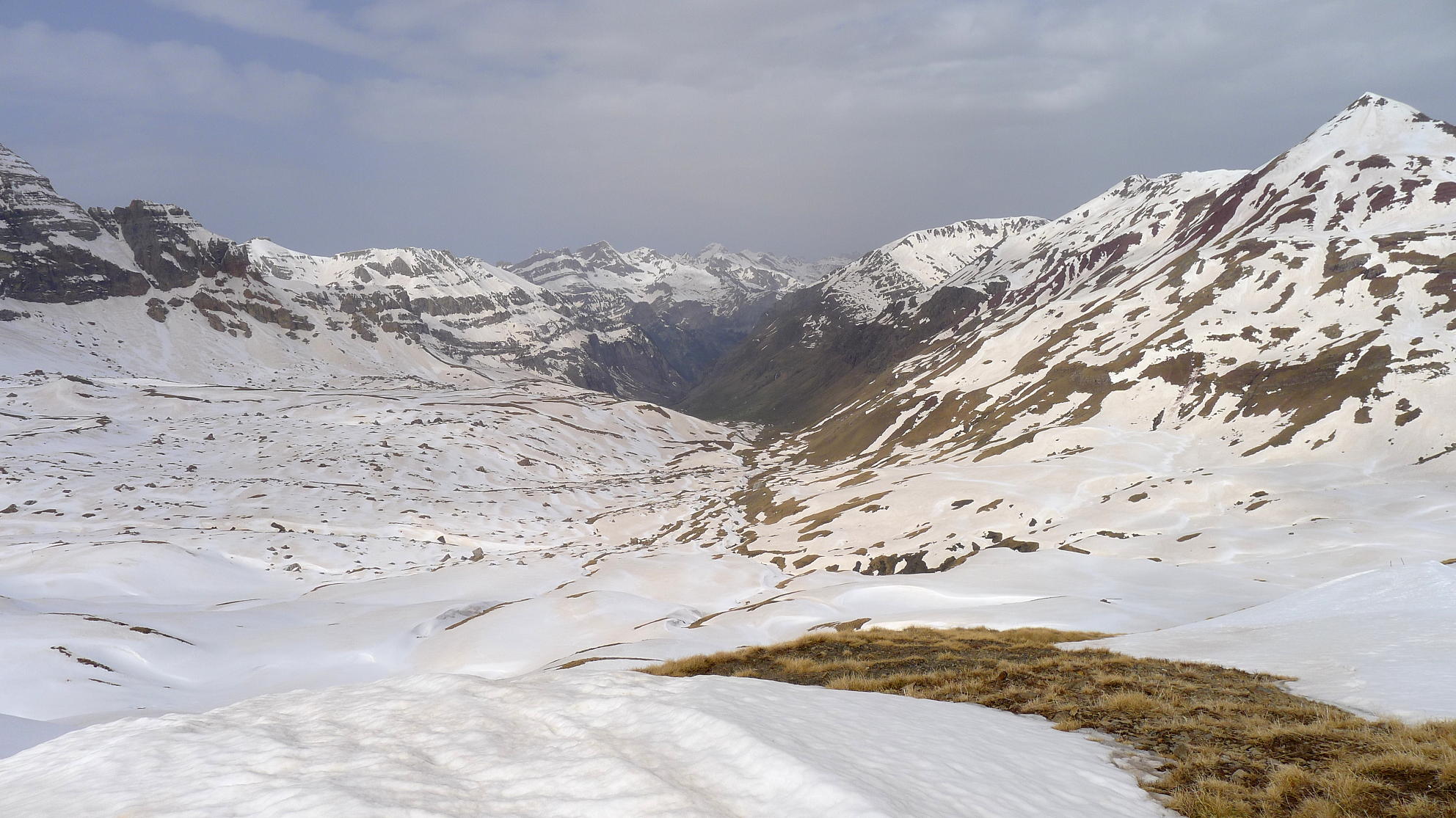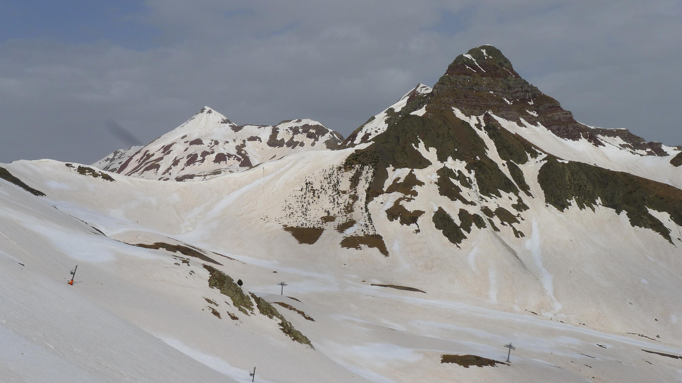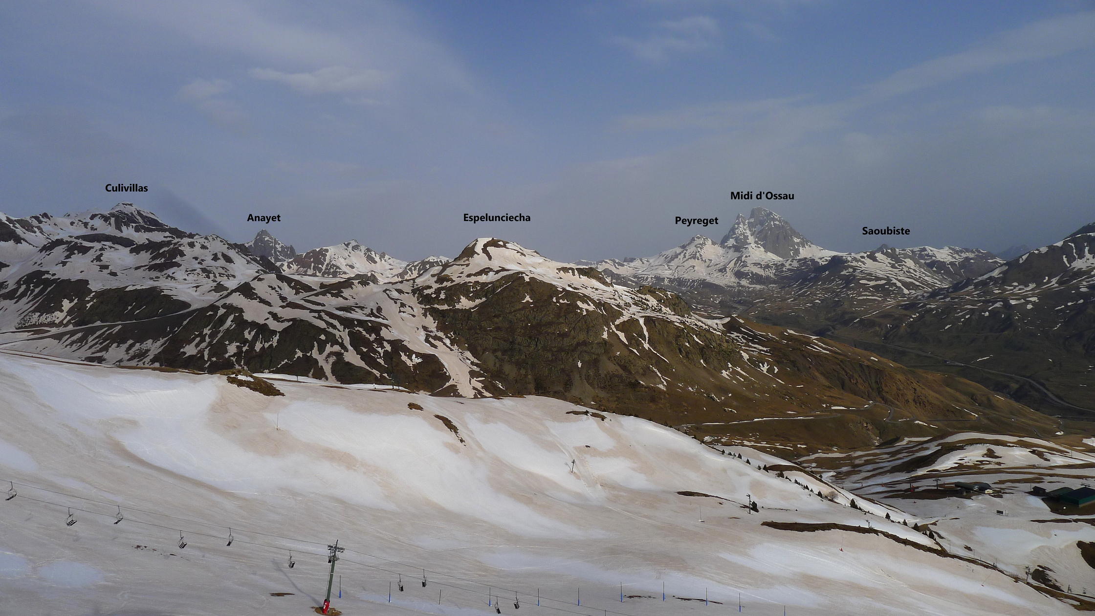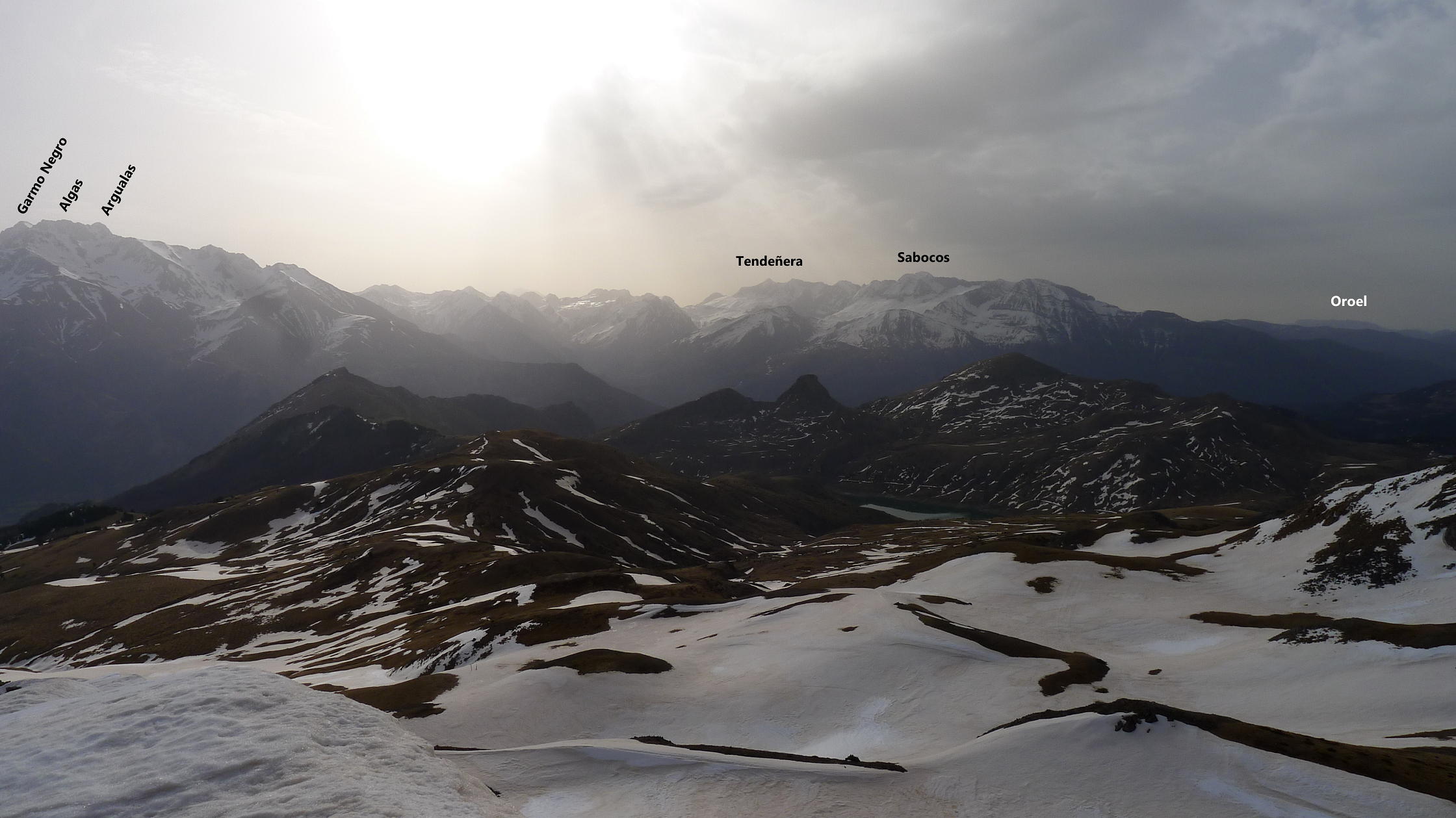 Descripción de la ruta: Tenemos que dejar los coches en este aparcamiento (1555m) junto a la carretera general y andar toda la carreterilla hasta el vacío parking de Sarrios (1785m 0h51′), donde ya nos encontramos las pistas nevadas y calzamos los crampones. Subimos en dirección SE hasta un colladito al NE del pico Sorpena 2100m 1h48′) desde el que subimos un pico hacia el NE que nosotros creíamos que era el pico Sorpena, pero que es solo un hombro (Hombro NE del Sorpena 2112m 1h53′). Así que volvemos al collado y hacia el SW, pasando por el final de un telesilla (2166m 2h05′) ahora sí coronamos el pico Sorpena (2251m 2h20′).