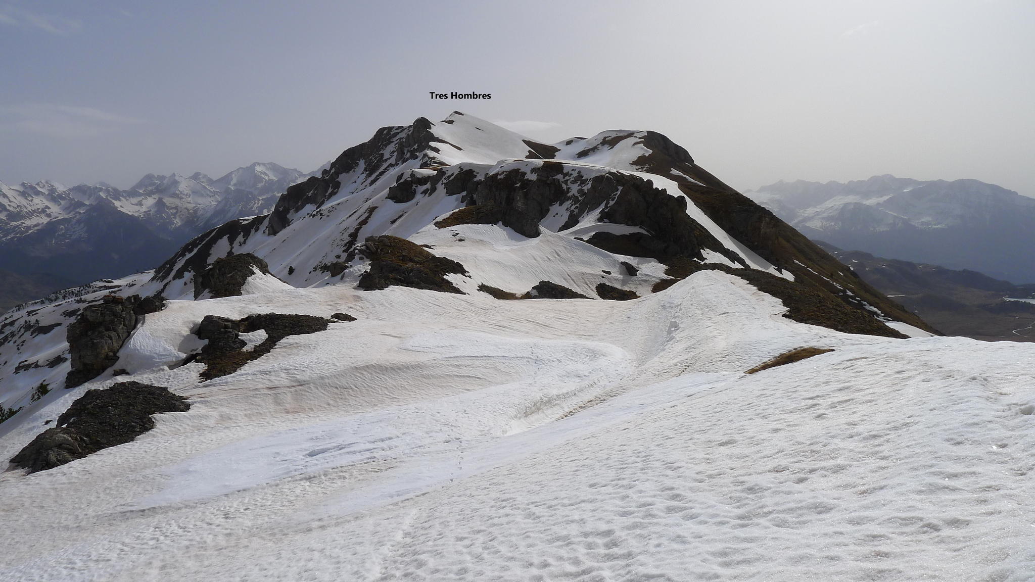 Descendemos al siguiente collado (2205m 2h33′) entre Sorpena y Tres Hombres y ascendemos el pico Tres Hombres (2276m 2h52′). Nos queda un largo cresteo con subidas y bajadas suaves hasta encarar la subida final al pico Tres Güegas (2303m 4h05′).