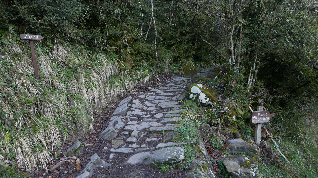 Descripción de la ruta: Desde el aparcamiento junto al puente del río Sorrosal (1215m) sigo el camino que sale hacia el norte. enseguida gira a la derecha para pasar un puente sobre el barranco de Toronzué (1232m 0h03′) y continúa por la orilla derecha del Sorrosal, siendo un agradable camino empedrado por el que veo un par de corzos. Suave subida hasta una bifurcación a la izquierda hacia Soaso (1347m 0h26′) y, más arriba, tras unas cascadas, paso a la otra orilla por el puente de piedra Pasata (1500m 0h54′).