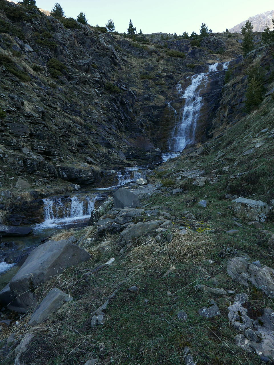 En unos metros se gira a la derecha, dejo una cascada señalizada a mi izquierda (ya la he visto otras veces) y asciendo por unos atajos que desembocan en una pista (1542m 0h59′). Esta pista va al refugio Planas de Abozo o de Sorrosal, pero me desvío a la derecha un poco antes del refugio para avanzar campo a través al E y NE hacia el barranco de las Sarriesas. Encuentro una senda (1640m 1h11′), pero la abandono cuando veo que me dirige demasiado cerca del barranco, ya que el barranco se encajona y tengo que seguirlo por esta orilla derecha pero por laderas herbosas a cierta altura. Ya no hay sendas y hay un momento en que la vegetación de enebros y rododendros dificulta el avance y hay que ir buscando la zona más despejada. En cualquier caso la línea de avance la marca el barranco que queda a mi derecha.
