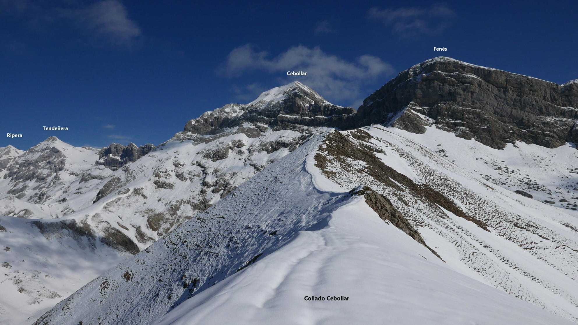 Justo antes de una bonita cascada cruzo el barranco de Sarriesas (1820m 1h43′) para ascender la ladera que se se dirige al collado del Cebollar. Comienza la nieve y me pongo los crampones. Aunque la pendiente es fuerte la nieve se nota bastante segura y, sin necesidad de piolet, alcanzo el collado del Cebollar (2225m 2h45′).