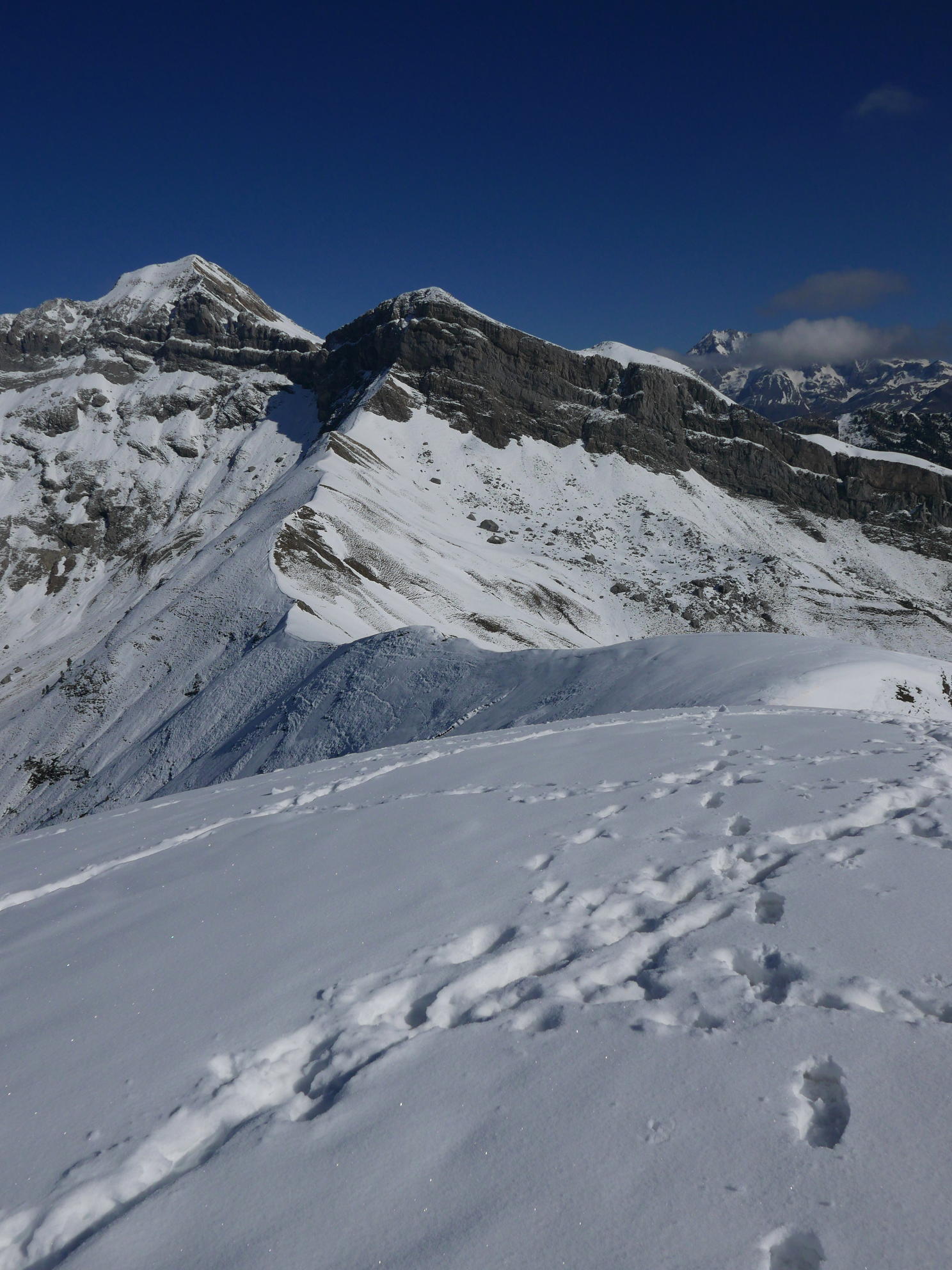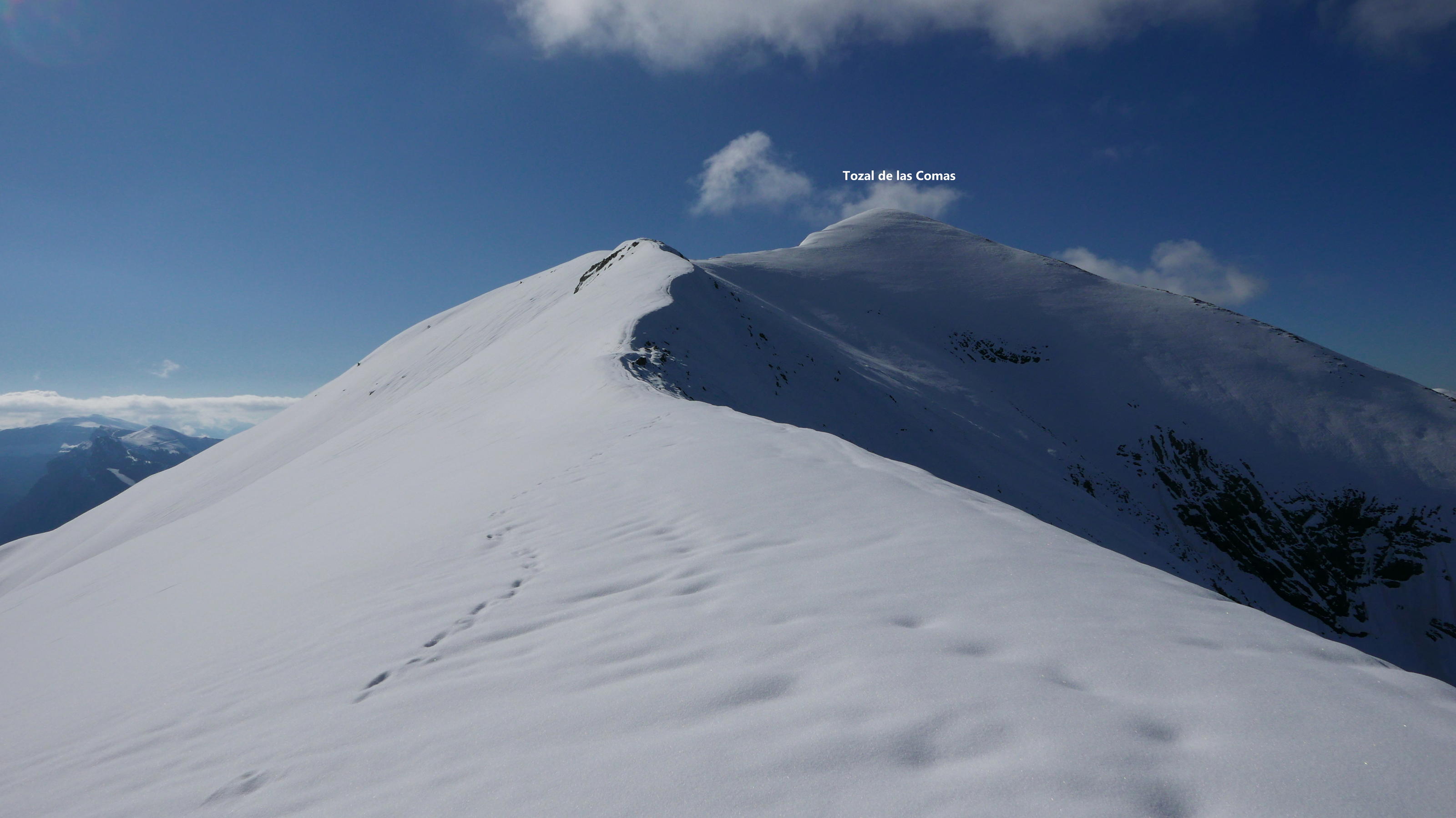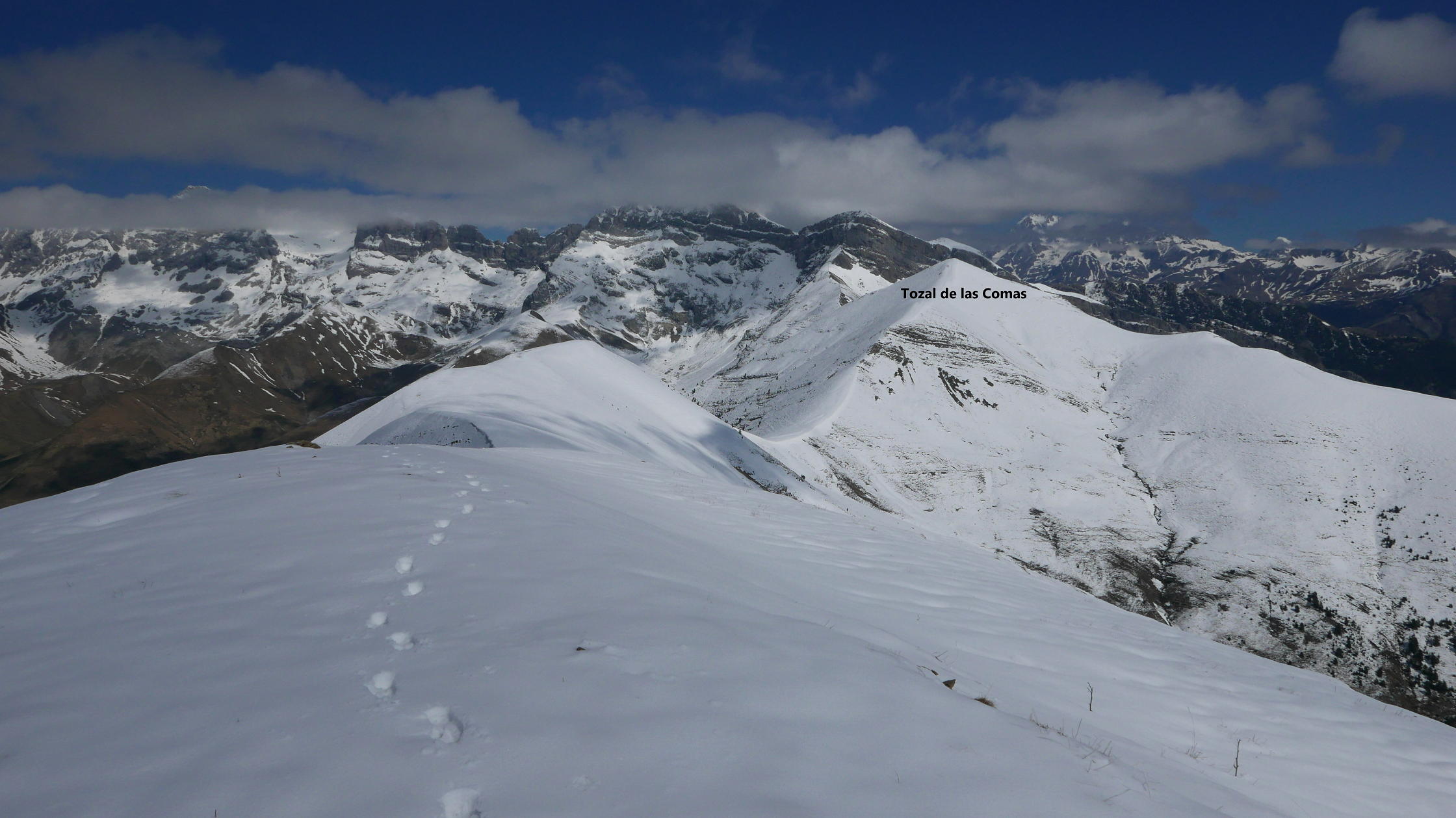 En la cresta es donde la nieve es más profunda. Veo el Tozal de las Comas como un punto inalcanzable en estas condiciones, pero no hay marcha atrás. Con paciencia y esfuerzo me voy acercando mientras admiro las preciosas vistas a mi alrededor. No hay más huella que la que yo voy marcando. La llegada a la cumbre es una gran satisfacción (Tozal de las Comas 2342m 3h12′). Pero aún me queda un tramo de cresta mucho más largo hasta el Mondiciero, así que, sin entretenerme mucho, continúo la marcha.