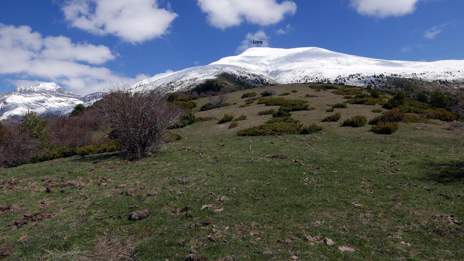 Desciendo hasta un collado (2118m 3h40′), subo una pequeña cota (2248m) y luego otra fuerte pala al Litro o Mondiciero (2299m 4h17′), pico que ya coroné la semana pasada. El descenso, por tanto, es conocido, aunque con mucha más nieve que hace 6 días. Esta parte ya está descrita en la entrada anterior (Ascenso al pico Litro). Primero por terreno abierto y luego por un sendero muy majo entre pinos y quejigos hasta desembocar en la pista y en la carretera. Solo quedan unos 700m por carretera hasta el aparcamiento (1215m 5h46′)