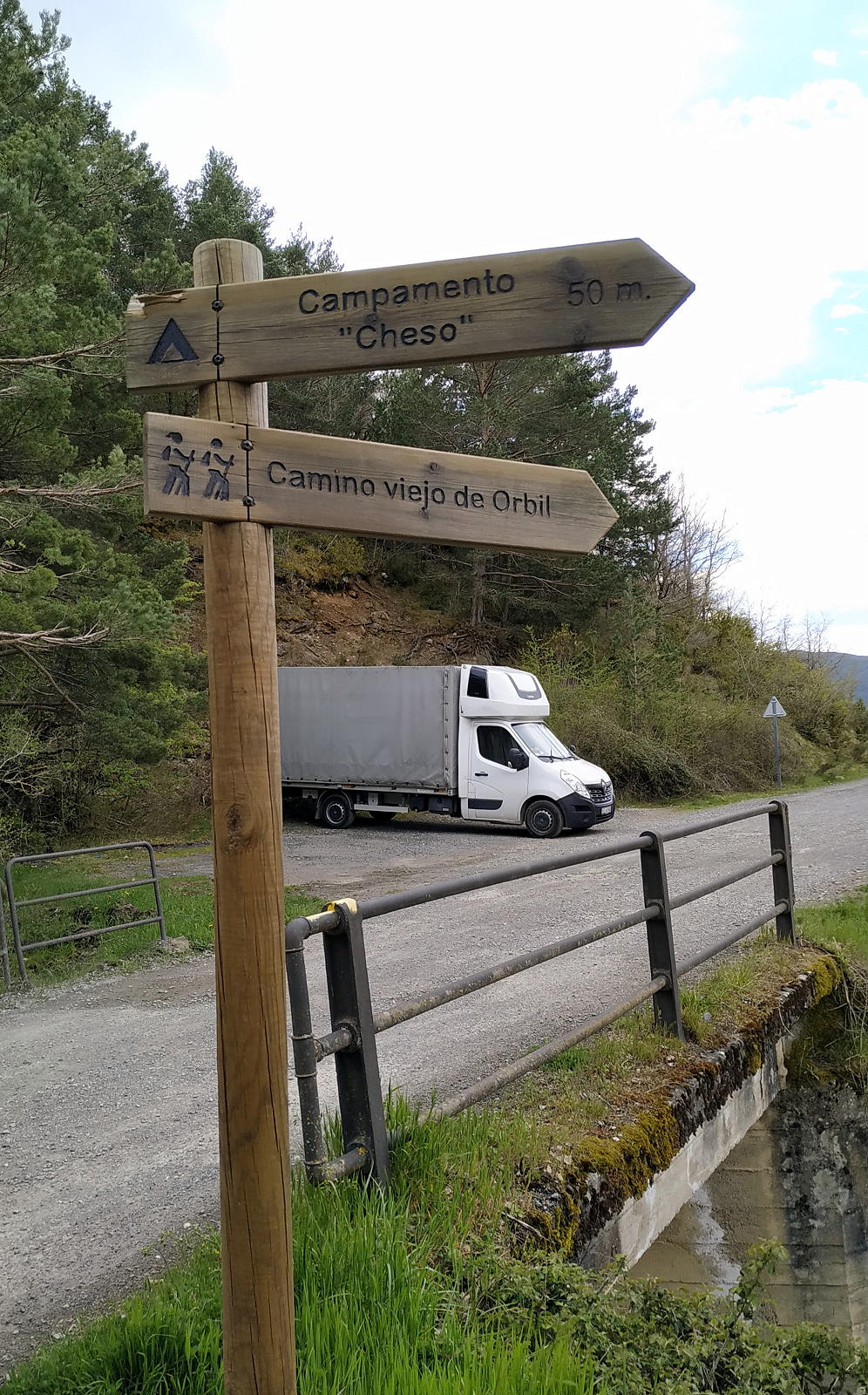 Cruzando las vías sigue el sendero. Tomamos una bifurcación a la izquierda (1115m 0h34′) y continuamos hasta encontrar una pista. A la izquierda está el dolmen (1135m 0h39′) pero, tras visitarlo, seguimos la pista a la derecha. Esta pista es el camino de Orbil. El camino desciende suavemente y da un brusco giro a la derecha, bajando de nuevo a la vía de tren. En este punto hay una bifurcación que, a la derecha, indica Villanúa. Si tomásemos esta dirección pasaríamos sobre el túnel del canfranero en uno de sus puntos más curiosos, ya que, para superar el desnivel, la vía dibuja un bucle completo. Pero nosotros tomamos el ramal de la izquierda, llegando a una casa particular junto a las vías (950m 1h27′), atravesamos la vía y seguimos por la izquierda de la casa; al ser una casa particular, su dueño no parece muy contento de que pasen senderistas, pero tampoco opone resistencia.