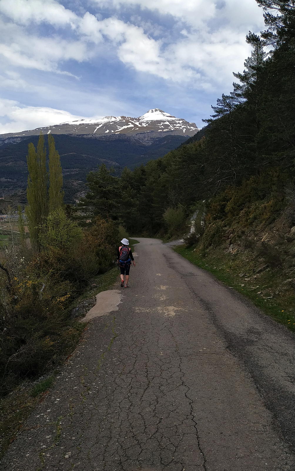 De ahí sale el camino viejo a Villanúa, que es un sendero muy majo. Cruza un arroyo, gira a la derecha y desemboca en la pista (955m 1h43′) que, asfaltada, nos lleva a Villanúa (940m 1h58′)
