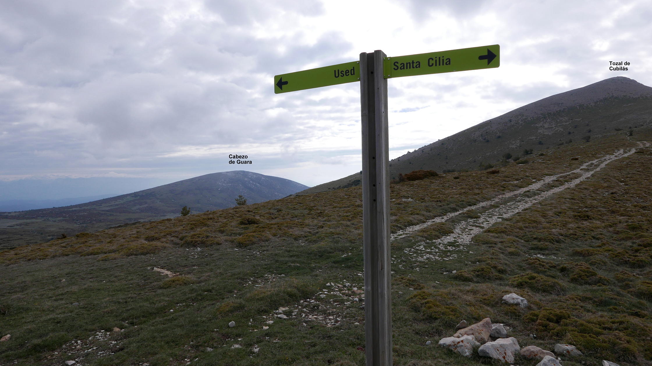 Con escasa señalización (algún hito y algún rastro de antigua pintura amarilla) pero sin pérdida, se pasa junto a unas curiosas balsas (1520m 1h06′) y dejo a la izquierda el acceso a una mesa informativa. Cerca ya del collado hay otra bifurcación; a la izquierda iría al Tozal de Guara, yo giro a la derecha por el camino de Used (1743m 1h26′), y se sube rápidamente al collado Cruceta de Cubilás (1805m 1h33′).